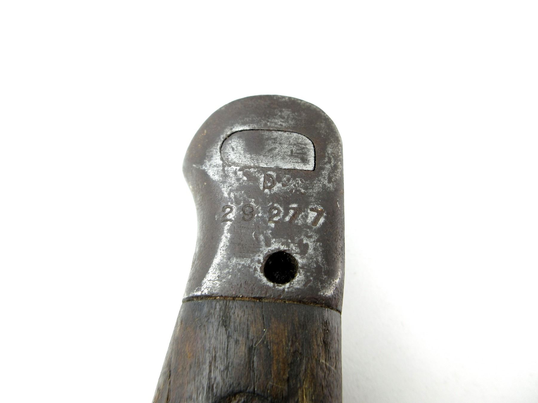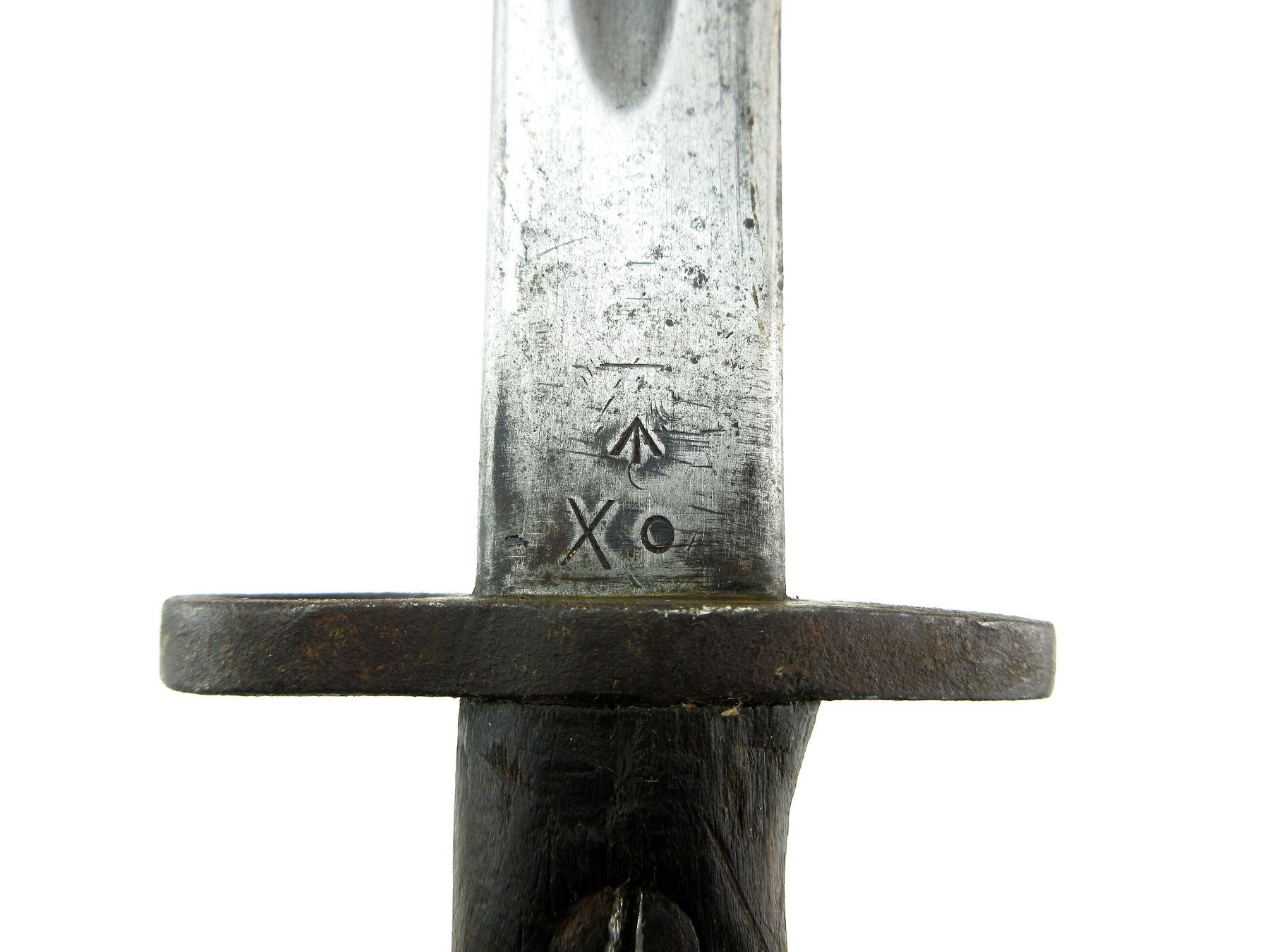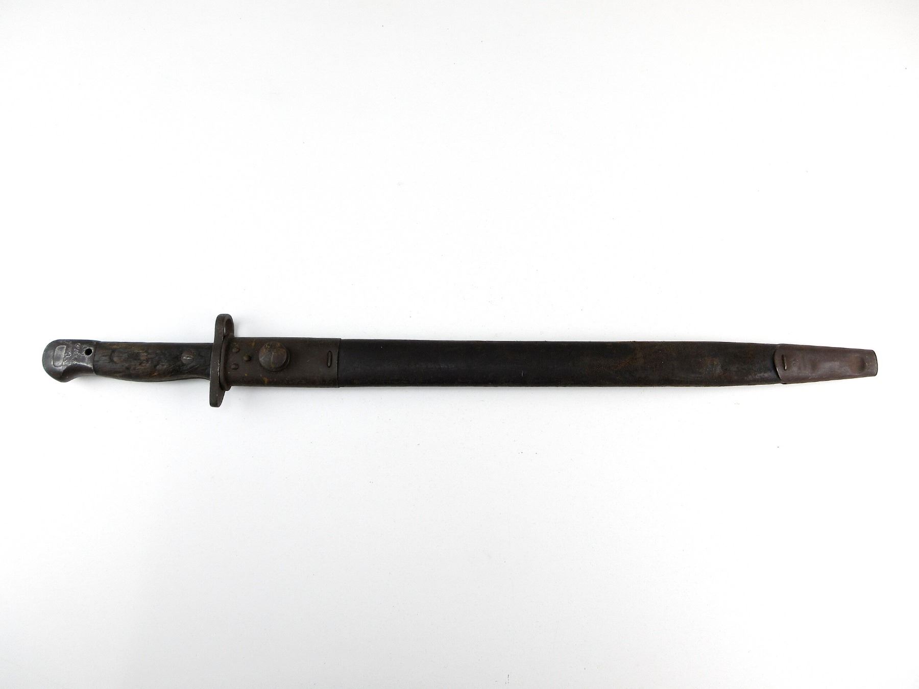 (1) FITS LEE ENFIELD NO.1 MKIII RIFLES, RICASSO MARKED: "MA" OVER "1907" OVER "1" OVER "6 '43", OTHER-SIDE MARKED: "X" (BEND TEST), "O", BROAD ARROW, 2-PIECE WOODEN GRIP, NO VISIBLE MARKINGS, SOME CHIPS IN GRIPS, METAL POMMEL, MARKED: "D" OVER "29 277", LEATHER & METAL SCABBARD, LEATHER MARKED: "MANGROVITE '44" & "B", METAL ENDS MARKED: "OA", BLADE APPROX. 16 7/8" & OAL APPROX. 21.75". SEE PHOTOS.