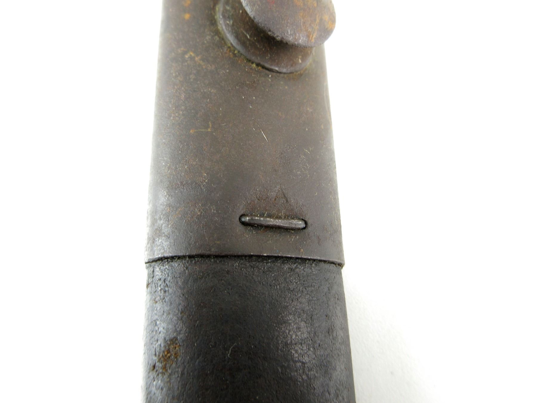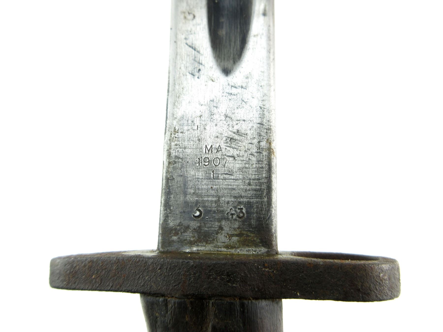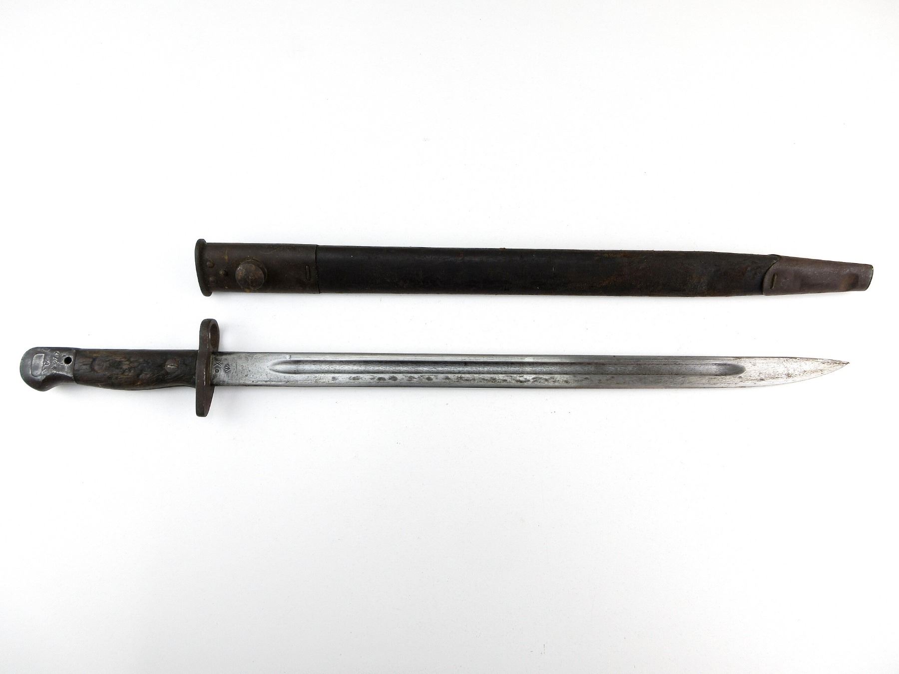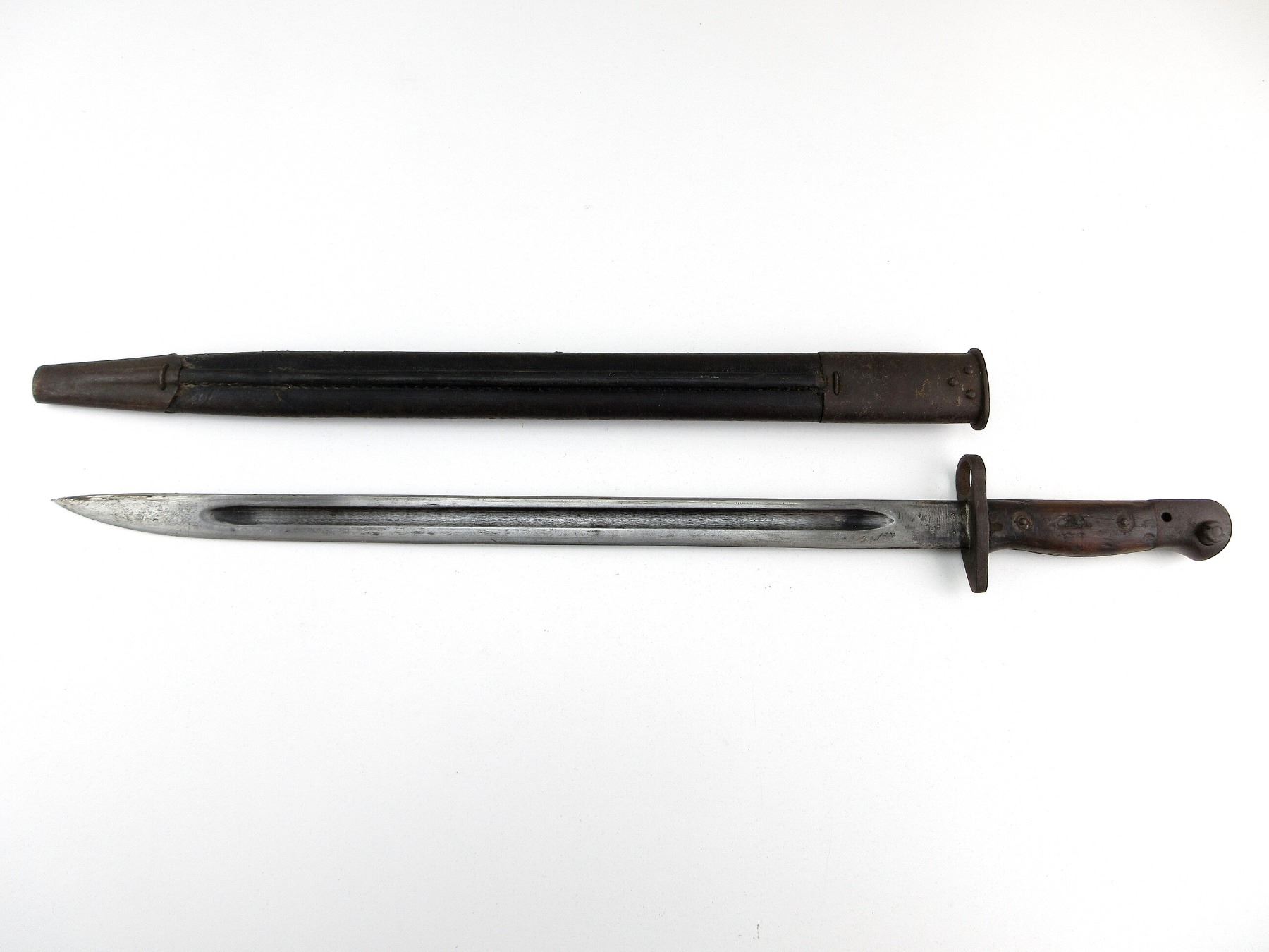 (1) FITS LEE ENFIELD NO.1 MKIII RIFLES, RICASSO MARKED: "MA" OVER "1907" OVER "1" OVER "6 '43", OTHER-SIDE MARKED: "X" (BEND TEST), "O", BROAD ARROW, 2-PIECE WOODEN GRIP, NO VISIBLE MARKINGS, SOME CHIPS IN GRIPS, METAL POMMEL, MARKED: "D" OVER "29 277", LEATHER & METAL SCABBARD, LEATHER MARKED: "MANGROVITE '44" & "B", METAL ENDS MARKED: "OA", BLADE APPROX. 16 7/8" & OAL APPROX. 21.75". SEE PHOTOS.