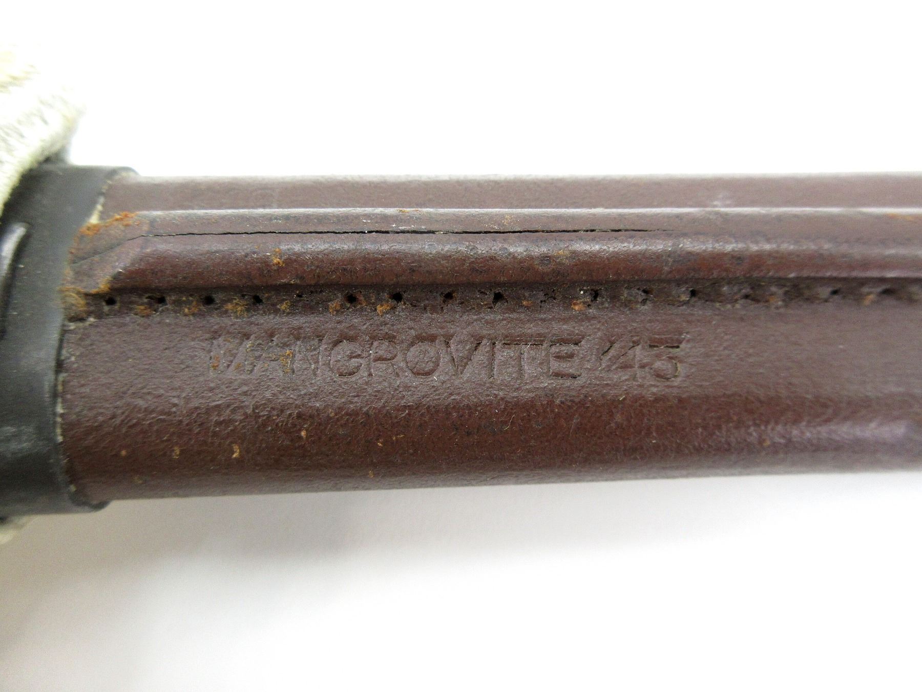 (1) FITS .303 CALIBER SHORT MAGAZINE LEE-ENFIELD NO.1 MKIII (SMLE) RIFLES, RICASSO MARKED: "MA" OVER "1907" OVER "1 '4?" OVER "4", OTHER-SIDE MARKED: "X (BEND TEST)", BROAD ARROW, "OA", NO QUILLON, 2-PIECE WOODEN GRIPS, ONE-SIDE MARKED: "AUSTRA??A" STAMPED OVER "SLAZ 42", OTHER-SIDE MARKED: "SLAZ 42" METAL POMMEL MARKED: "D" OVER "48913", LEATHER & METAL SCABBARD WITH WHITE PAINTED CANVAS FROG, LEATHER MARKED: "MANGROVITE '43", BROAD ARROW OVER "B", METAL TIP MARKED: "OA", FAINT HAND-WRITTEN MARKINGS ON FROG, BLADE APPROX. 16 7/8" & OAL APPROX. 21.75". SEE PHOTOS.