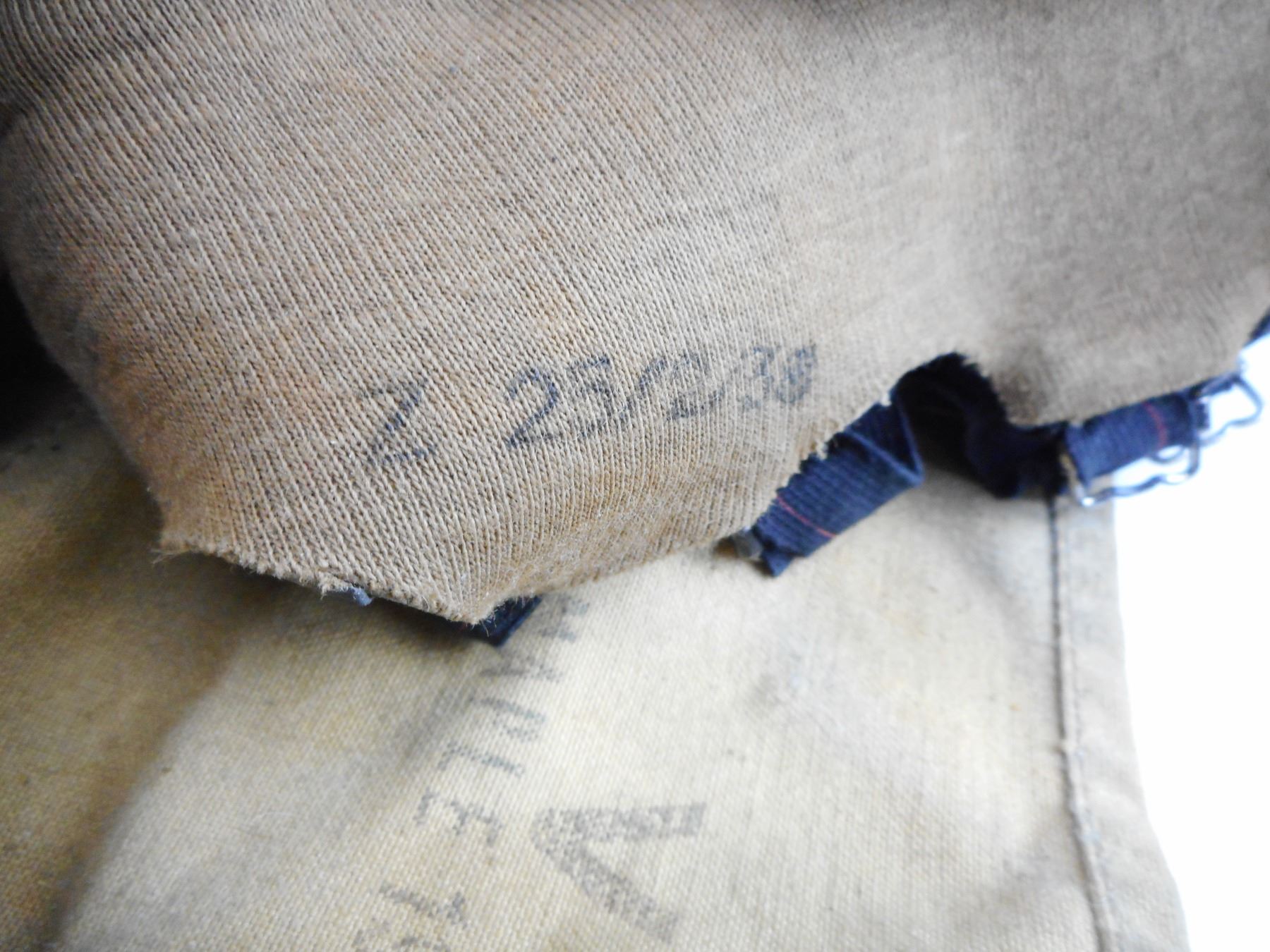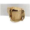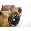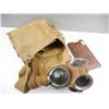 WWII BRITISH MKV GAS MASK LOT , 1- BROWN CANVAS BAG MARKED "V MAPLE 1938". 1- MASK DATED 38, WITH BROAD ARROW. 1- MKV, ANTI DIMMING TIN, DATED 38. 1- PACK OF MKIII EYE SHIELDS.
