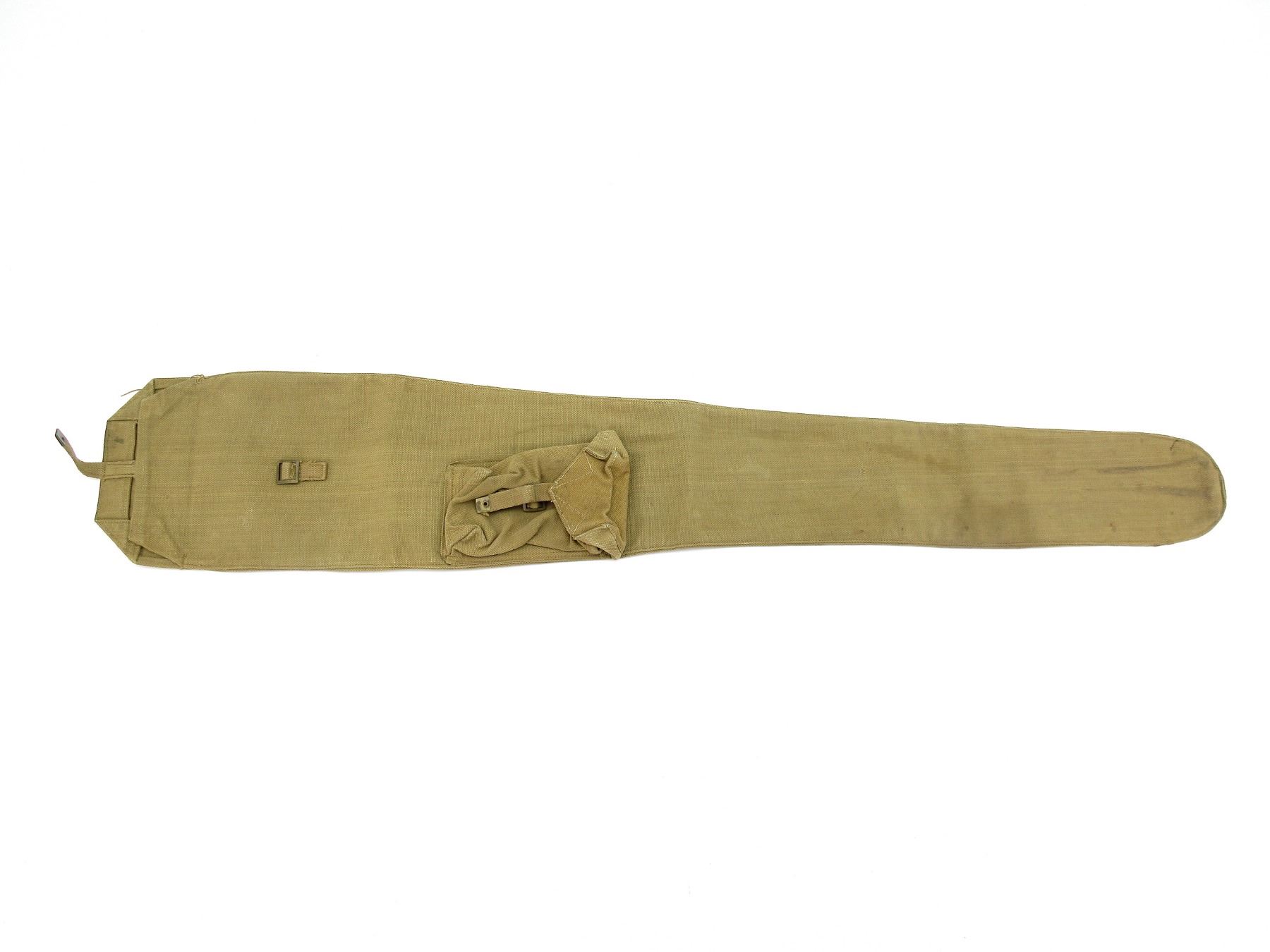 (1) FITS LEE ENFIELD RIFLES, TAN P37 WEB CANVAS RIFLE CASE WITH BRASS FITTINGS, MARKED: "J. & A. H. 1942" & VARIOUS OTHER HAND-WRITTEN MARKINGS, SOME STAINING & OAL APPROX. 51.25". SEE PHOTOS.