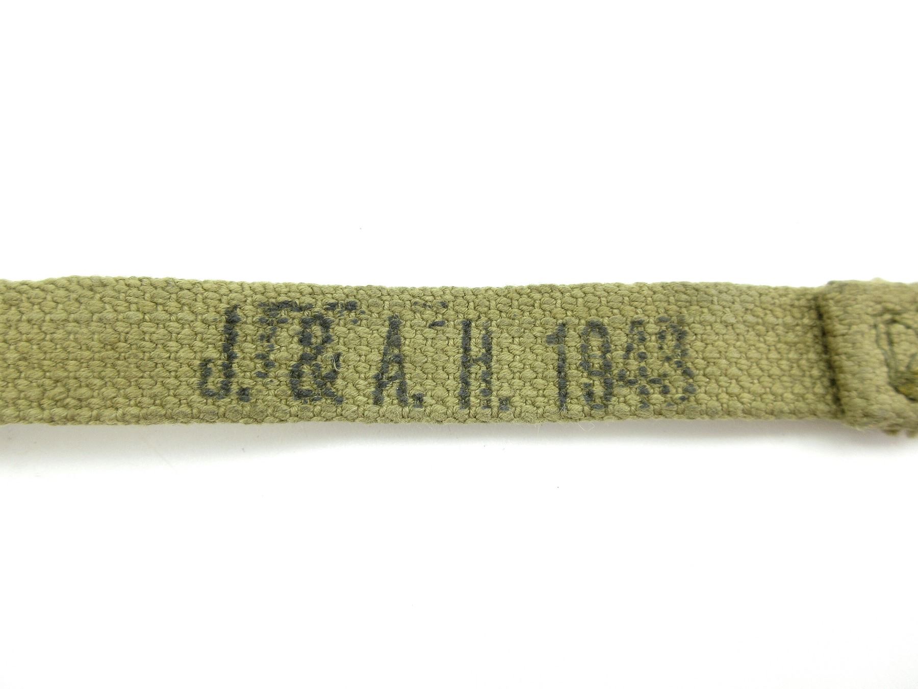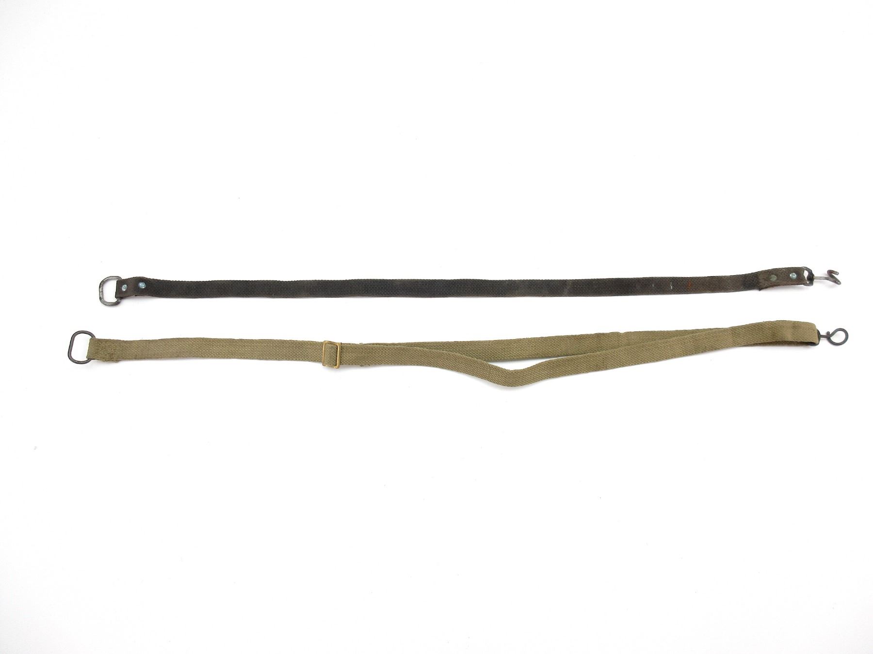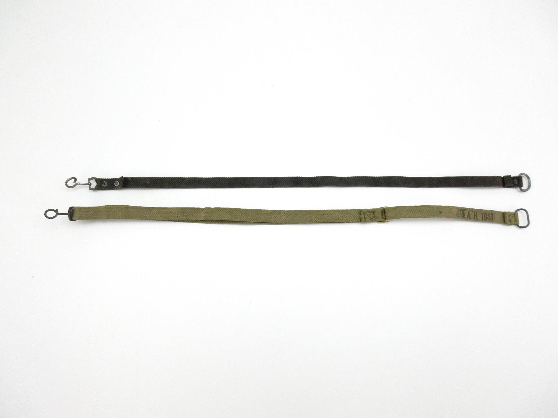 LOT INCLUDES; (2) TAN / BLACKENED P37 WEB CANVAS SLINGS WITH STEEL / BRASS FITTINGS, ONE MARKED: "J. & A. H. 1943", OTHER HAS NO VISIBLE MARKINGS, ONE IS ADJUSTABLE, OALS APPROX. 31" & 32". SEE PHOTOS.