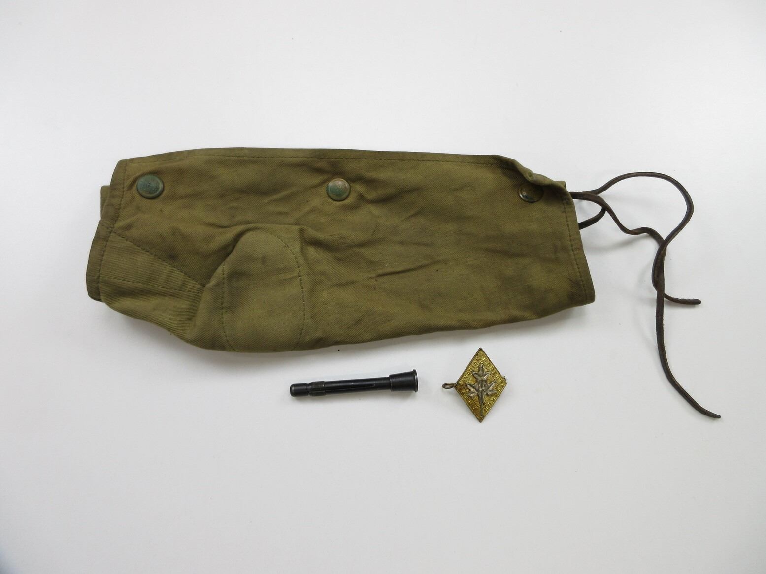 WWII CANADIAN .303 BR RUPTURED CASE EXTRACTOR, ETC. LOT. LOT INCLUDES; (1) FITS .303 BR NO.1 RIFLES / BRENS / VICKERS / MG'S / ETC., RUPTURED CASE EXTRACTOR, BLUED STEEL, MARKED: "C.A.S.", OAL APPROX. 2.7/8", (1) TAN CANVAS ACTION COVER WITH LEATHER THONG, NO VISIBLE MARKINGS & (1) CANADIAN WOMEN'S ARMY CORPS CAP BADGE. SEE PHOTOS.