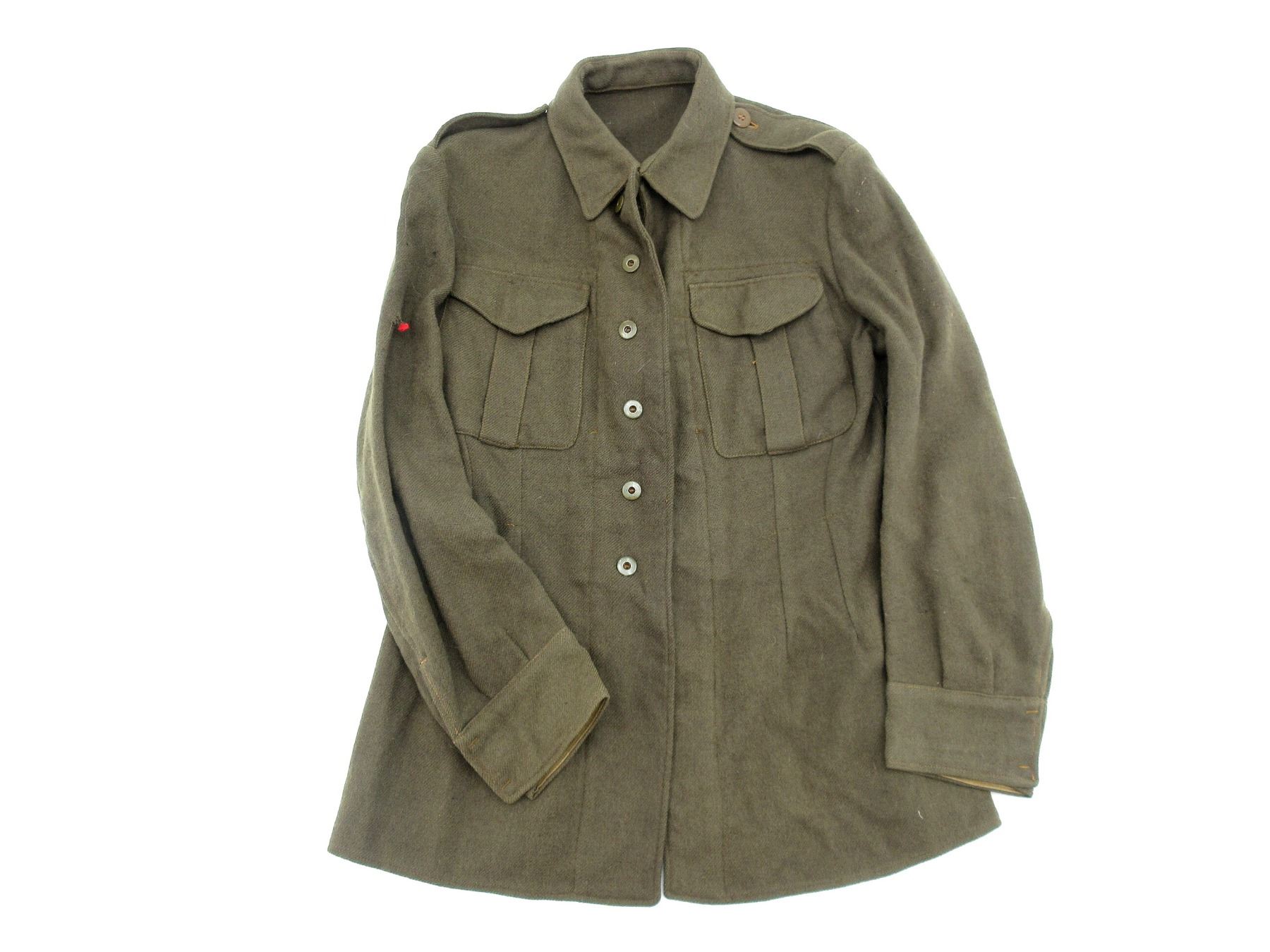 (1) GREEN WOOL JACKET MARKED: "JACKETS, ARMY CADETS, SIZE NO. 12, HEIGHT-5'6" TO 5'7", BREAST-36" TO 37", S. & G. CLOTHING CO. LTD., 1943", "R" & C-BROAD ARROW, CLOSED-COLLAR, BUTTON-FRONT, SLIGHT TEAR ON RIGHT SLEEVE. SEE PHOTOS.