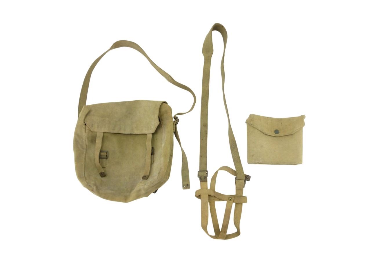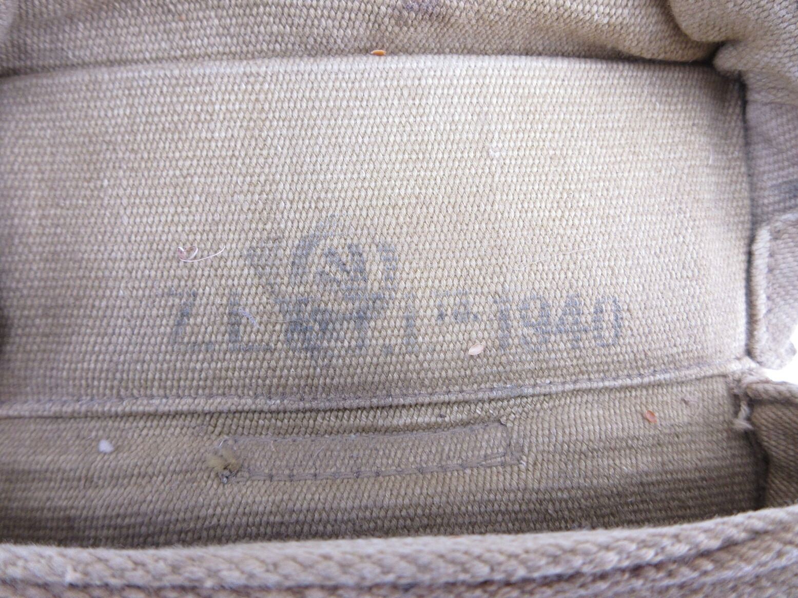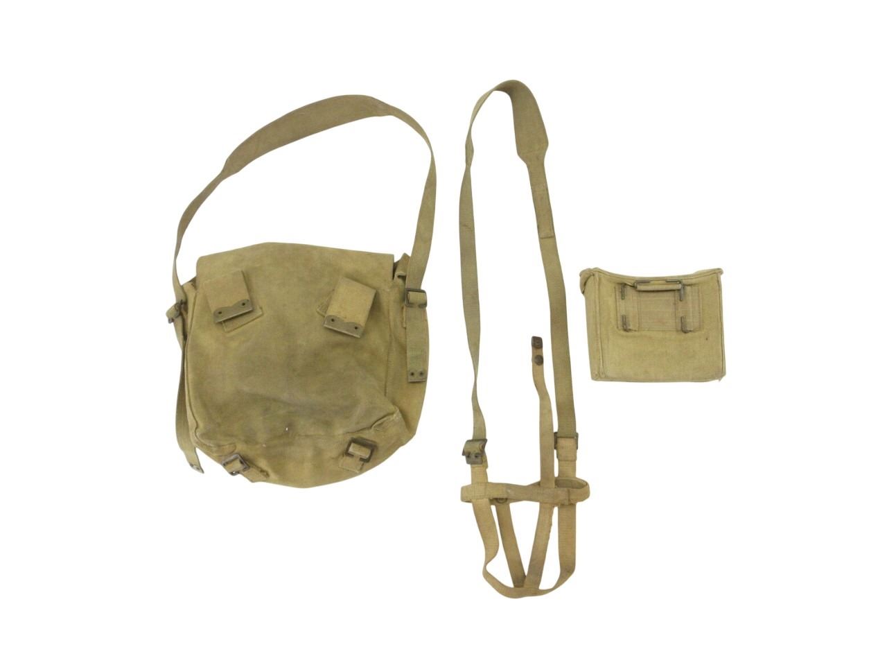 WWII CANADIAN / BRITISH MILITARY P37 WEBBING LOT. LOT INCLUDES; (1) TAN P37 WEB CANVAS BINOCULAR CASE (NO BINOCULARS), MARKED: "Z.L&T.LTD 1940" WITH C-BROAD ARROW, METAL BELT HOOKS, SNAP CLOSURE, (1) TAN P37 WEB CANVAS CANTEEN CARRIER, NO VISIBLE MARKINGS, STEEL & BRASS FITTINGS, SHOWS AGE / TEAR, SNAP MARKED: "UNITED-CARR, CANADA" & (1) TAN P37 WEB CANVAS SMALL / MEDIUM PACK WITH SHOULDER STRAP, FAINT / UN-CLEAR MARKING & "1942" DATED ON FLAP, BRASS FITTINGS & OAL APPROX. 9". SEE PHOTOS.