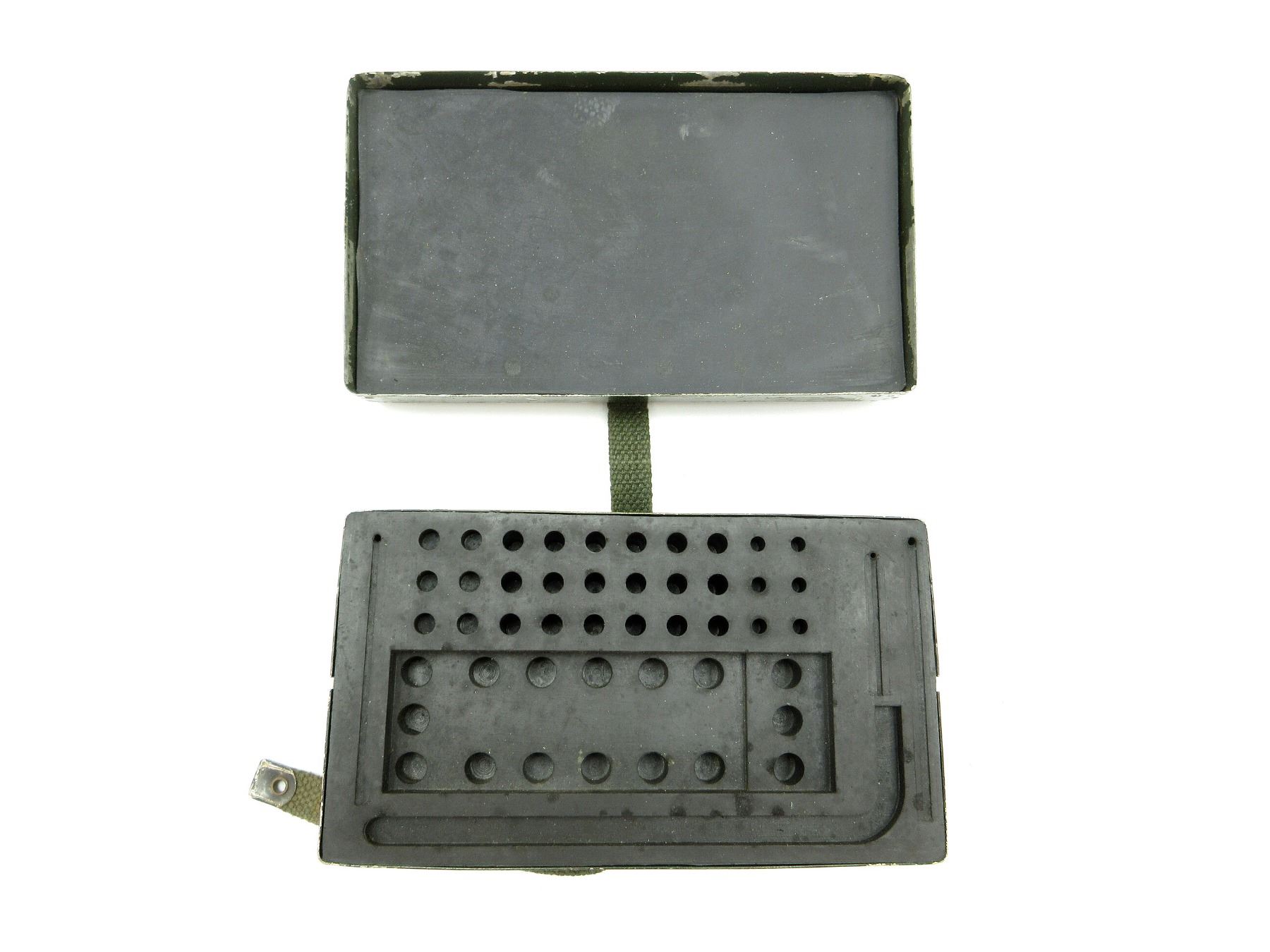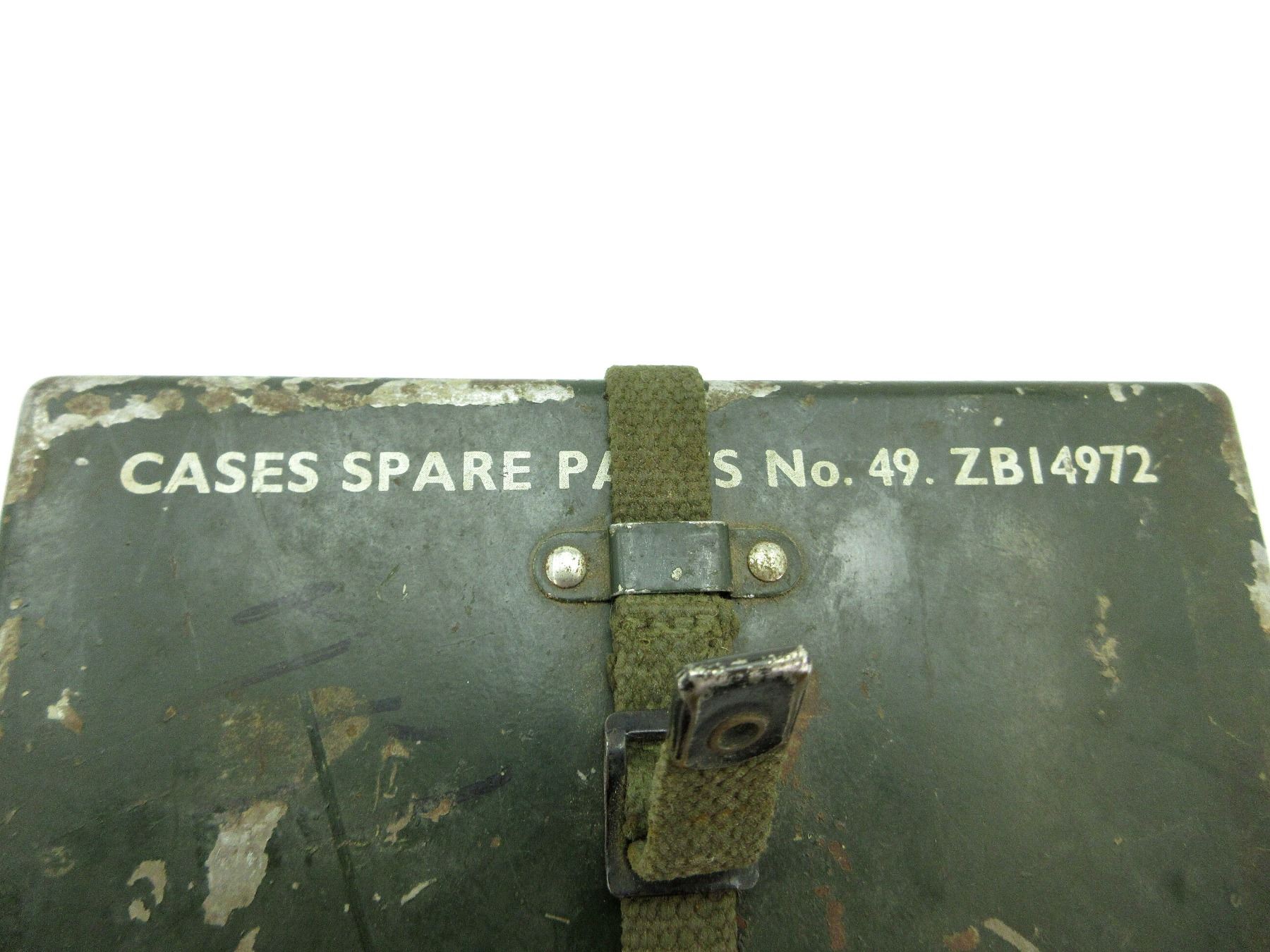(1) GREEN PAINTED METAL TIN, MARKED: "CASES SPARE PARTS NO. 49. ZB14972" ETC., RUBBER BLOCKS INSIDE WITH CUTOUTS FOR VARIOUS BULBS, FUSES & ALLEN KEYS, TIN HAS NO SPARE PARTS, FOR REPAIRS ON MILITARY RADIO EQUIPMENT, CANVAS STRAP FOR CLOSURE & APPROX. 7.25" X 4.25" X 1.75". SEE PHOTOS.