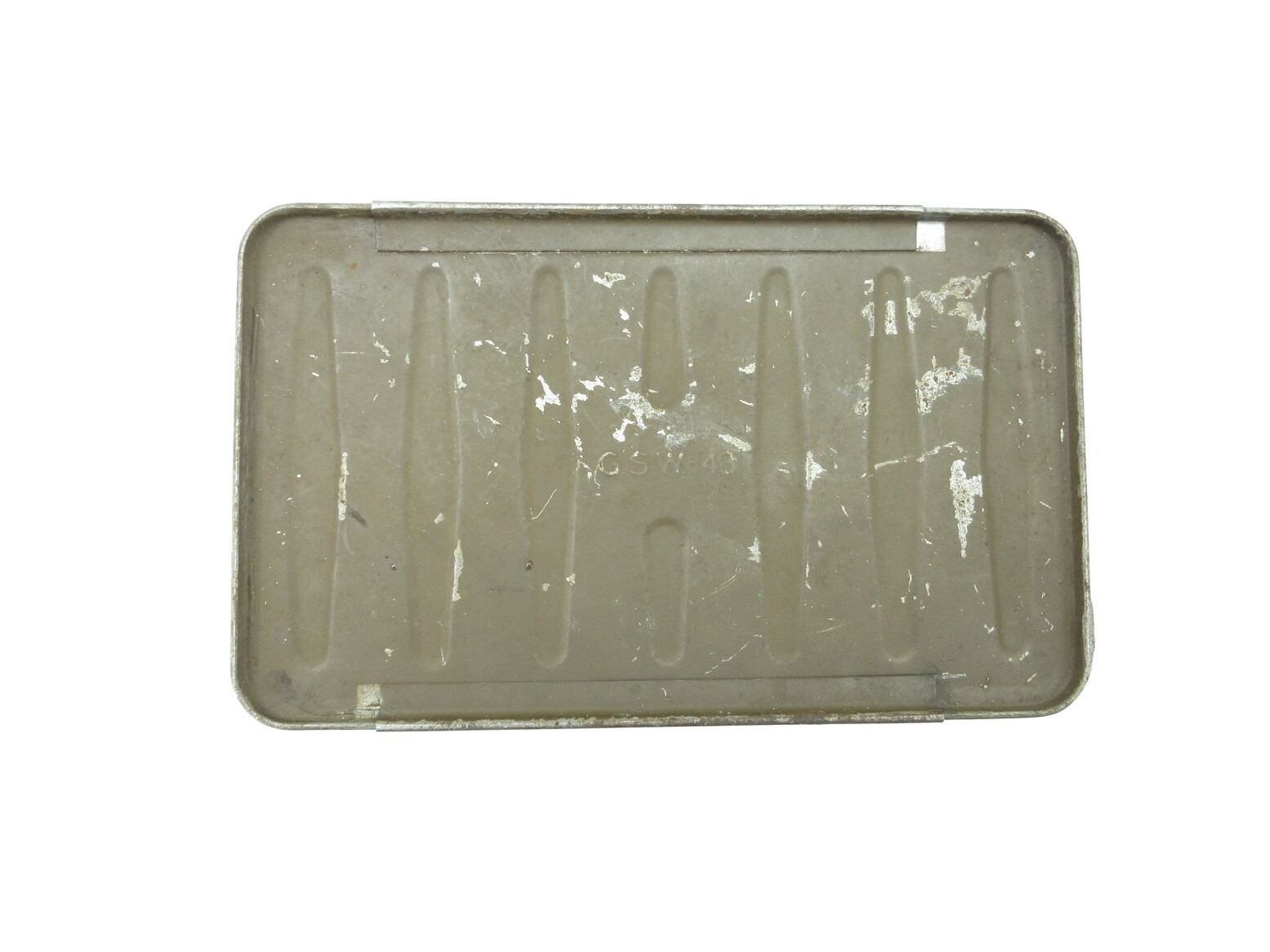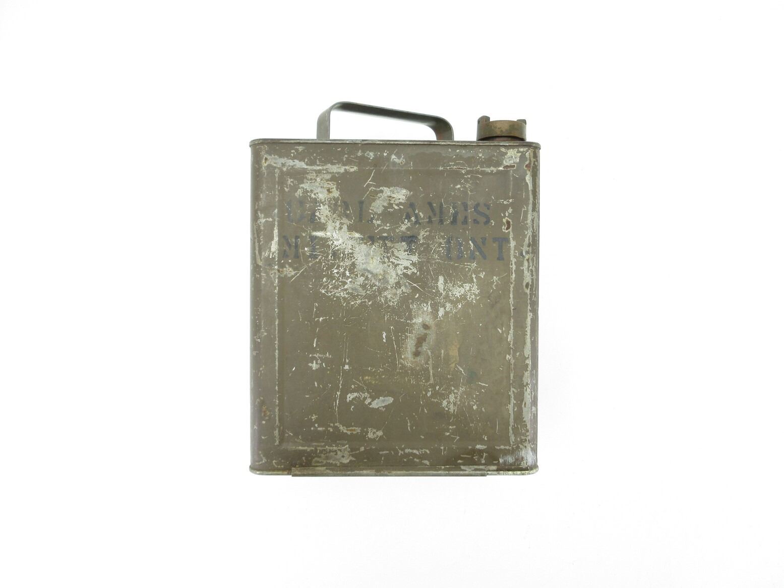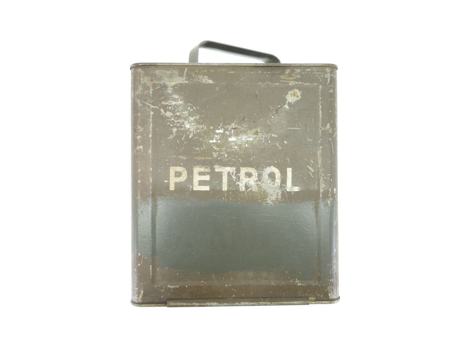 WWII CANADIAN MILITARY GAS CAN. (1) GREEN PAINTED STEEL GAS CAN WITH SCREW ON LID, MARKED: "1943" WITH C-BROAD ARROW, "G.S.W. 43" & "PETROL", VARIOUS OTHER MARKINGS, SOME RUST & APPROX. 9 7/8" X 6" X 13". SEE PHOTOS.