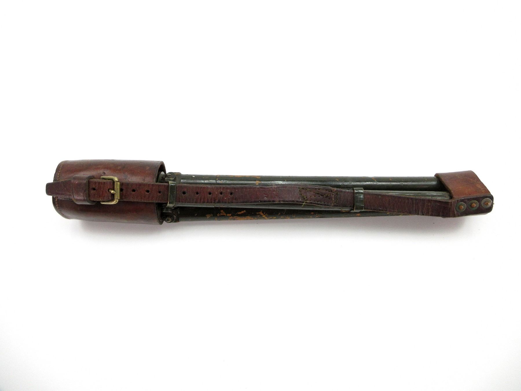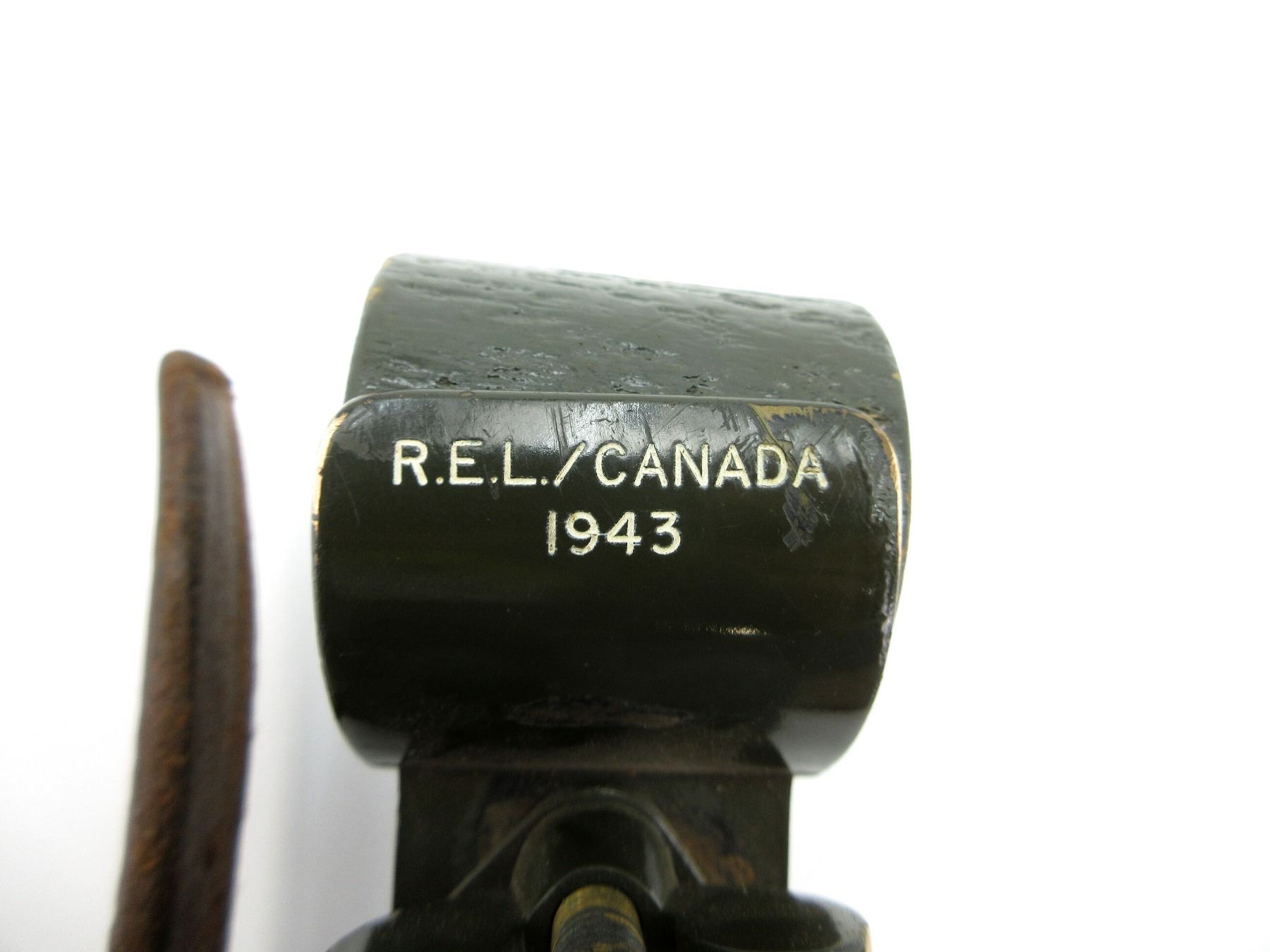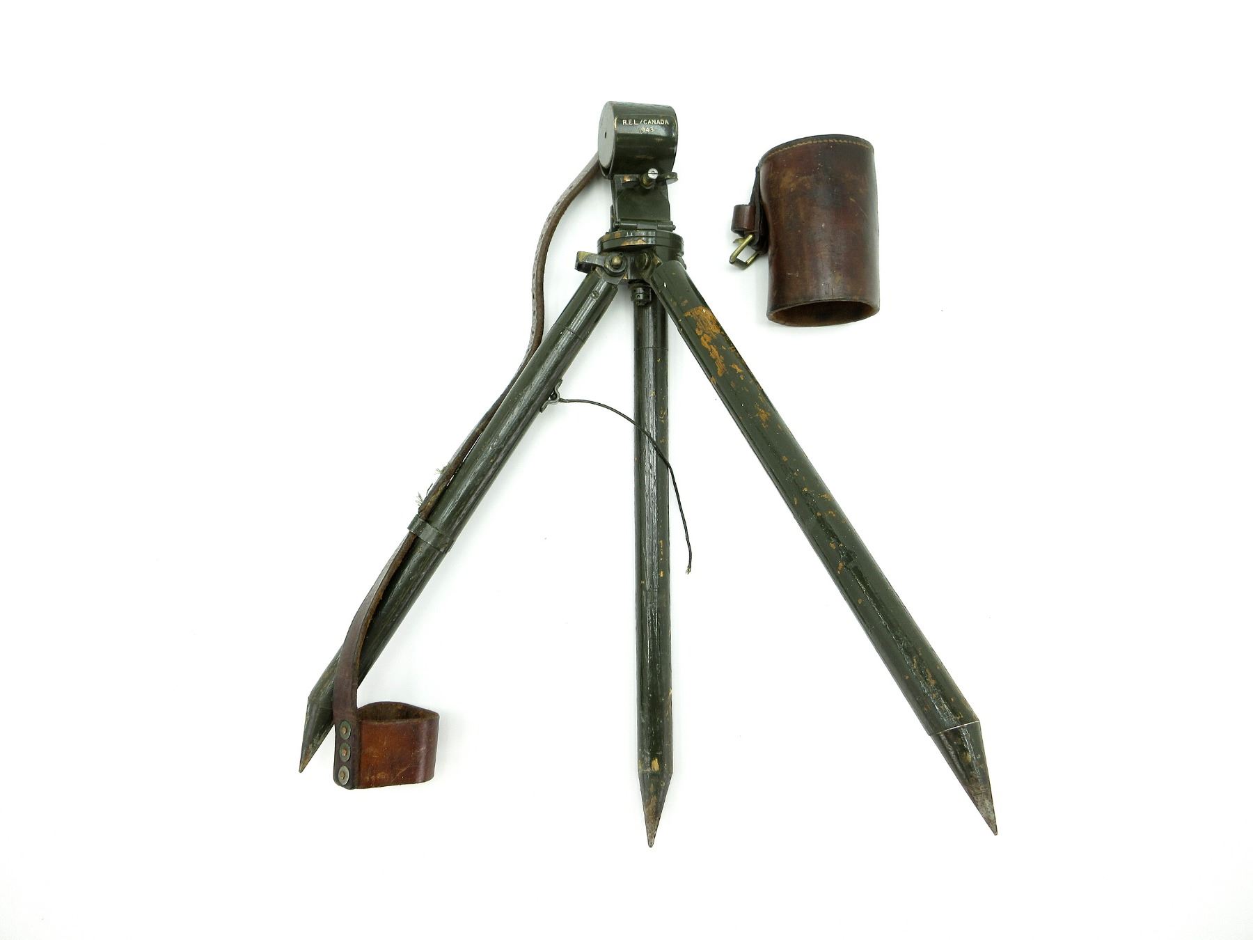 (1) GREEN PAINTED BRASS CLAMP WITH WOOD LEGS & LEATHER COVER, LEGS UNFOLD PROPERLY, CLAMP MARKED: "TRIPOD TELESCOPE, NO.21 MK 5, (C1A1)", OTHER-SIDE MARKED: "R.E.L. / CANADA, 1943", NO VISIBLE MARKINGS ON LEATHER COVER, OAL APPROX. 18" (FOLDED). SEE PHOTOS.