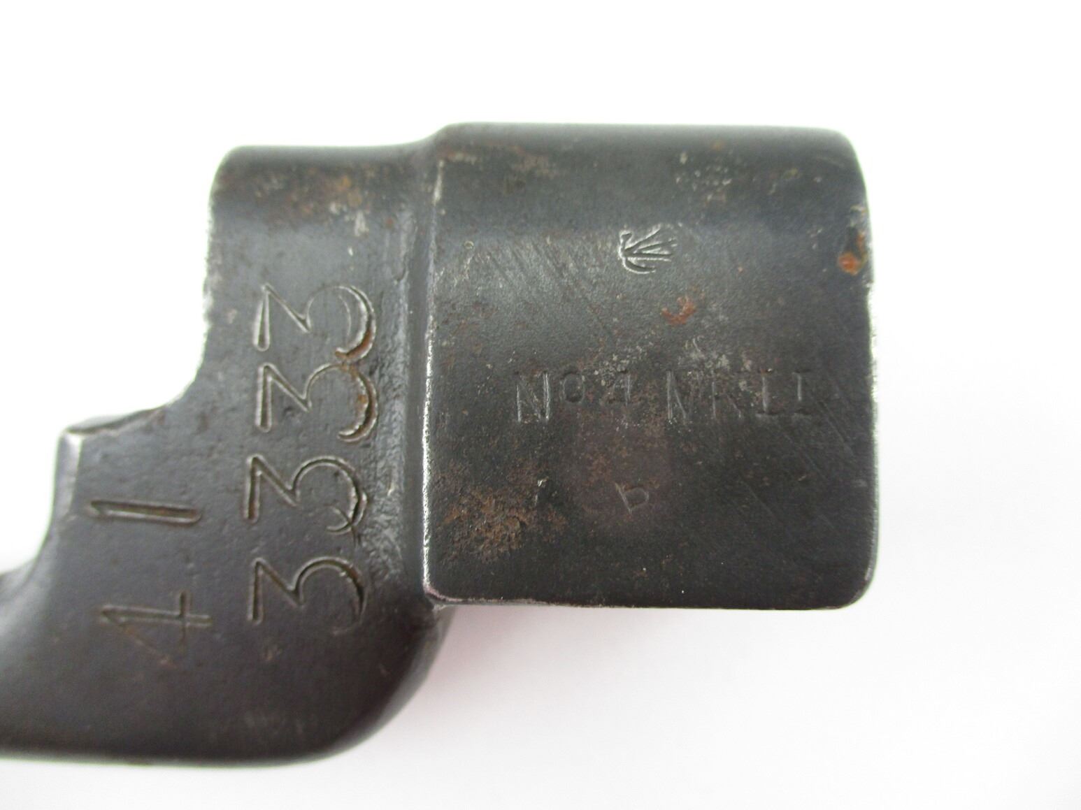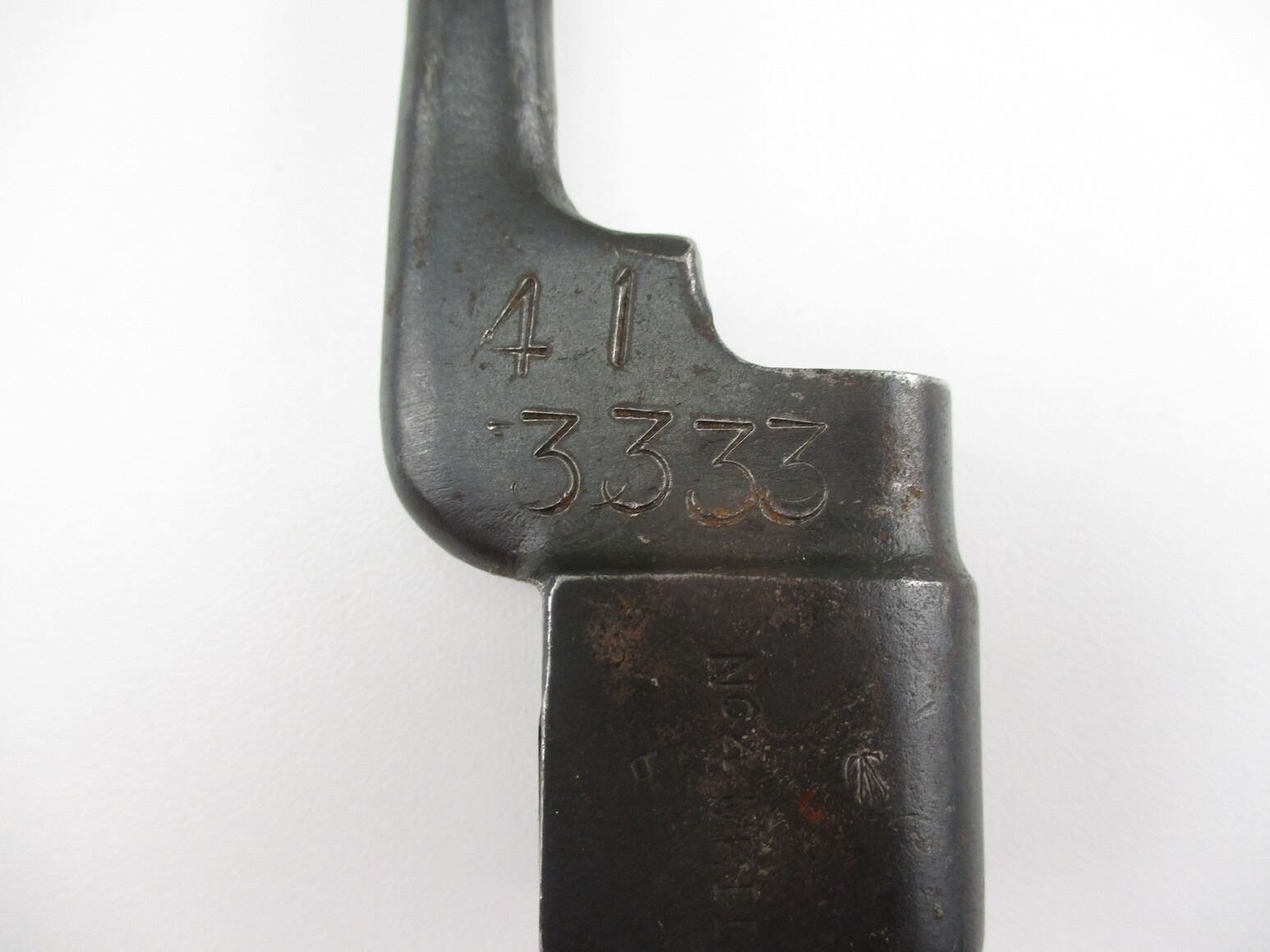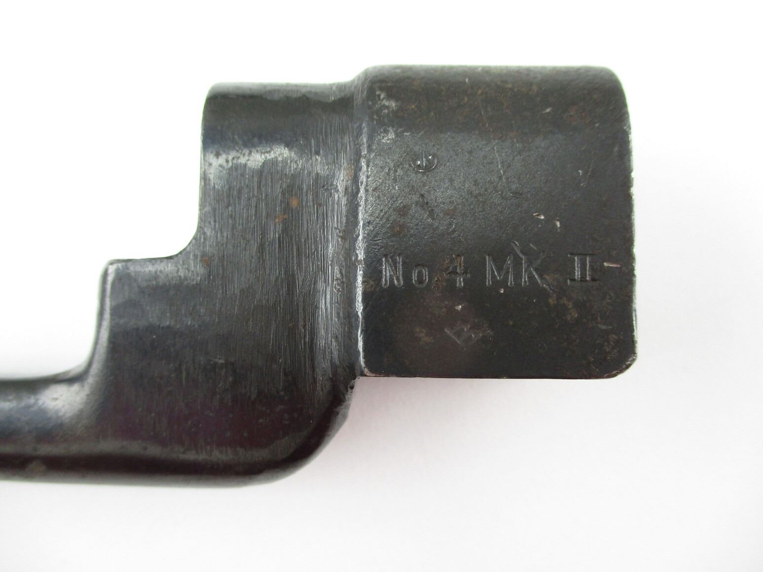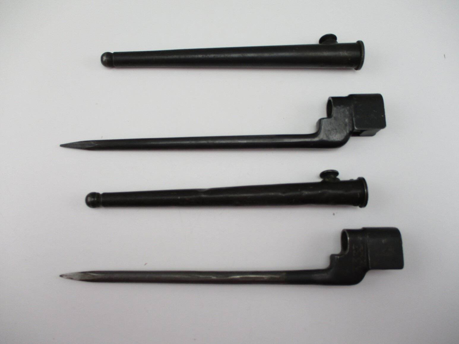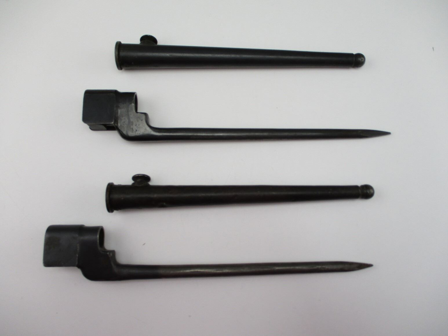 WWII CANADIAN NO4 MKII SPIKE BAYONETS , (2) FOR USE WITH CALIBER .303 LEE ENFIELD NO4 RIFLE. 1 MARKED C-BROAD ARROW, NO4 MKII OVER SUPERIMPOSED "LB", 41 3333. 1 MARKED PARTIAL C-BROAD ARROW, NO4 MK II OVER SUPERIMPOSED "LB". BOTH COME WITH METAL SCABBARD. APPROXIMATELY 8" BLADE, 10" OVERALL LENGTH.