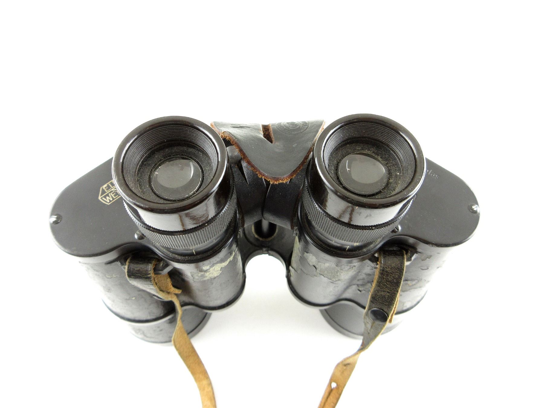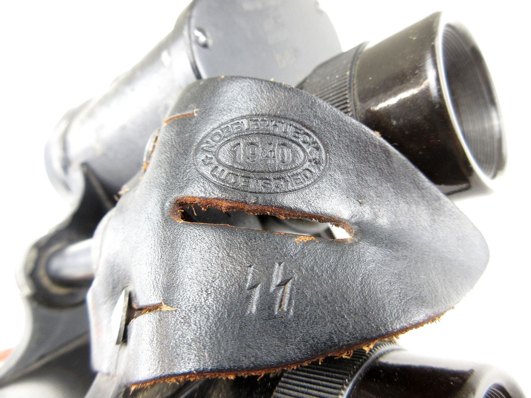 (1) SET OF BINOCULARS, SLIGHT DUST / BLACK SPOTS ON RIGHT LENSE OTHER-WISE CLEAR, DIALS TURN, BINOCULARS MARKED: "E.LEITZ, WETZLAR" & "DIENSTGLAS, 7X50, 477531, BEH, +", LEATHER NECK STRAP, NO VISIBLE MARKINGS, LEATHER TAB MARKED: "SS" & "NOBELE&HUECK, 1940, LUDENSCHEID". SEE PHOTOS.