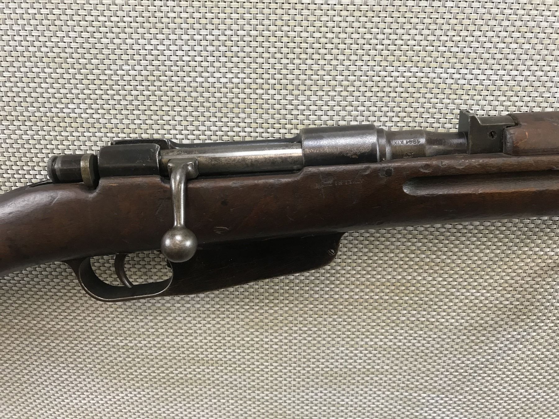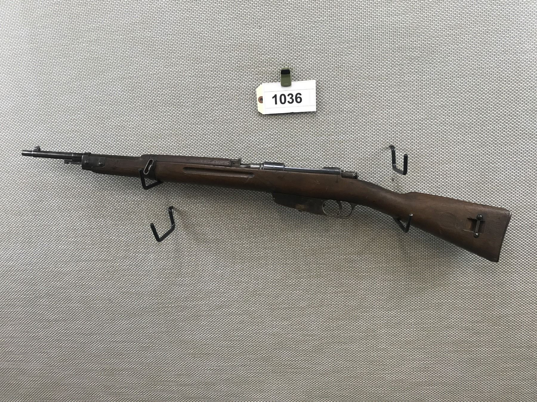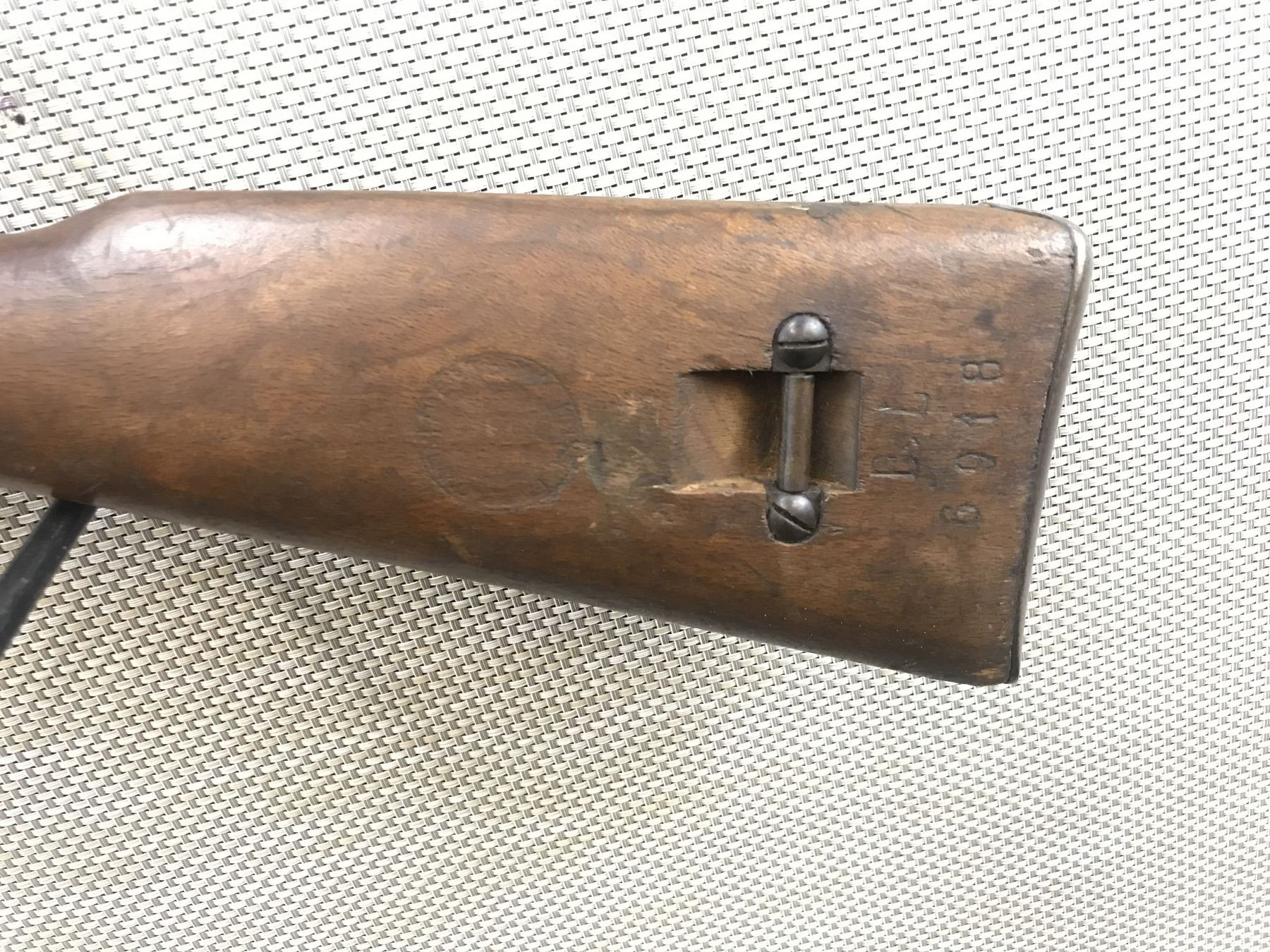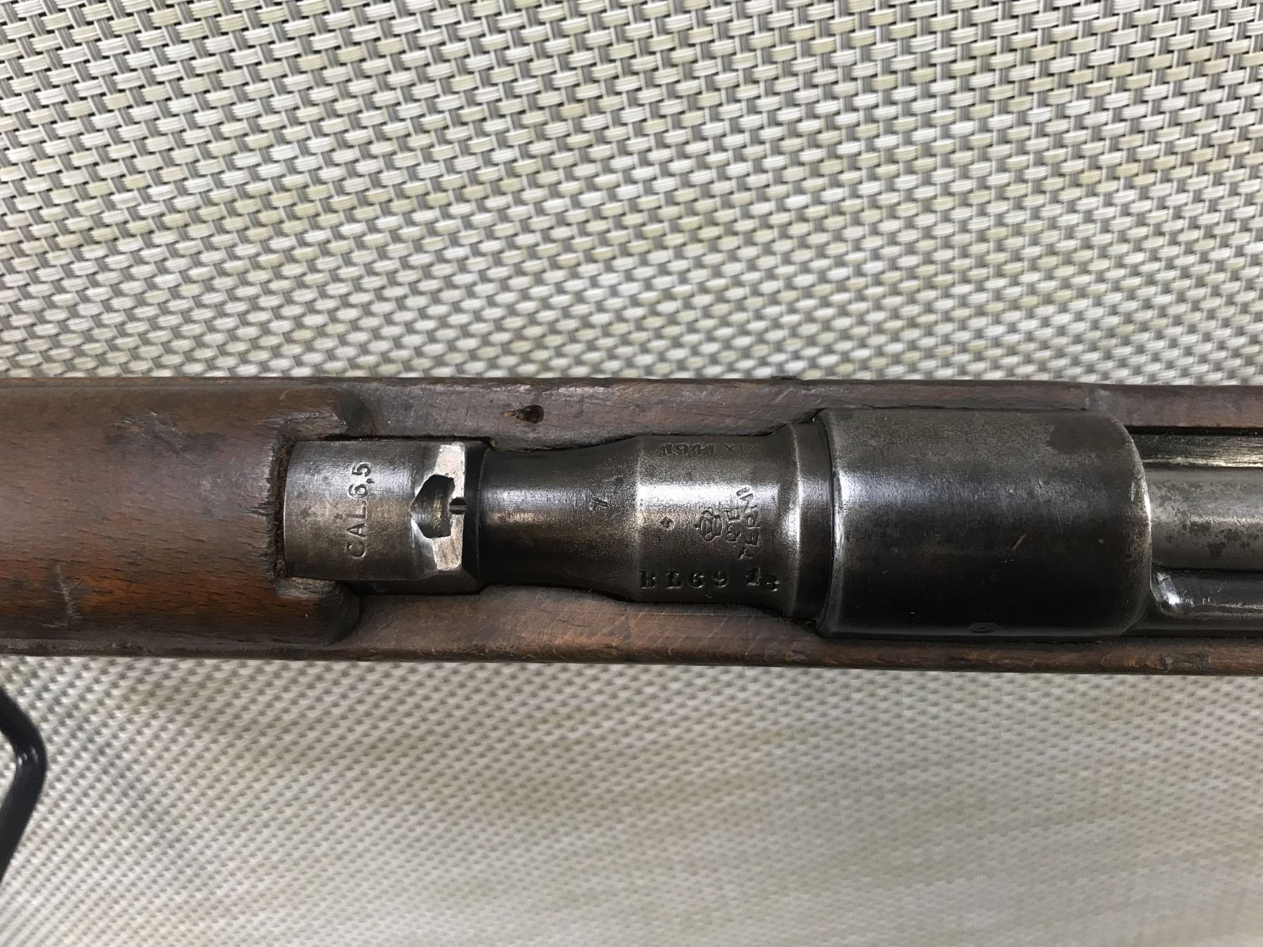 WWII ERA, MANNLICHER CARCANO , MODEL: 1938 CAVALRY CARBINE , CALIBER: 6.5 X 52 ITALIAN , GOOD BORE, DATED 1941, EXTENSIVE MILITARY MARKS, BLADE FRONT AND RAISED NOTCH REAR SIGHT, SHOWS SOME HANDLING MARKS, STEEL BUTT PLATE , BARREL LENGTH: 21 1/2" , SERIAL # BL6918 , STOCK # 8405 , CONDITION: 6/10 , CLASS: CANADIAN NON RESTRICTED CLASS