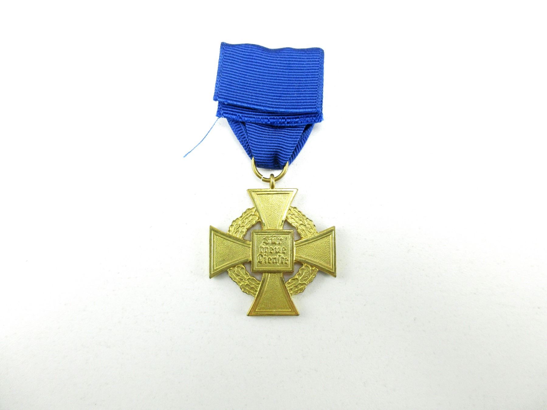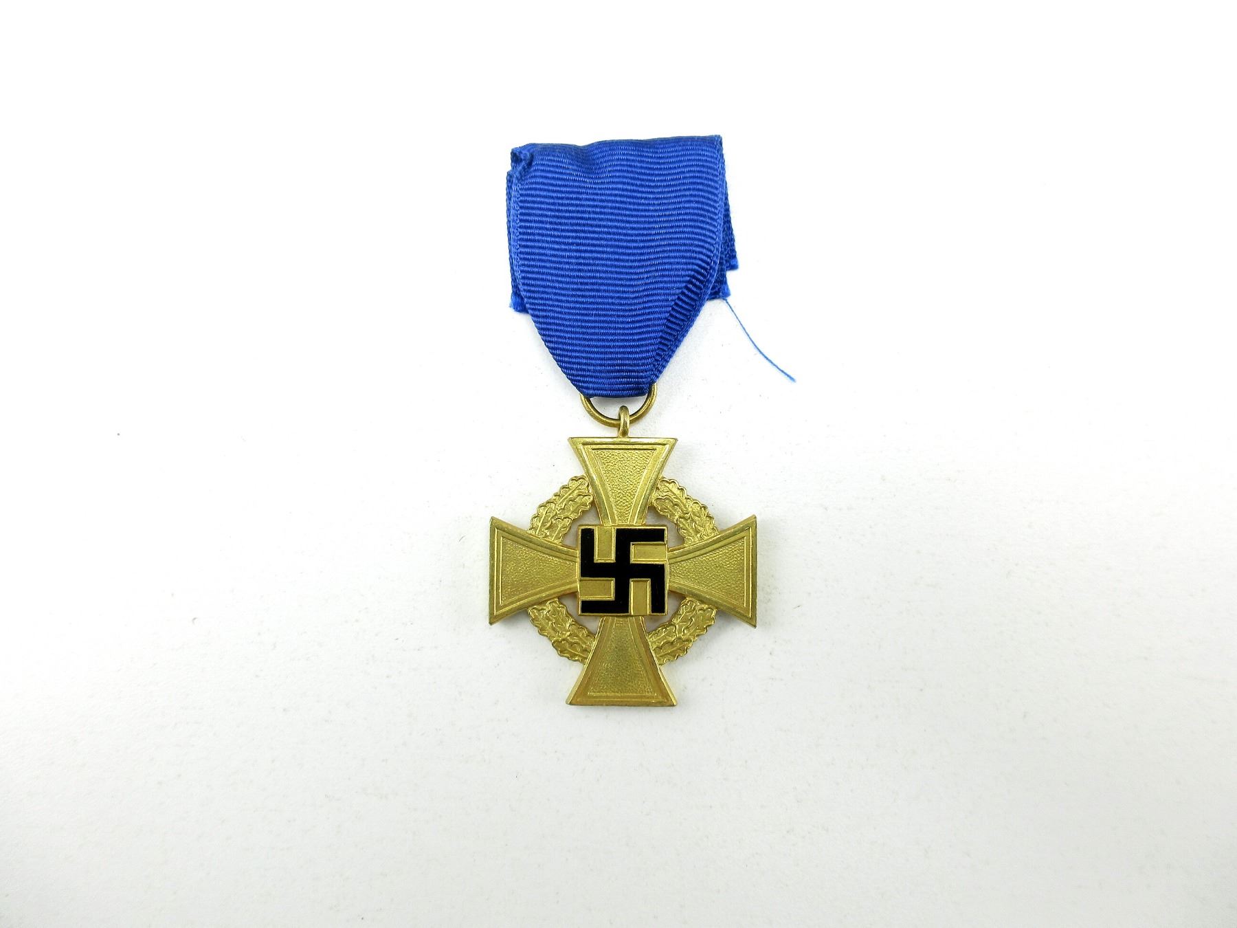 (1) 25 YEAR NATIONAL FAITHFUL SERVICE MEDAL WITH RIBBON, MARKED: "FUR TREUE DIENSTEGOLD TONED WITH CROSS, WREATH & SWASTIKA IN THE CENTER, NO VISIBLE MARKINGS ON RIBBON RING, RIBBON DOES NOT APPEAR TO GLOW UNDER BLACK LIGHT. SEE PHOTOS.
