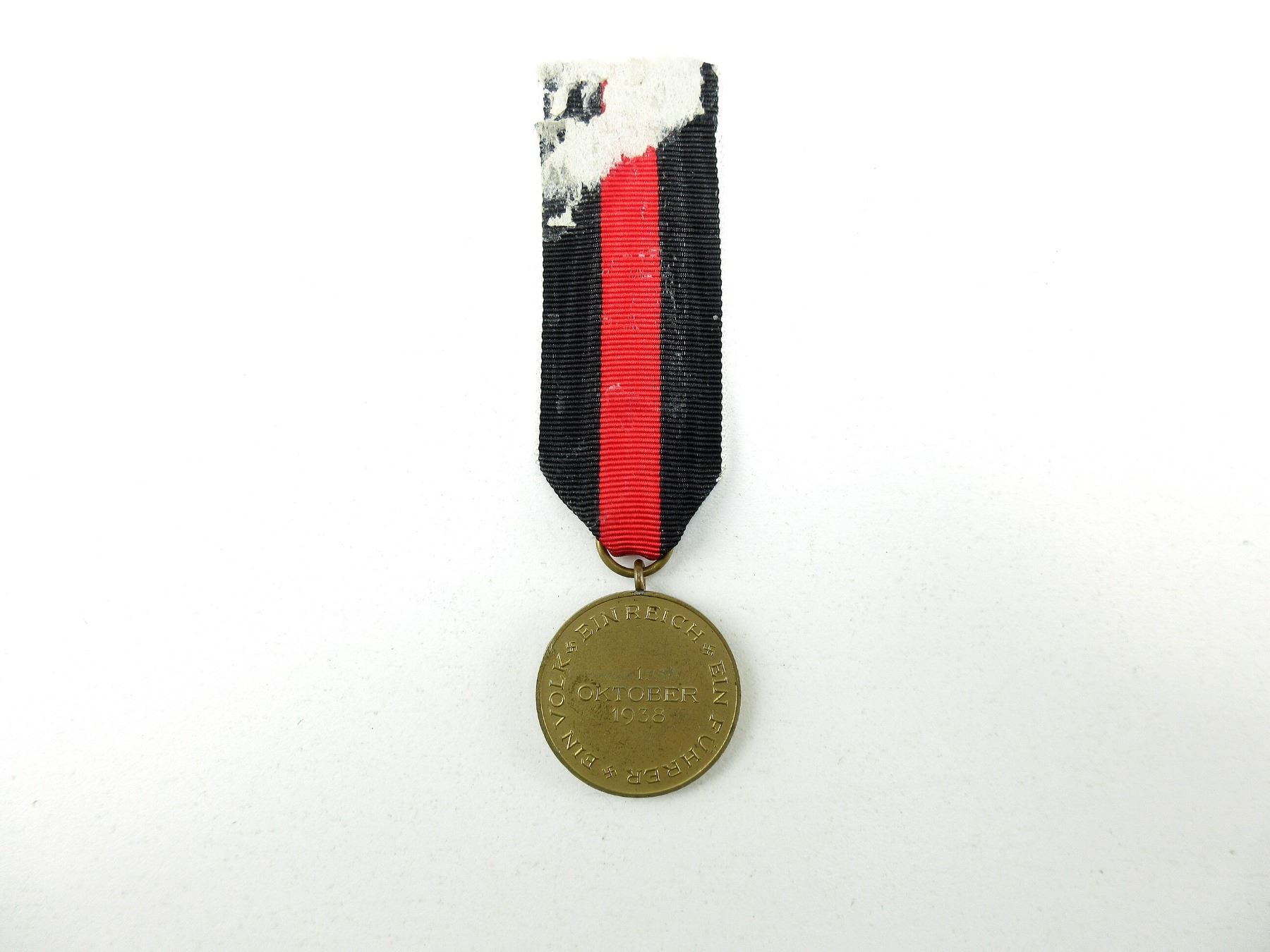 (1) ANNEXATION OF CZECHOSLOVAKIA MEDAL WITH RIBBON, MARKED: "EIN VOLK EIN REICH EIN FUHRER, 1, OKTOBER, 1938", BRONZE TONED ALLOY MEDAL, NO VISIBLE MARKINGS ON RIBBON RING, RIBBON GLOWS UNDER BLACK LIGHT (WHITE PORTION). SEE PHOTOS.