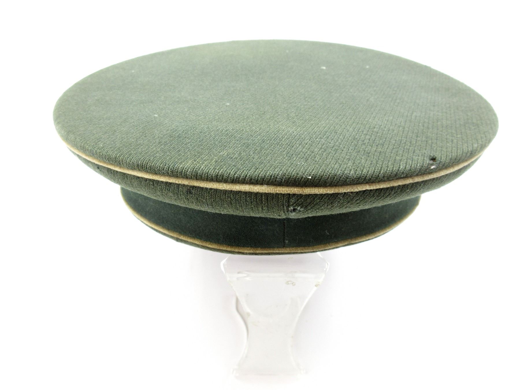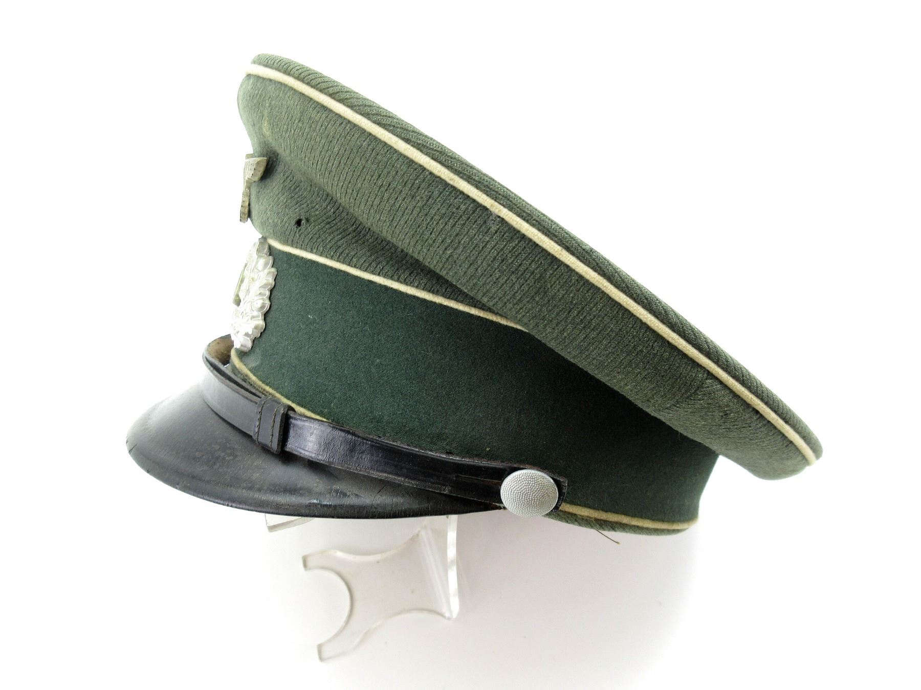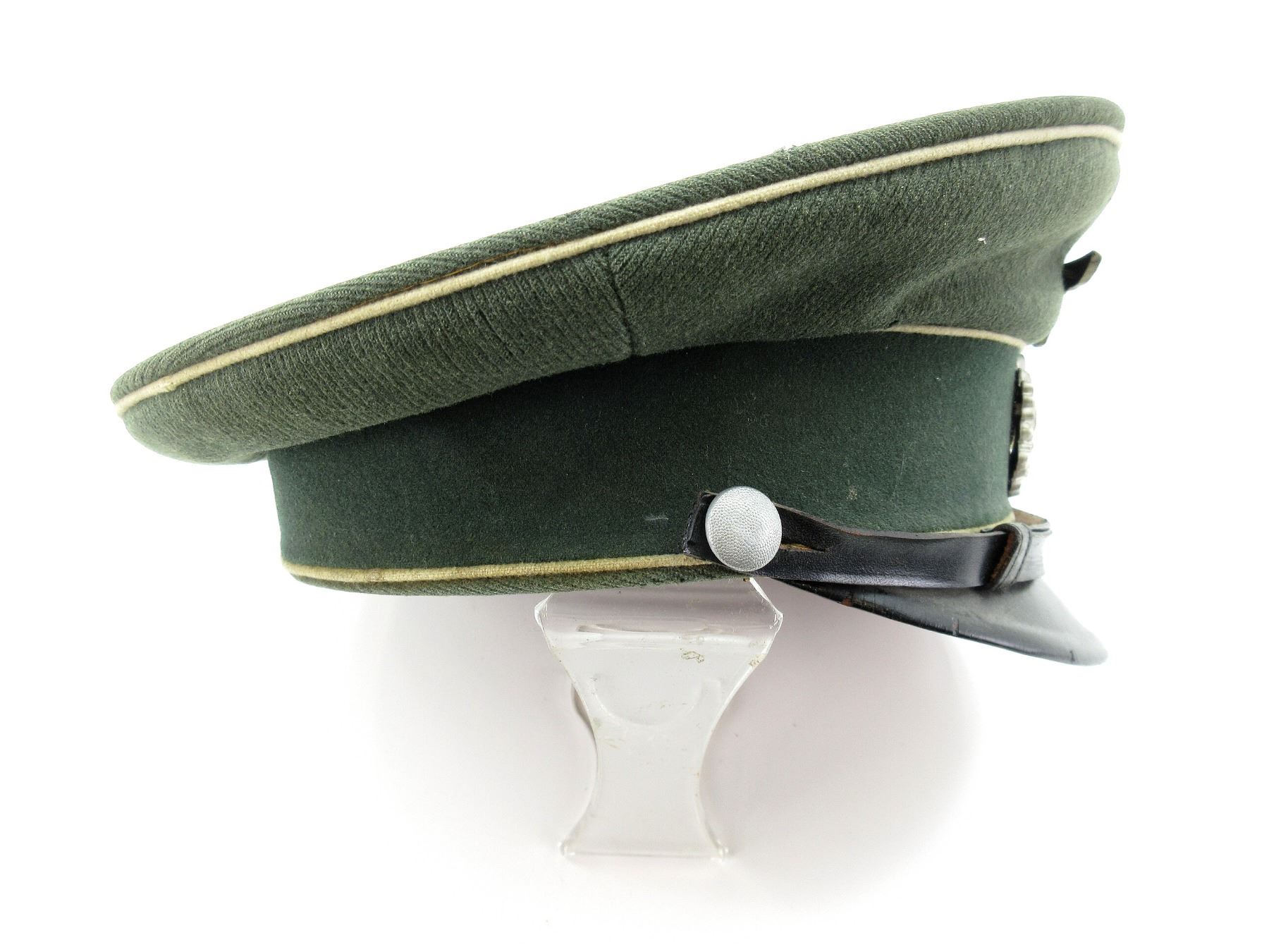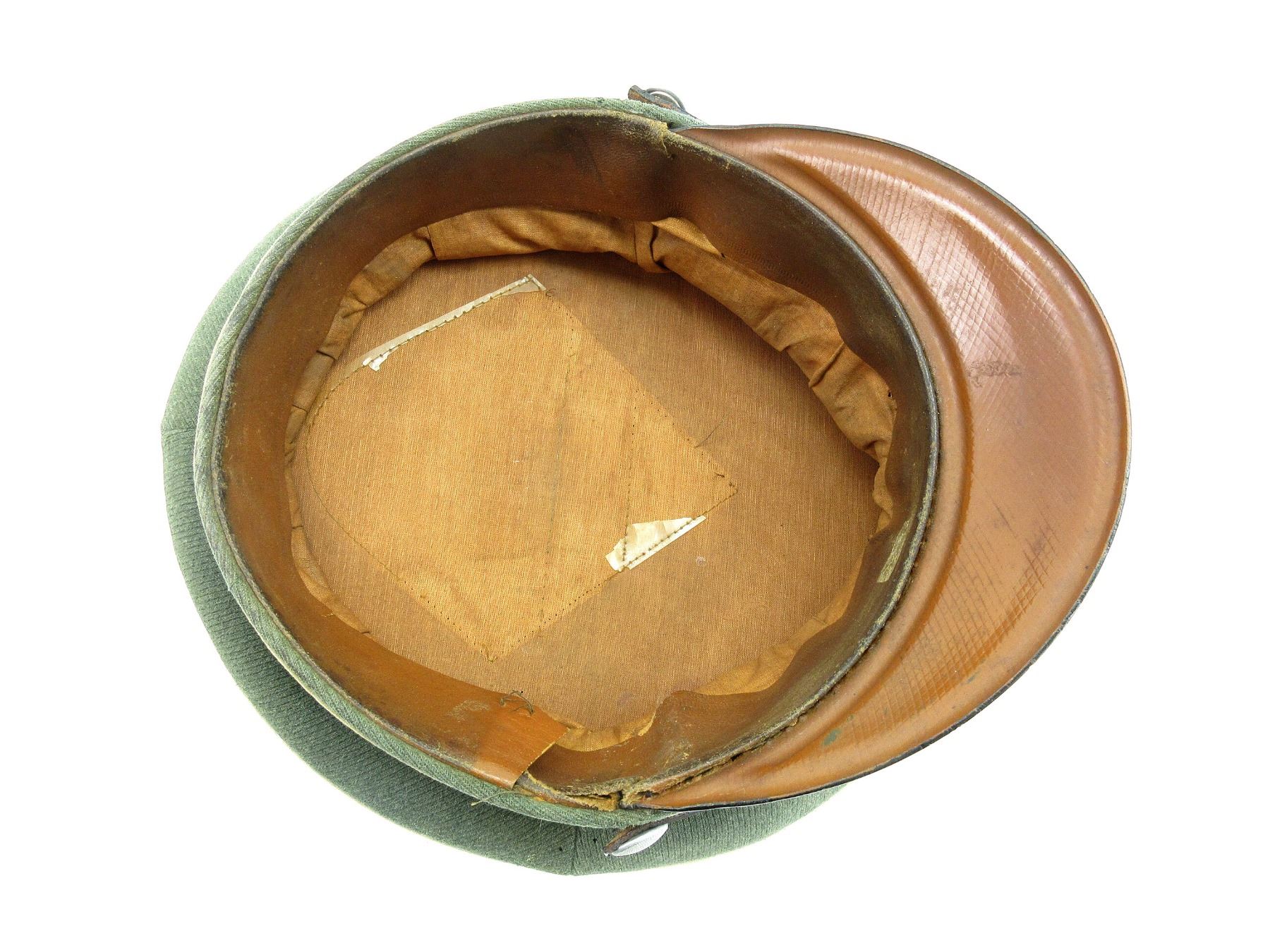 (1) ISSUED GREEN WOOL PEAKED CAP WITH METAL EAGLE HOLDING SWASTIKA BADGE & METAL OAK LEAVES / ACORNS / COCKADE BADGE, MISSING PLASTIC LABEL, BLACK BRIM, LEATHER CHIN STRAP, SILVER PEBBLED BUTTONS, LEATHER HEAD BAND, VARIOUS FAINT INK STAMP MARKINGS ON UNDER-SIDE OF HEAD BAND, SHOWS AGE / WEAR. SEE PHOTOS.