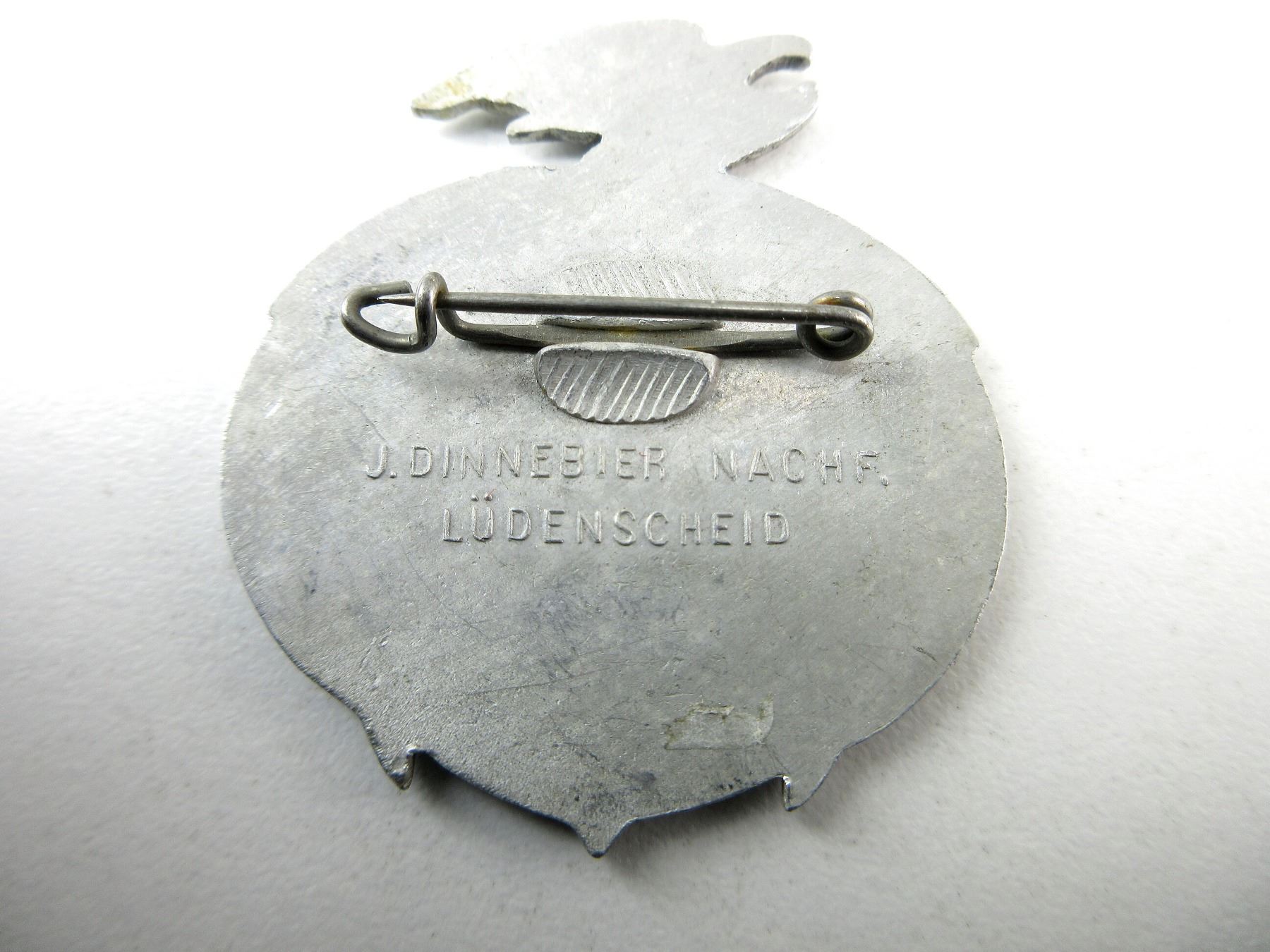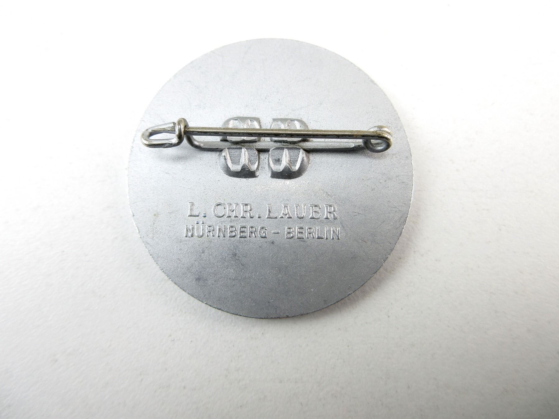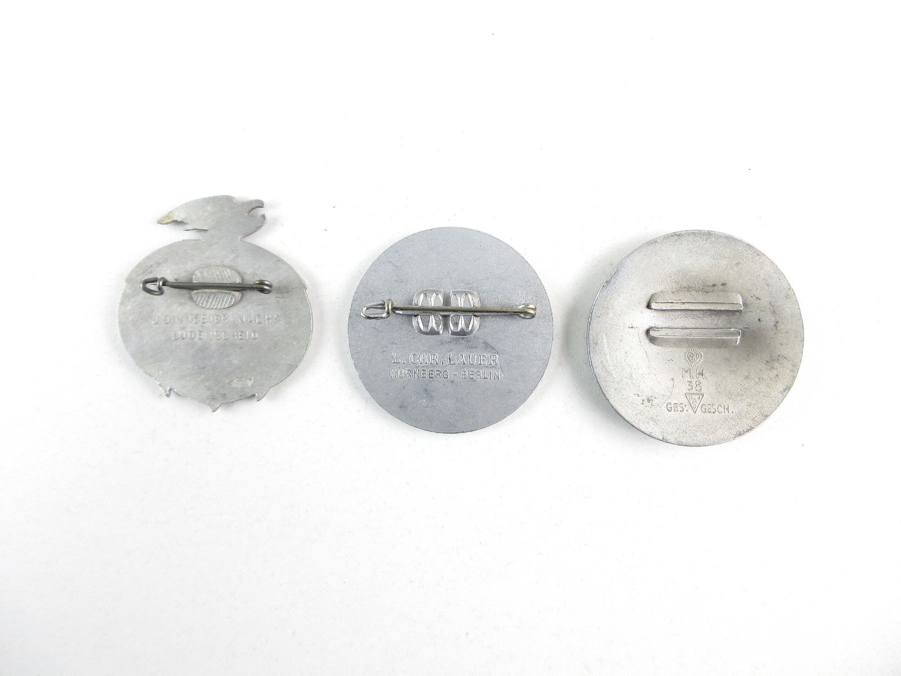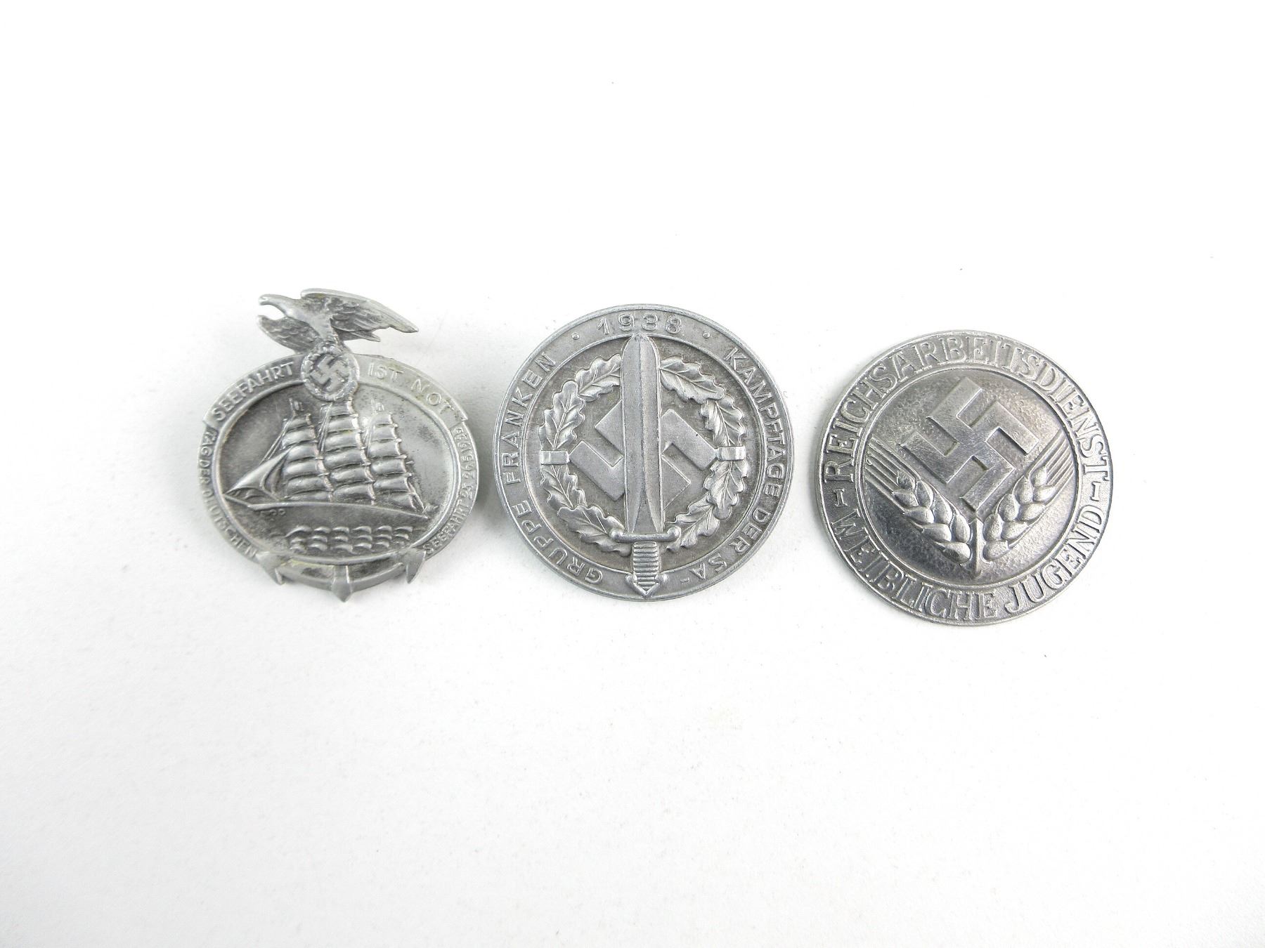 LOT INCLUDES; (1) 1938 SA GRUPPE FRAKEN SPORTS BADGE, BACK MARKED: "L. CHR. LAUER, NURNBERG-BERLIN", PIN BACKING, (1) YOUTH RAD BADGE, BROKEN PIN, BACK MARKED: "MH" IN A HEART SHAPE OVER "M.H." OVER "38" OVER "GES.", "RJAD" IN A TRIANGLE, "GESCH." & (1) SEEFAHRT 1ST TINNIE WITH PIN BACKING, BACK MARKED: "J. DINNEBIER NACHF., LUDENSCHEID". SEE PHOTOS.