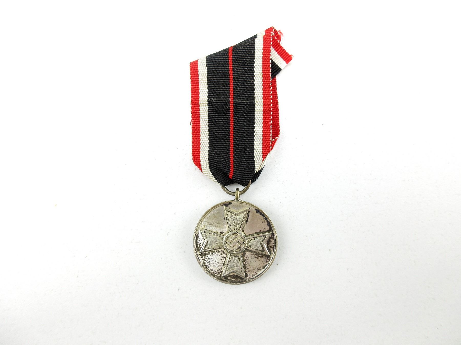 (1) CIVILIAN WAR MERIT MEDAL WITH RIBBON, SILVER TONED MEDAL, MARKED: "FUR KRIEGS, VERDIENST, 1939", APPROX. 32MM DIA., NO VISIBLE MARKINGS ON RIBBON RING, RIBBON DOES NOT GLOW UNDER BLACK LIGHT. SEE PHOTOS.