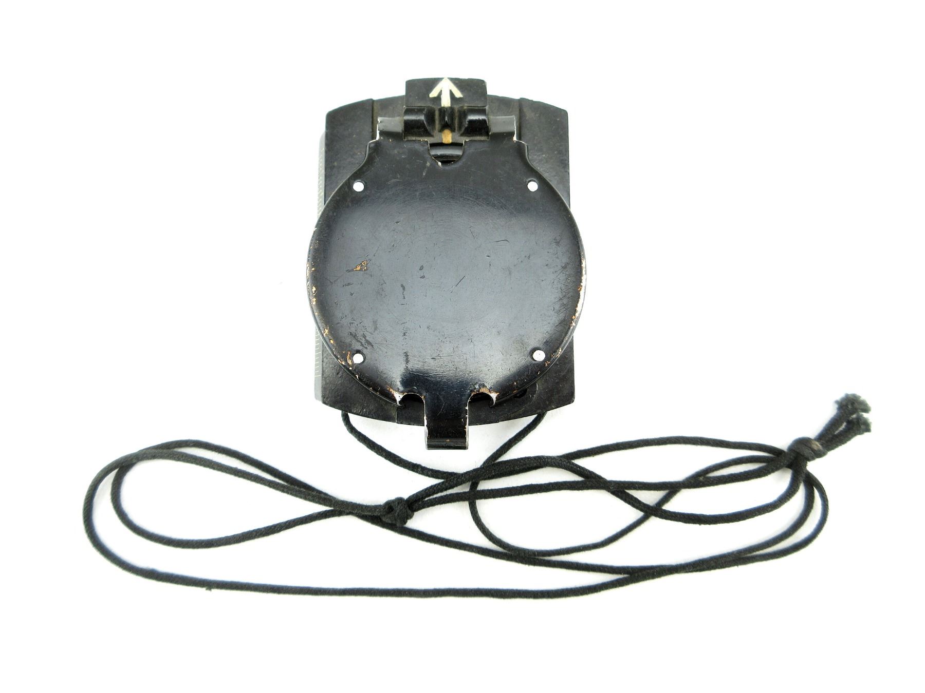 (1) BLACK METAL / PLASTIC COMPASS, VARIOUS MARKINGS ON BOTTOM, UNDER-SIDE OF COMPASS LID HAS MIRROR, MIRROR INTACT, ROPE LANYARD, COMPASS APPEARS TO WORK. SEE PHOTOS.