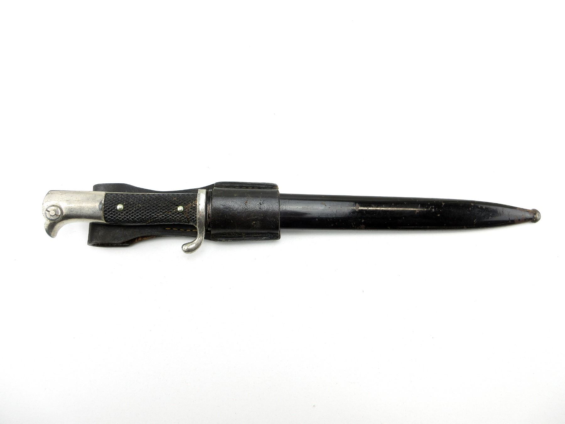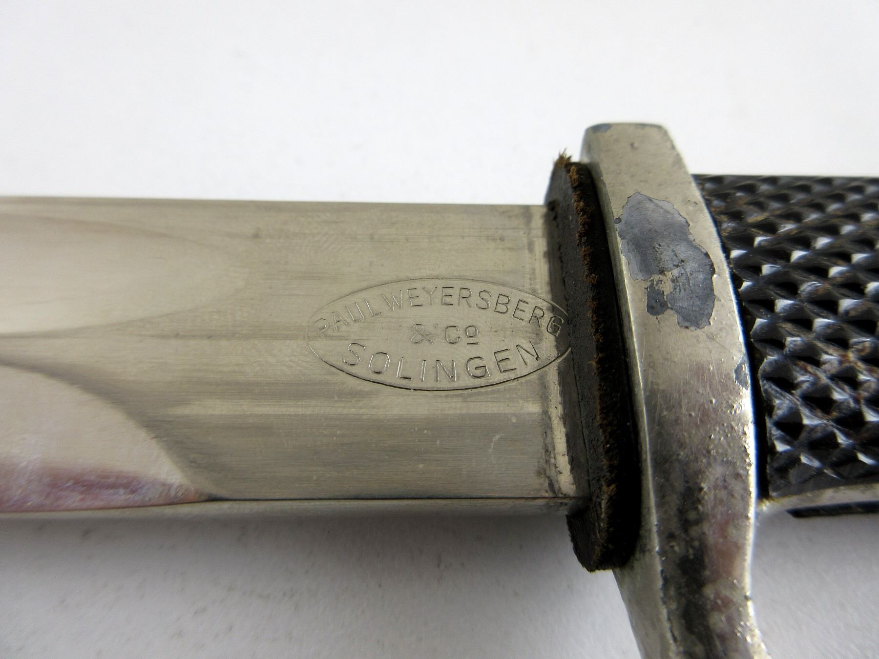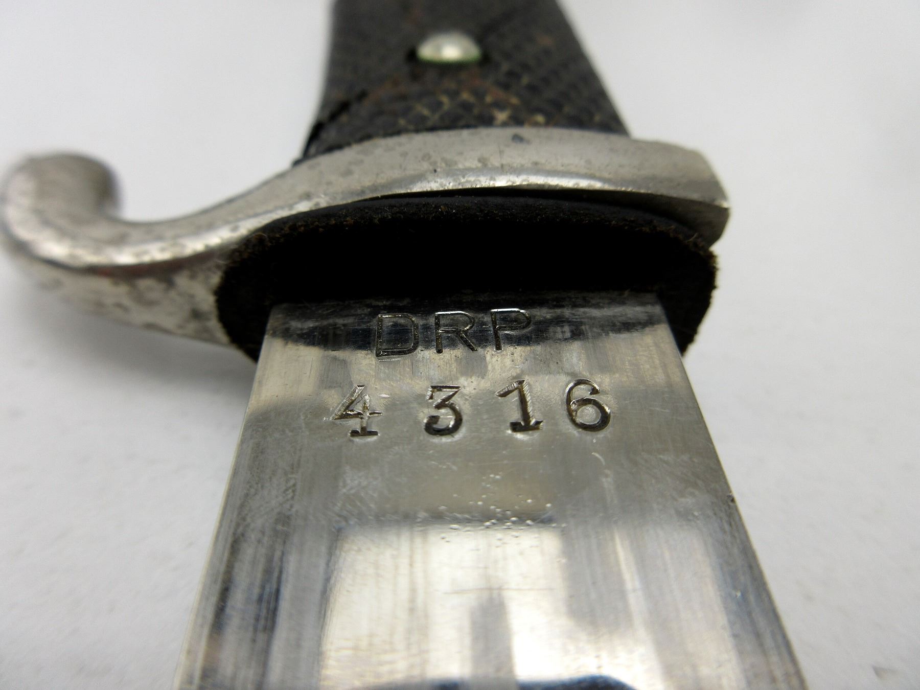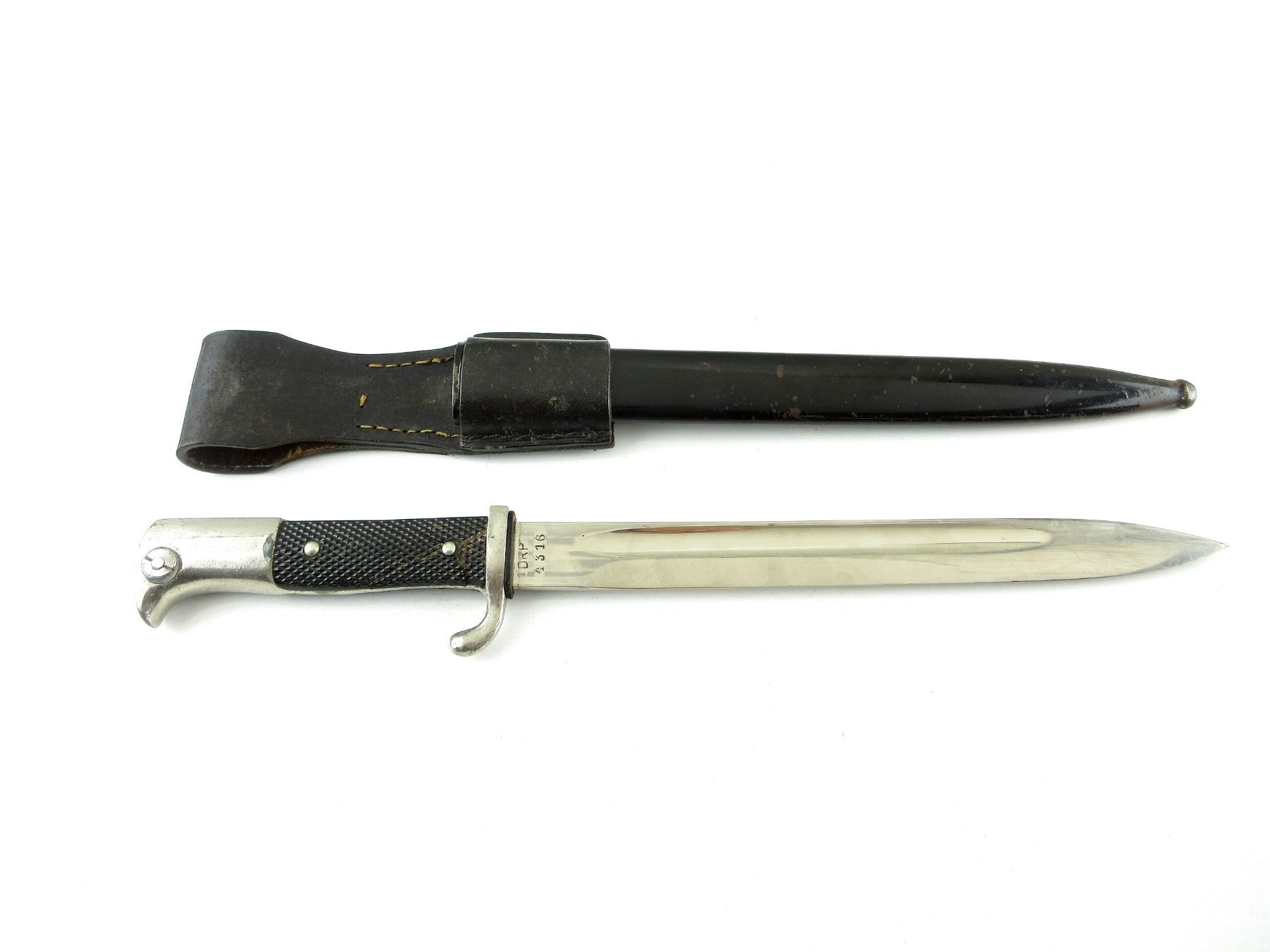 (1) DRP PARADE BAYONET, NICKEL PLATED BLADE, CROSS-GUARD & POMMEL, BLADE IS SLIGHTLY LOOSE, RICASSO MARKED: "PAUL WEYERSBERG & CO., SOLINGEN" IN AN OVAL, OTHER-SIDE MARKED: "DRP, 4316", LEATHER WASHER, 2-PIECE BLACK POLYMER CHECKERED GRIP, CRACKS ON ONE SIDE OF GRIP, METAL POMMEL, NO VISIBLE MARKINGS, BLACK PAINTED METAL SCABBARD WITH LEATHER BELT FROG, NO VISIBLE MARKINGS ON SCABBARD OR FROG, BLADE APPROX. 9 7/8" & OAL APPROX. 14 7/8". SEE PHOTOS.