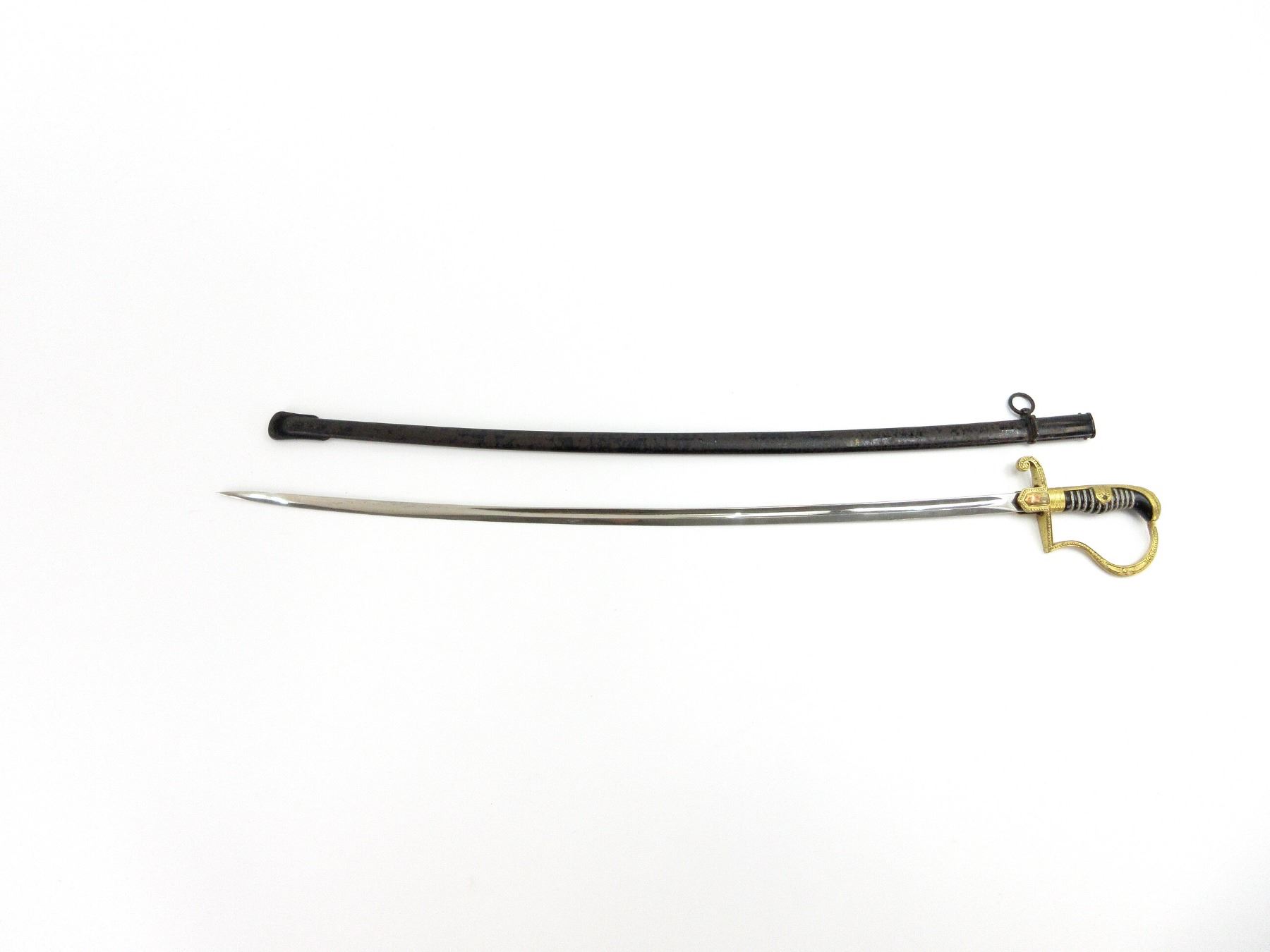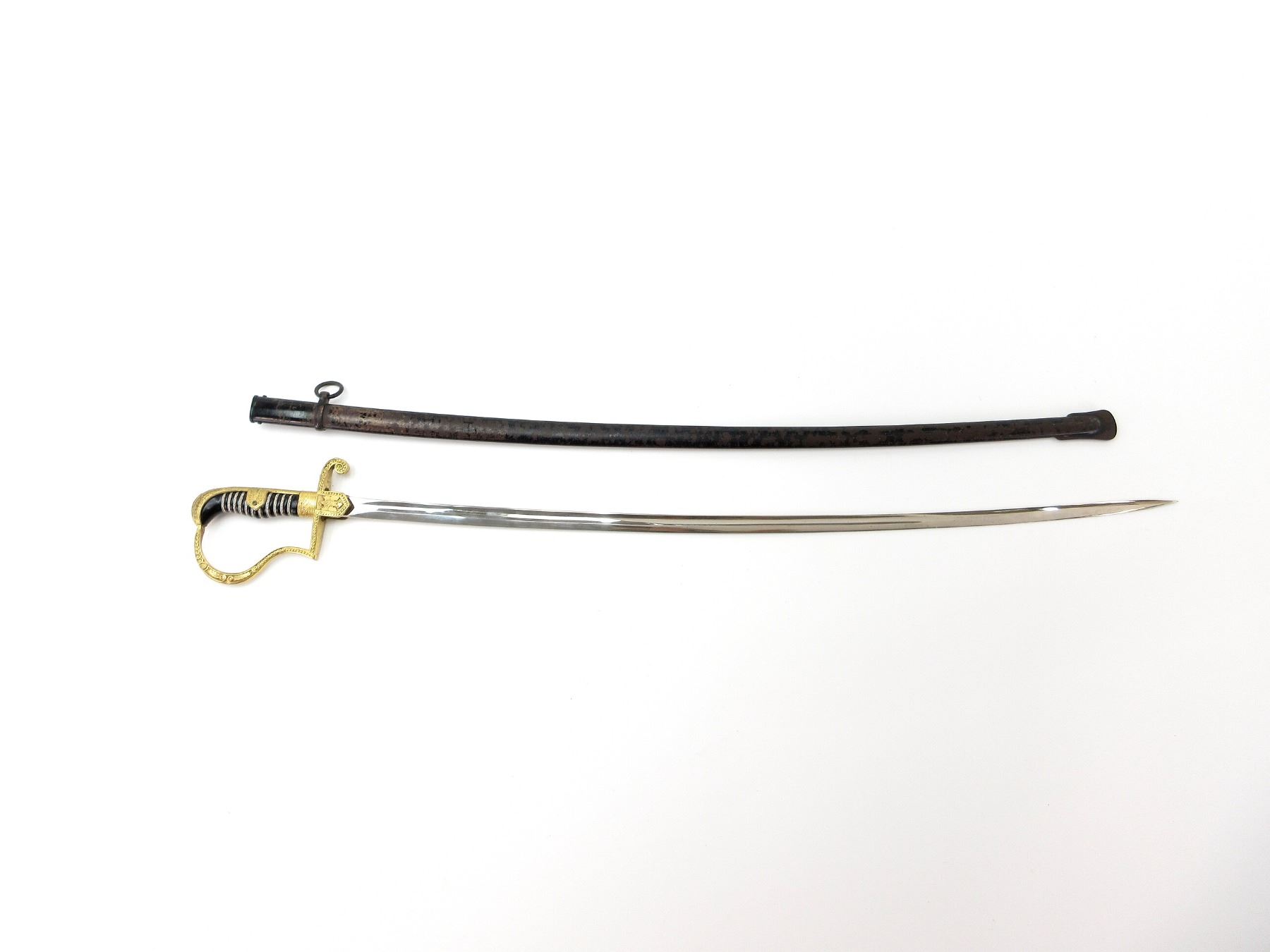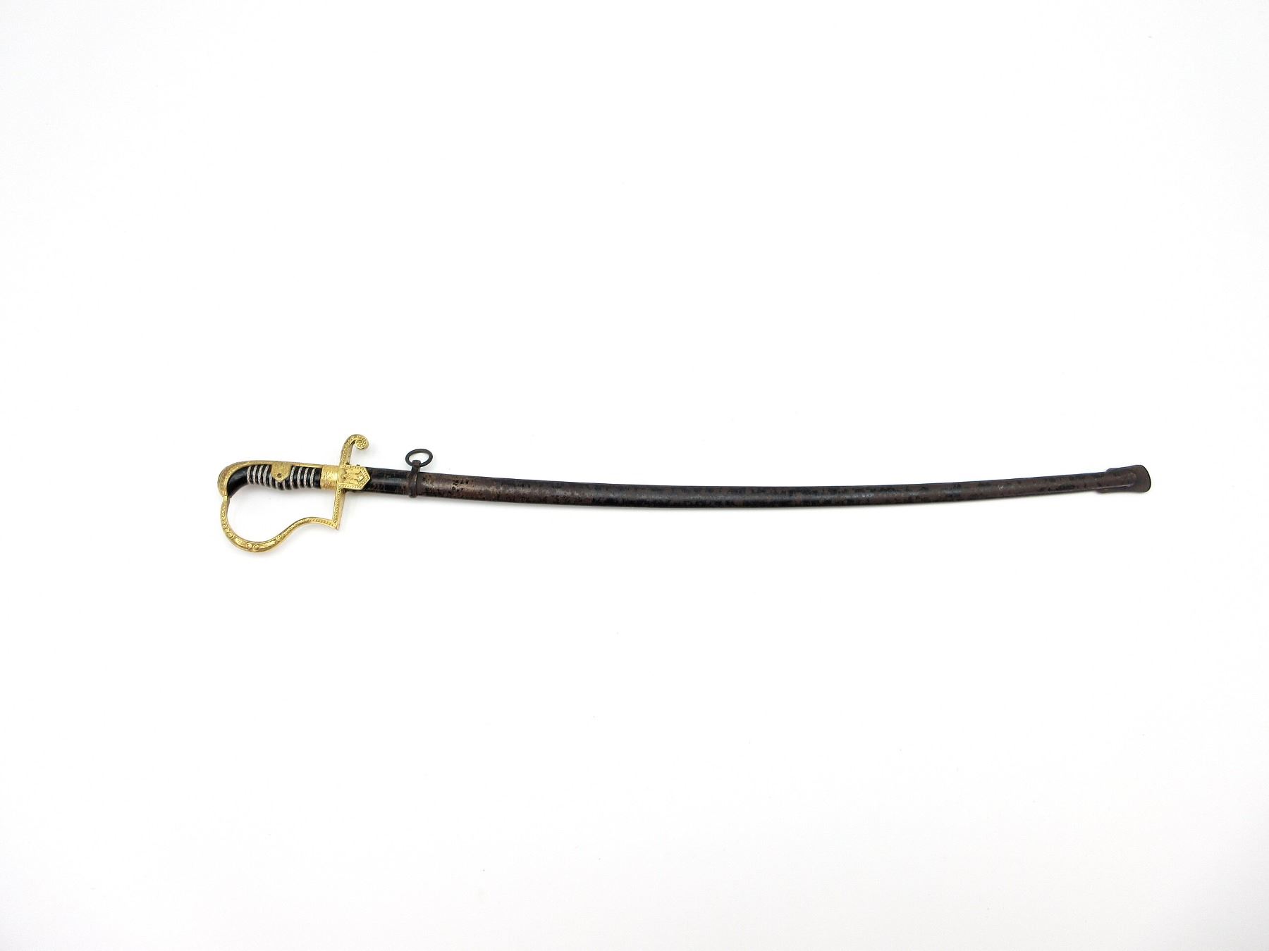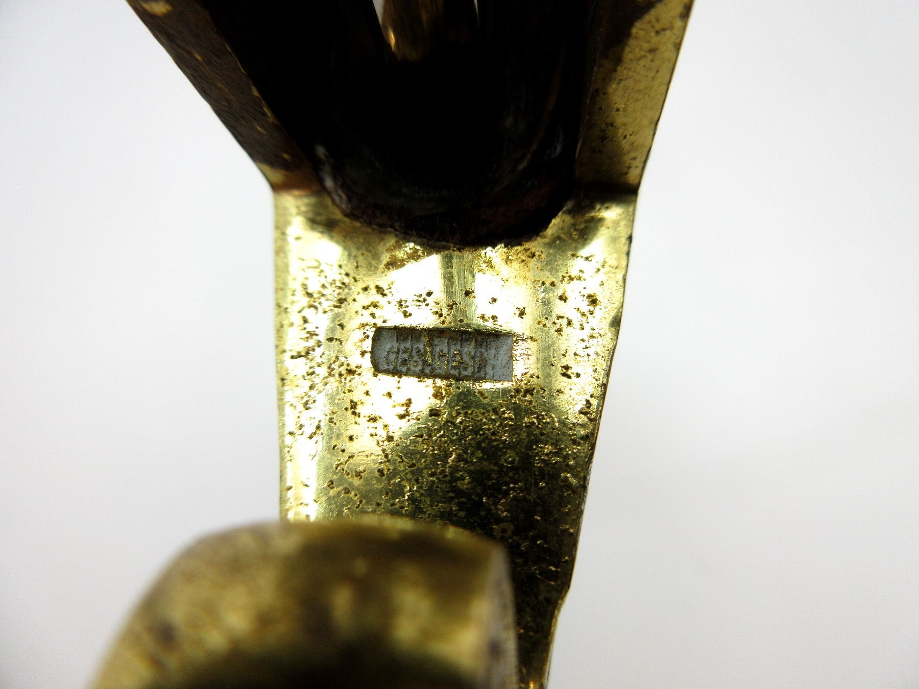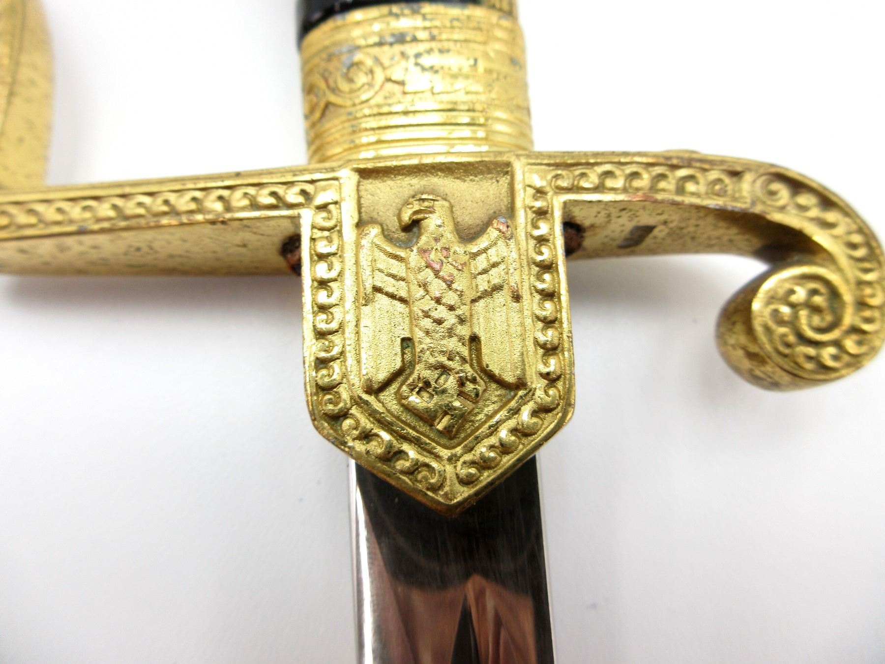 (1) SINGLE-FULLERED BLADE, RICASSO MARKED: "ORIGINAL" OVER SEATED SQUIRREL WITH SWORD OVER "EICKHORN" OVER "SOLINGEN", LEATHER BUFFER PAD / WASHER, BRASS CROSS-GUARD MARKED: "GES.GESCH.", STANDING EAGLE HOLDING SWASTIKA ON CROSS-GUARD, CROSS-GUARD HAS SWIRL ENGRAVED / STAMPED PATTERN GOING FROM END AROUND EAGLE TO OTHER END, SAME ON OTHER-SIDE MAKING IT'S WAY UP EITHER SIDE OF D-SHAPED HILT, HILT HAS TWO DECORATIVE OAK LEAVES ON EITHER SIDE, OAK LEAF & SWIRL DESIGN ABOVE CROSS-GUARD, BLACK GRIP WITH TRIPLE WIRE WRAP, OAK LEAF & SWIRL PATTERN ON BRASS POMMEL, BRASS ALONG BACK-SIDE OF GRIP HAS CROSS SHAPE WITH TWO OAK LEAVES AND SWIRL PATTERN MAKING ITS WAY AROUND THE CROSS, BLACK PAINTED METAL SCABBARD, SQUARE LOOP STUD, ONE HANGER, NO VISIBLE MARKINGS, BLADE APPROX. 32" & OAL APPROX. 36.75". SEE PHOTOS.