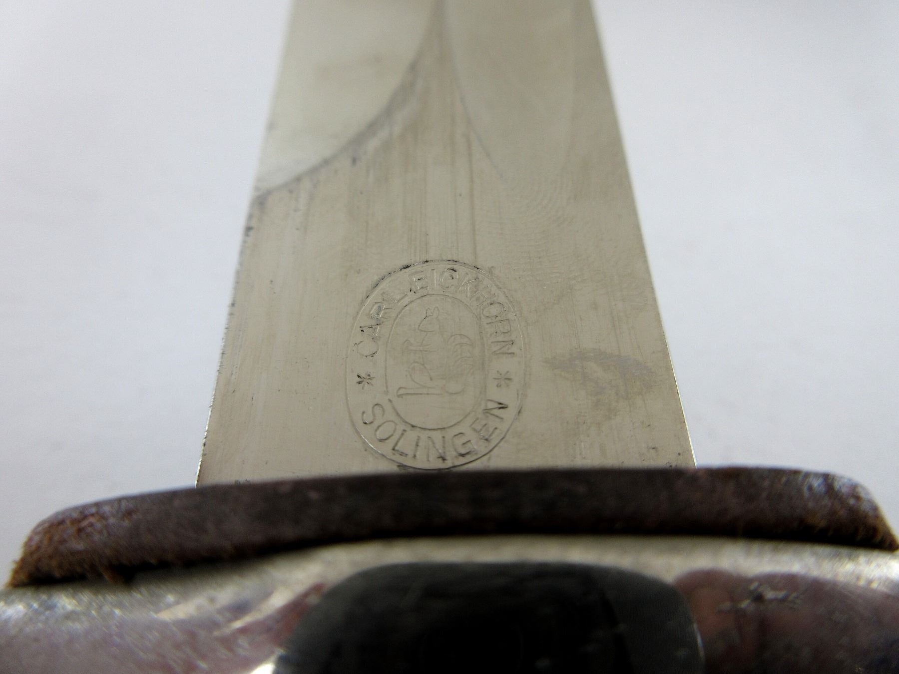 (1) FIREMAN'S DRESS BAYONET, NICKEL PLATED BLADE, CROSS-GUARD & POMMEL, RICASSO MARKED: "* CARL EICKHORN *" OVER SEATED SQUIRREL SYMBOL OVER "SOLINGEN", BROWN LEATHER WASHER, 2-PIECE BLACK POLYMER CHECKERED GRIP, METAL POMMEL, NO VISIBLE MARKINGS, BLACK PAINTED METAL SCABBARD WITH BROWN LEATHER FROG, NO VISIBLE MARKINGS ON SCABBARD OR FROG, BLADE APPROX. 9.75" & OAL APPROX. 14.5". SEE PHOTOS.
