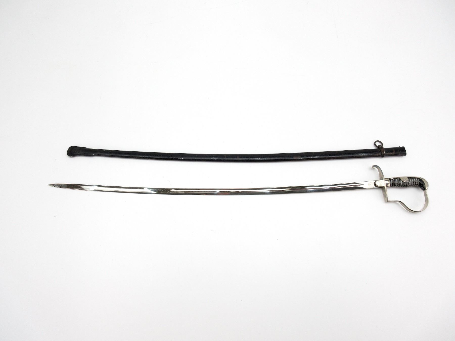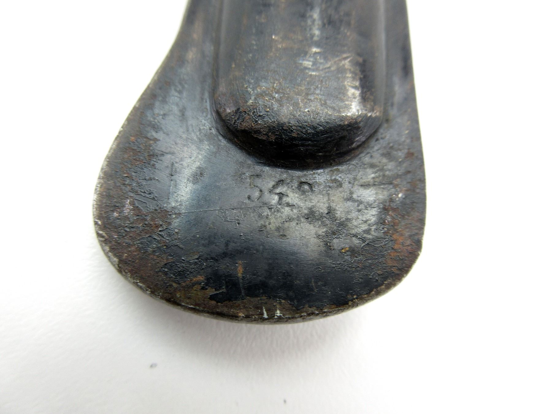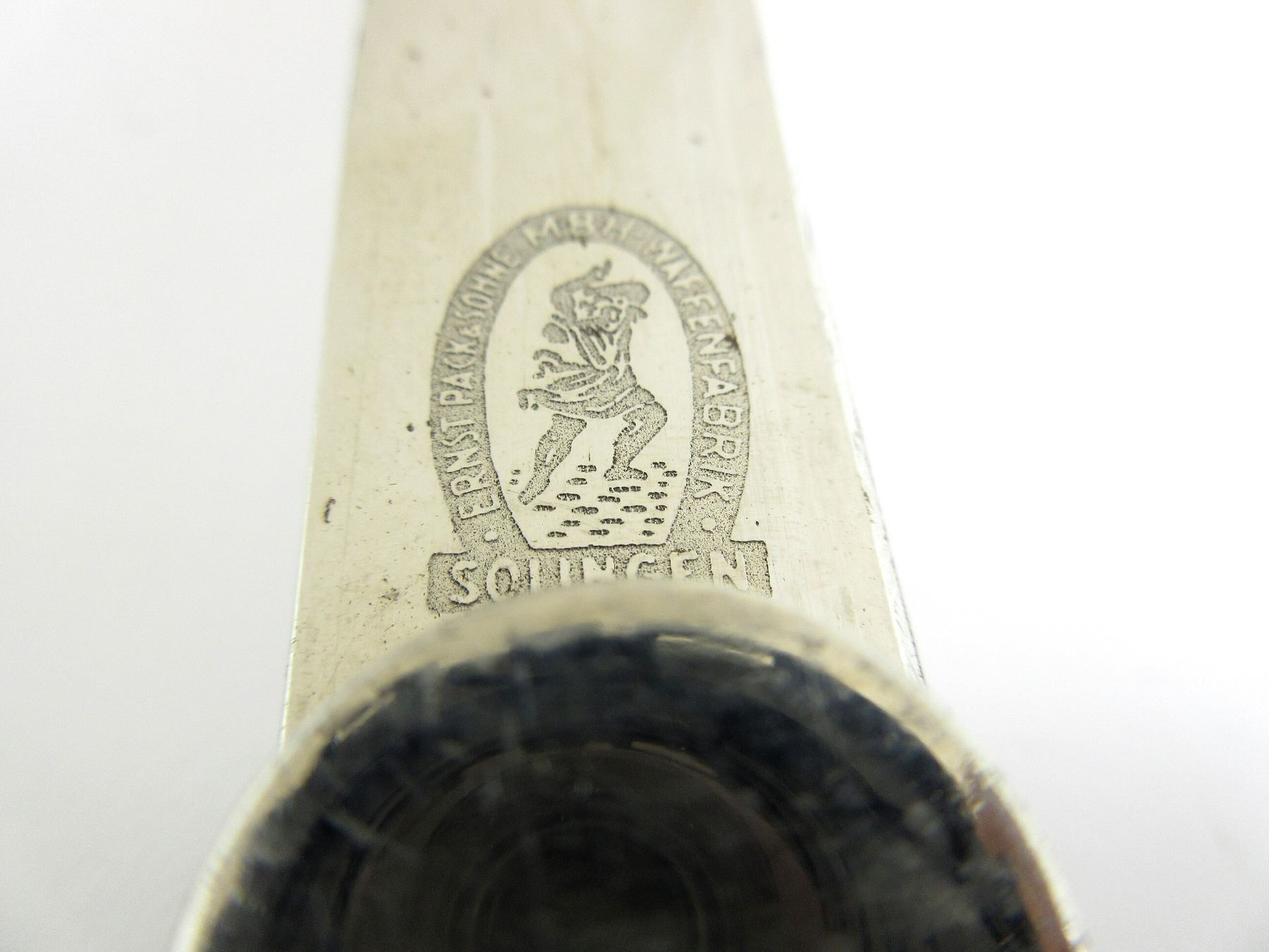 (1) SLIGHTLY CURVED 2/3RD'S FULLERED BLADE, MARKED: "ERNST PACK & SOHNE M-B-H-WAFFENFABRIK, SOLINGEN" MAKER'S MARK, LEATHER WASHER / BUFFER PAD MISSING, METAL CROSS-GUARD, BLACK DOUBLE WIRE WRAPPED GRIP, ALL WIRE IS TWISTED, METAL D-SHAPED HILT, DOVE HEAD SHAPED METAL POMMEL, METAL BACKING ON GRIP, NO VISIBLE MARKINGS, BLACK PAINTED STEEL SCABBARD WITH ONE HANGER LOOP, SCABBARD THROAT MARKED: "542", SCABBARD TIP MARKED: "542", BLADE APPROX. 34.5" & OAL APPROX. 39 3/8". SEE PHOTOS.