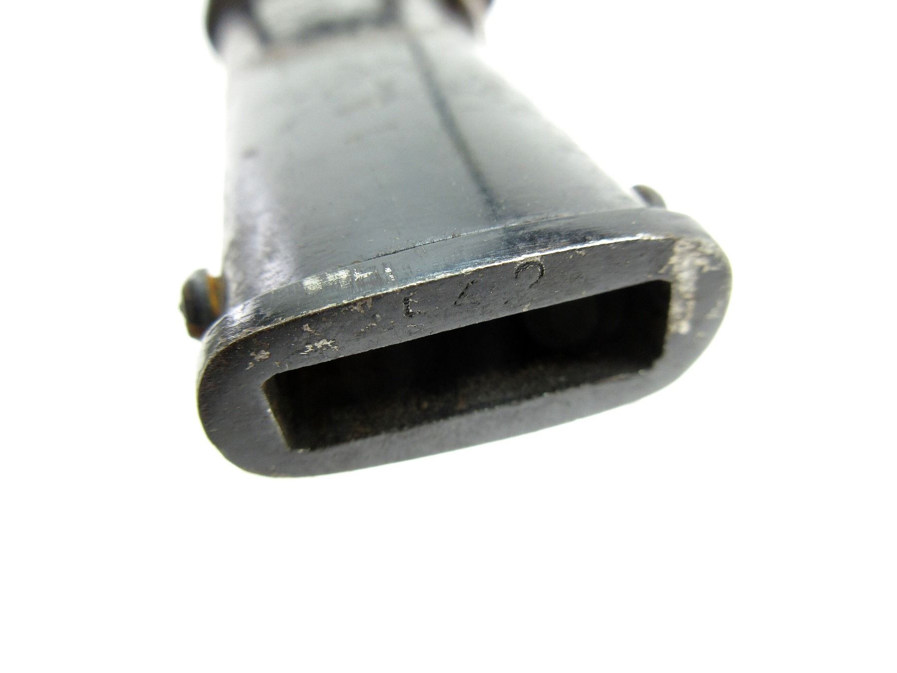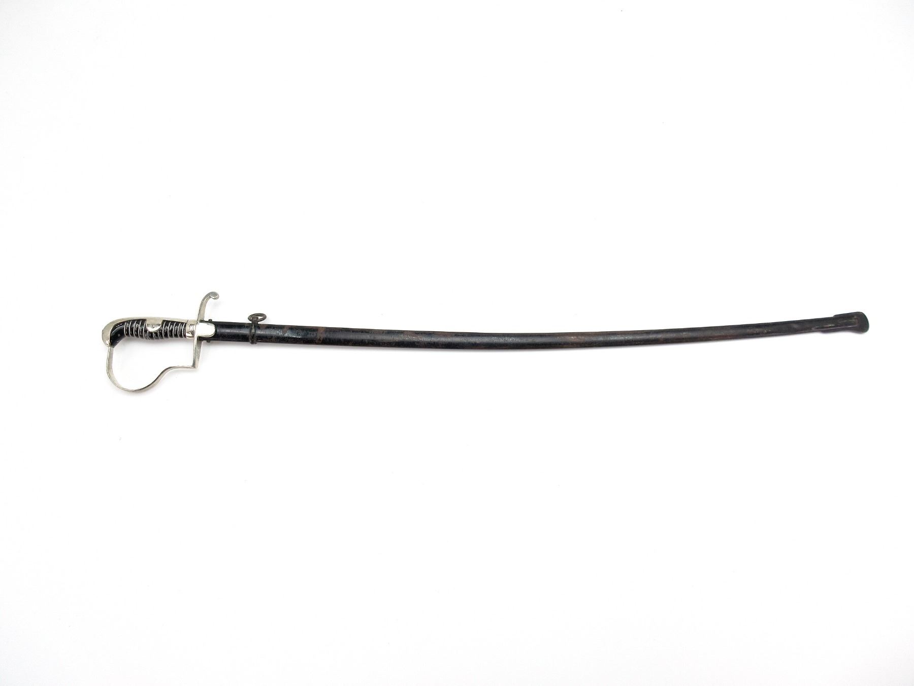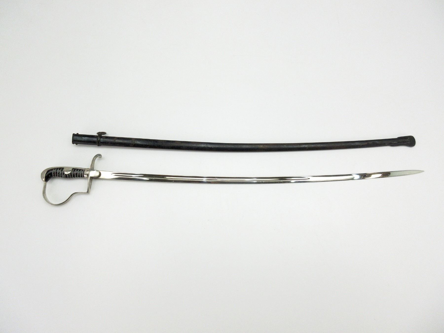 (1) SLIGHTLY CURVED 2/3RD'S FULLERED BLADE, MARKED: "ERNST PACK & SOHNE M-B-H-WAFFENFABRIK, SOLINGEN" MAKER'S MARK, LEATHER WASHER / BUFFER PAD MISSING, METAL CROSS-GUARD, BLACK DOUBLE WIRE WRAPPED GRIP, ALL WIRE IS TWISTED, METAL D-SHAPED HILT, DOVE HEAD SHAPED METAL POMMEL, METAL BACKING ON GRIP, NO VISIBLE MARKINGS, BLACK PAINTED STEEL SCABBARD WITH ONE HANGER LOOP, SCABBARD THROAT MARKED: "542", SCABBARD TIP MARKED: "542", BLADE APPROX. 34.5" & OAL APPROX. 39 3/8". SEE PHOTOS.