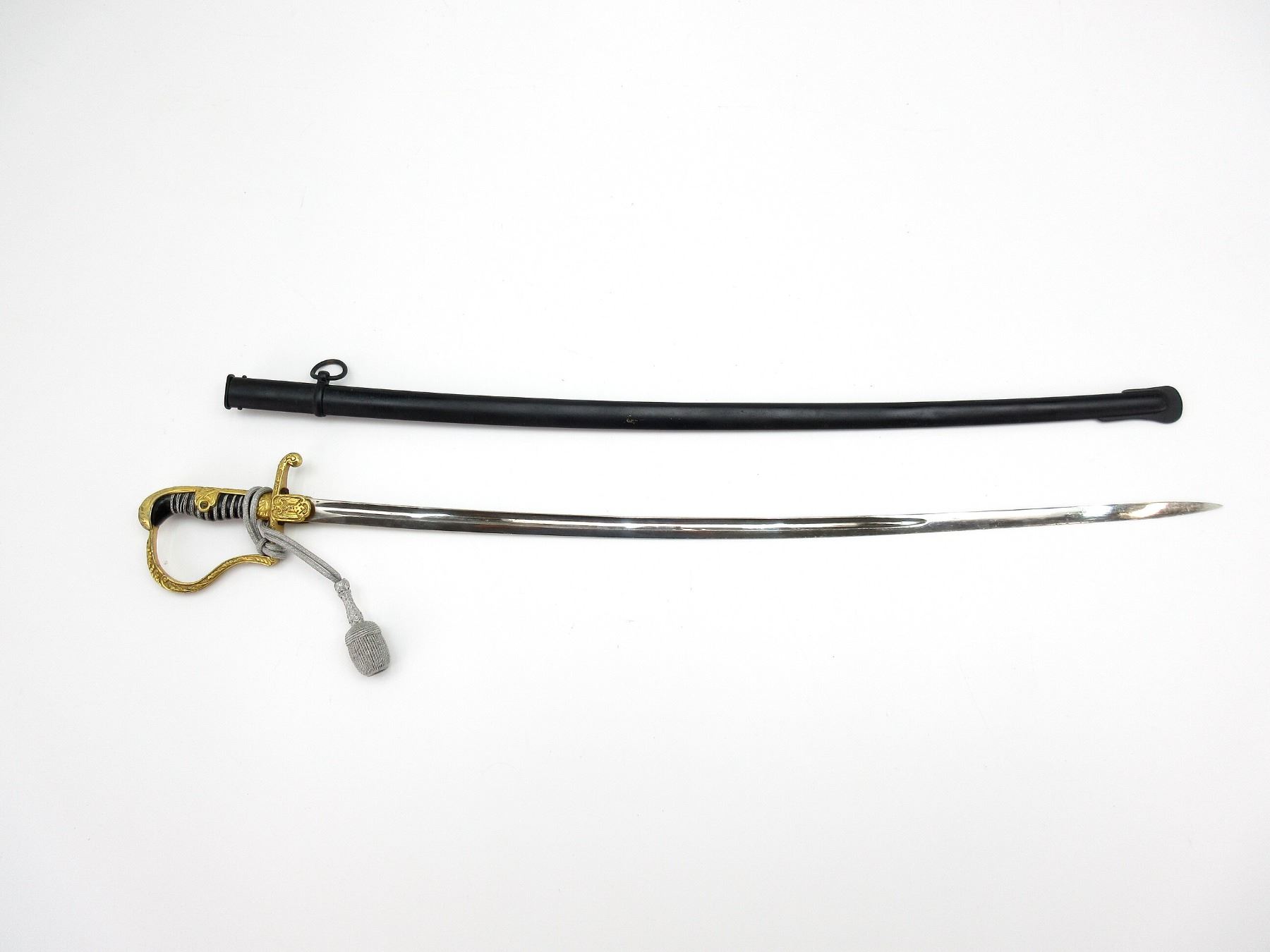 (1) SLIGHTLY CURVED 2/3RD'S FULLERED BLADE, MARKED: PUMA HEAD IN A DIAMOND "PUMA" OVER "SOLINGEN" MAKER'S MARK, LEATHER WASHER / BUFFER PAD, BRASS CROSS-PIECE WITH FLYING EAGLE HOLDING SWASTIKA, DECORATIVE OAK LEAF DESIGN, BRASS OAK LEAF DESIGN ABOVE GRIP, SILVER PORTAPEE, BLACK TRIPLE WIRE WRAPPED GRIP, ALL WIRE IS TWISTED, BRASS D-SHAPED HILT WITH OAK LEAF / ACORN DESIGNS, DOVE HEAD SHAPED BRASS POMMEL WITH OAK LEAF DESIGN, BRASS BACKING ON GRIP WITH OAK LEAF DESIGN, BLACK PAINTED STEEL SCABBARD WITH ONE HANGER LOOP, NO VISIBLE MARKINGS, BLADE APPROX. 31" & OAL APPROX. 35 5/8". SEE PHOTOS.