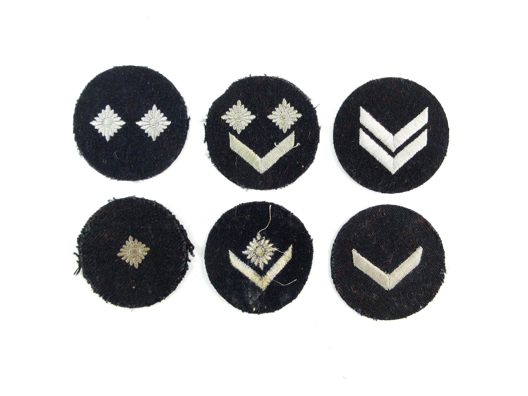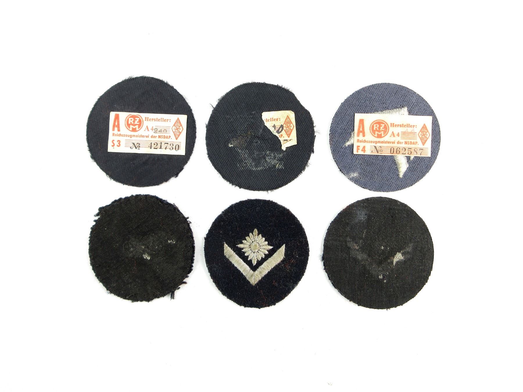 LOT INCLUDES; (6) BADGES, BLACK WOOL WITH WHITE THREAD, MARINE RANK, TWO WITH INTACT RZM PAPER LABELS, VARIOUS MARKINGS ON LABELS, ONE WITH PARTIAL / TORN RZM LABEL, ALL DO NOT GLOW UNDER BLACK LIGHT. SEE PHOTOS.