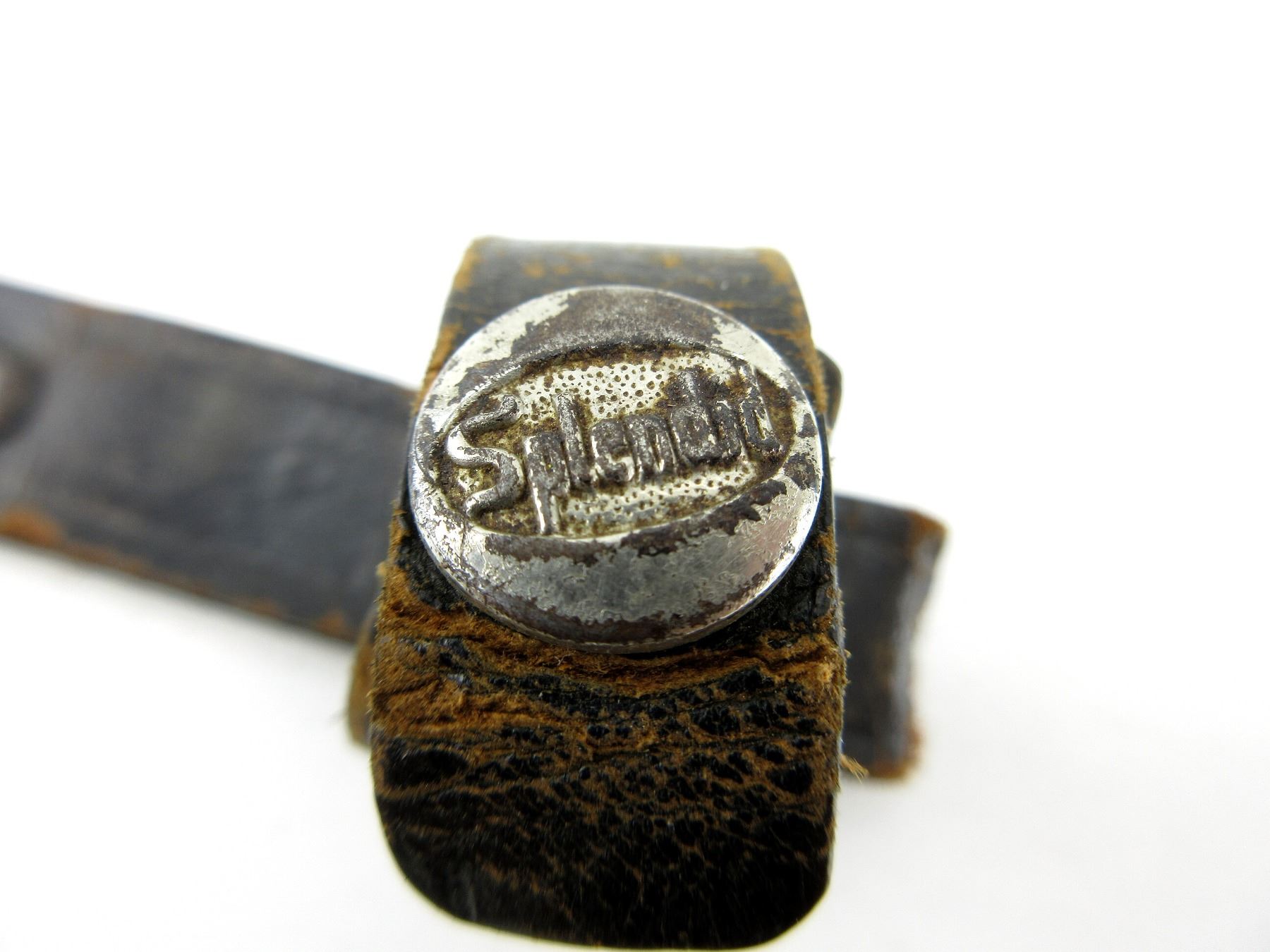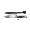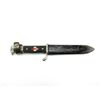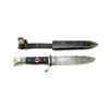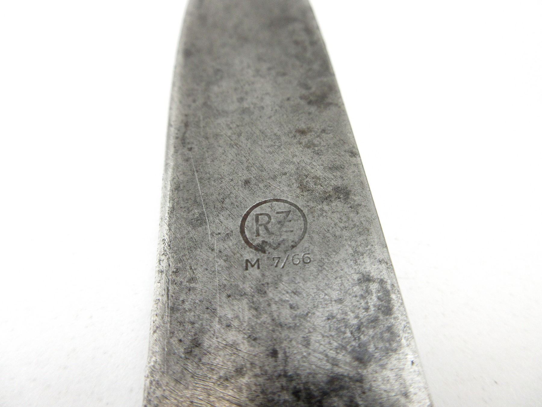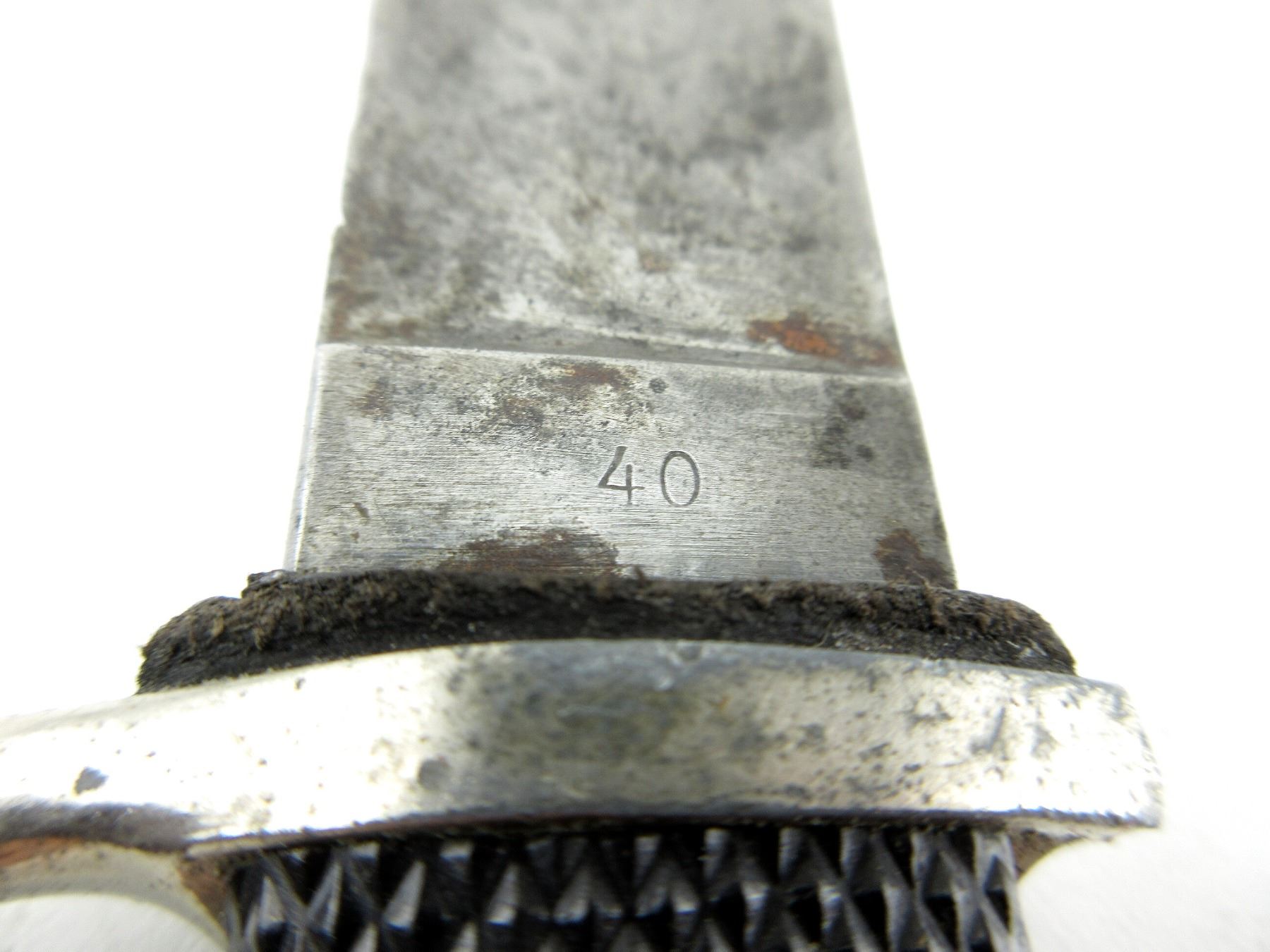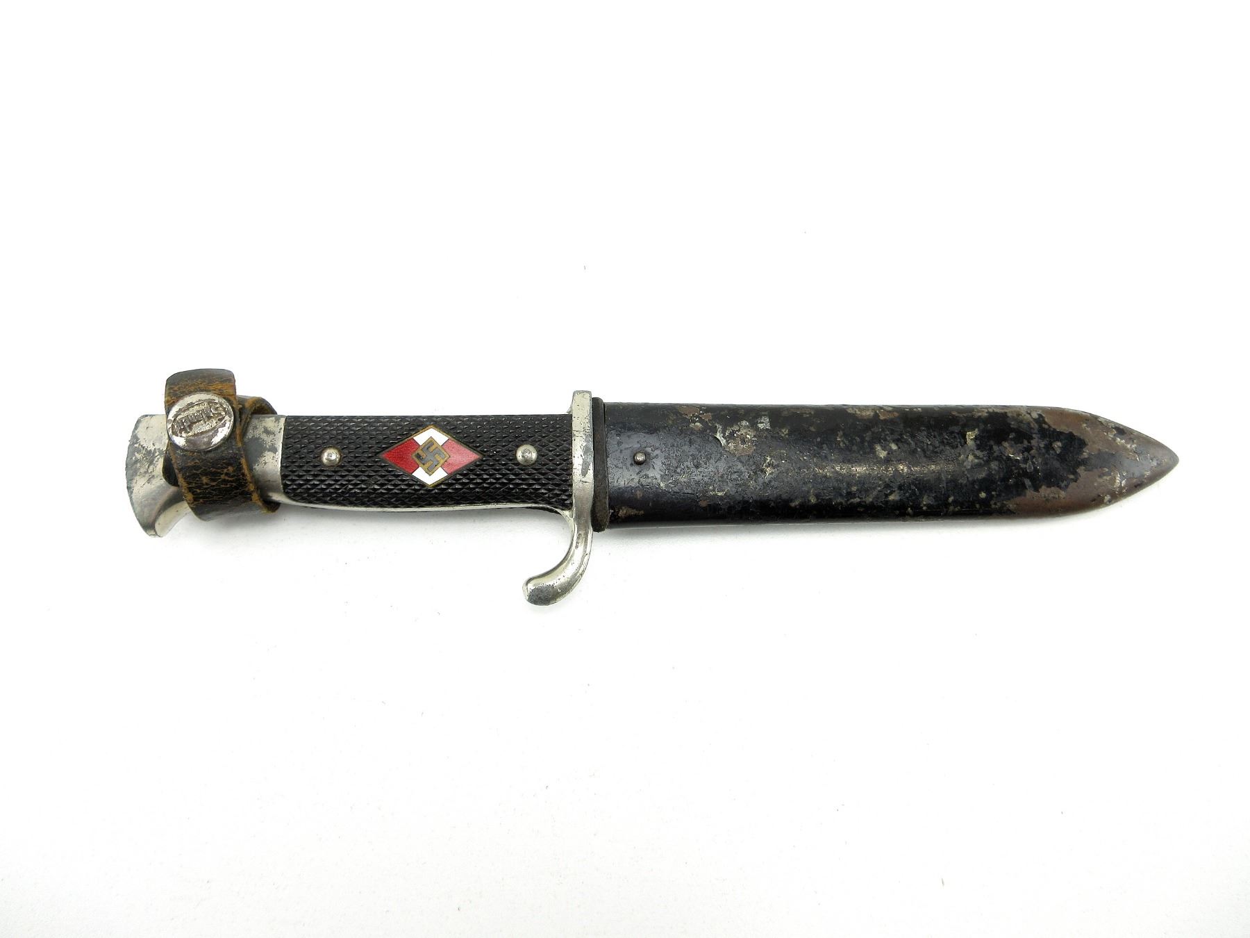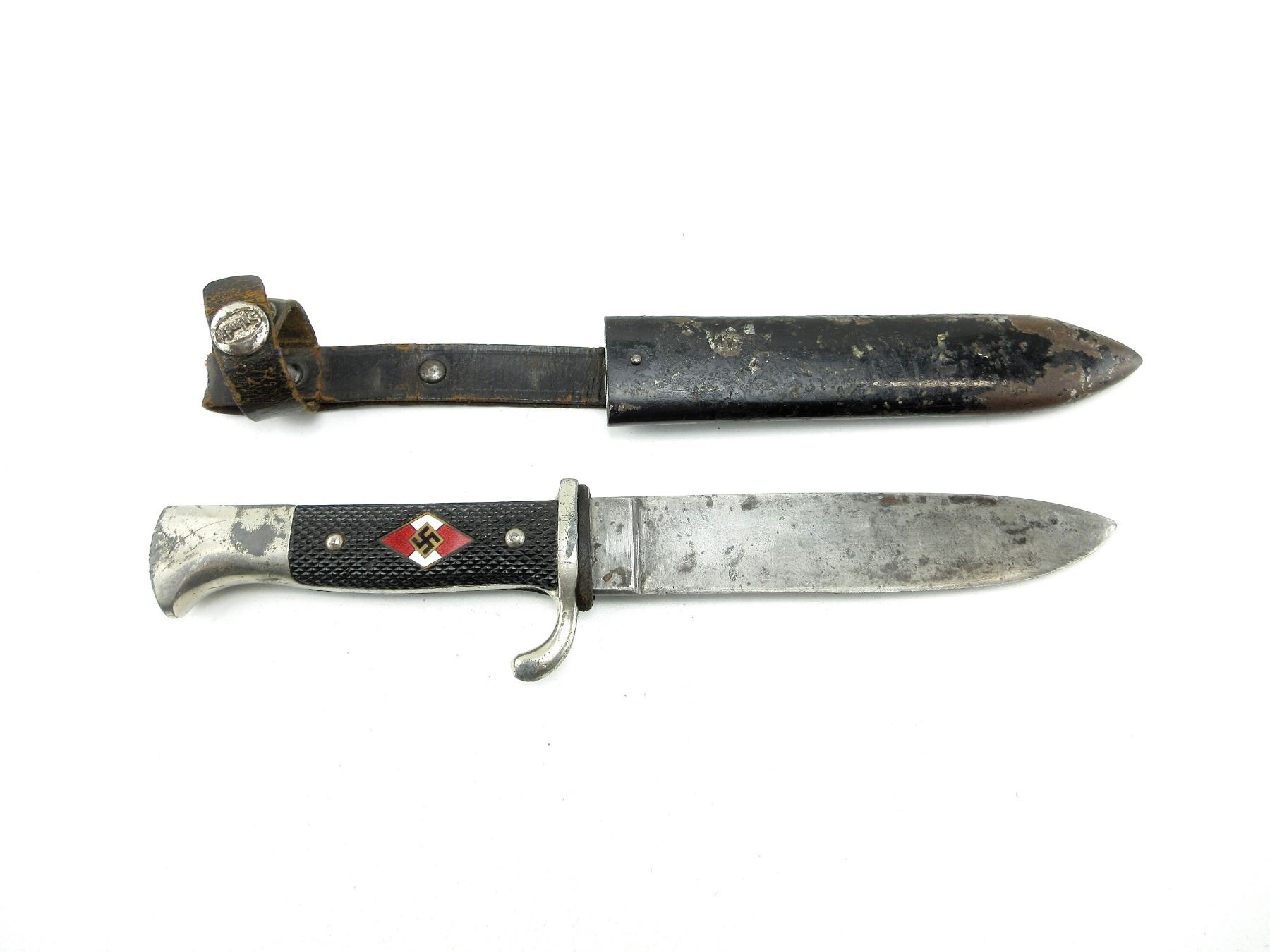 (1) HITLER YOUTH KNIFE, RICASSO MARKED: "40", BLADE MARKED: "RZM, M 7/66", 2-PIECE BLACK POLYMER CHECKERED GRIP, GRIP HAS RED / WHITE / BLACK ENAMELED DIAMOND WITH SWASTIKA, DIAMOND APPROX. 25MM X 14MM, METAL POMMEL, NO VISIBLE MARKINGS, BLACK PAINTED METAL SCABBARD WITH BROWN LEATHER STRAP, NO VISIBLE MARKINGS ON SCABBARD, VARIOUS MARKINGS ON SNAP OF LEATHER STRAP, BLADE APPROX. 5.5" & OAL APPROX. 9.75". SEE PHOTOS.