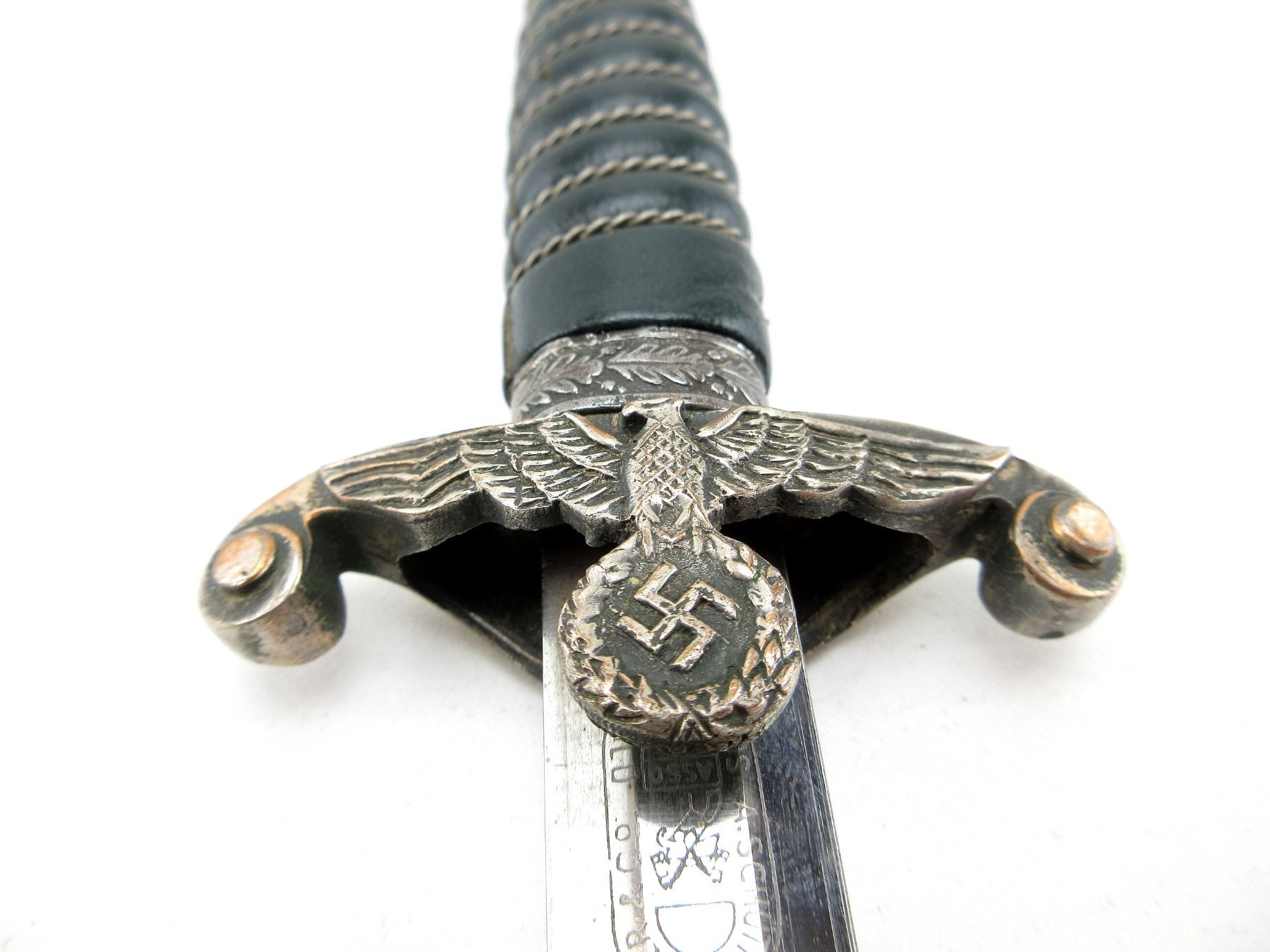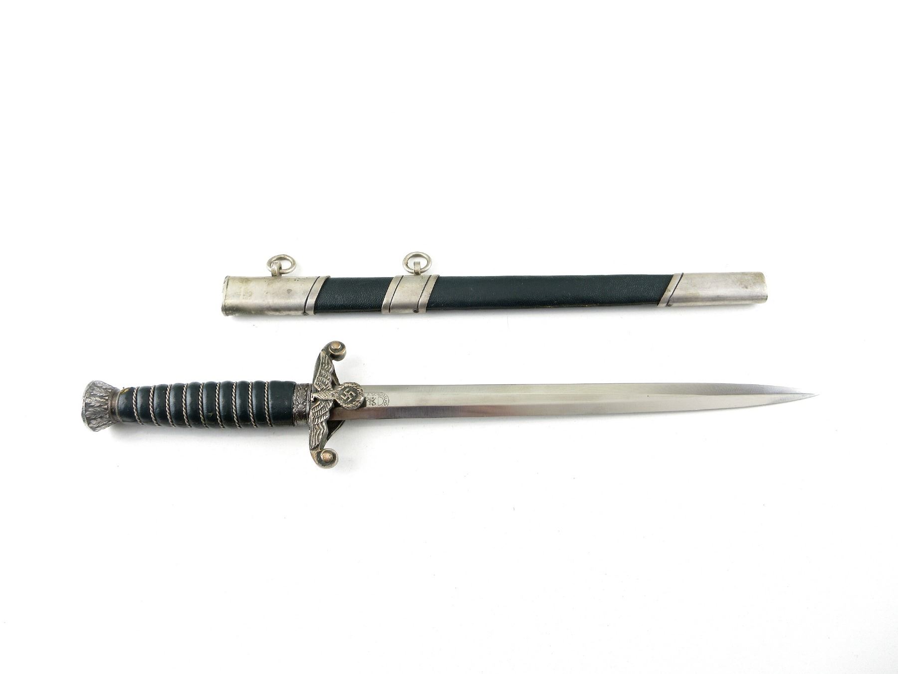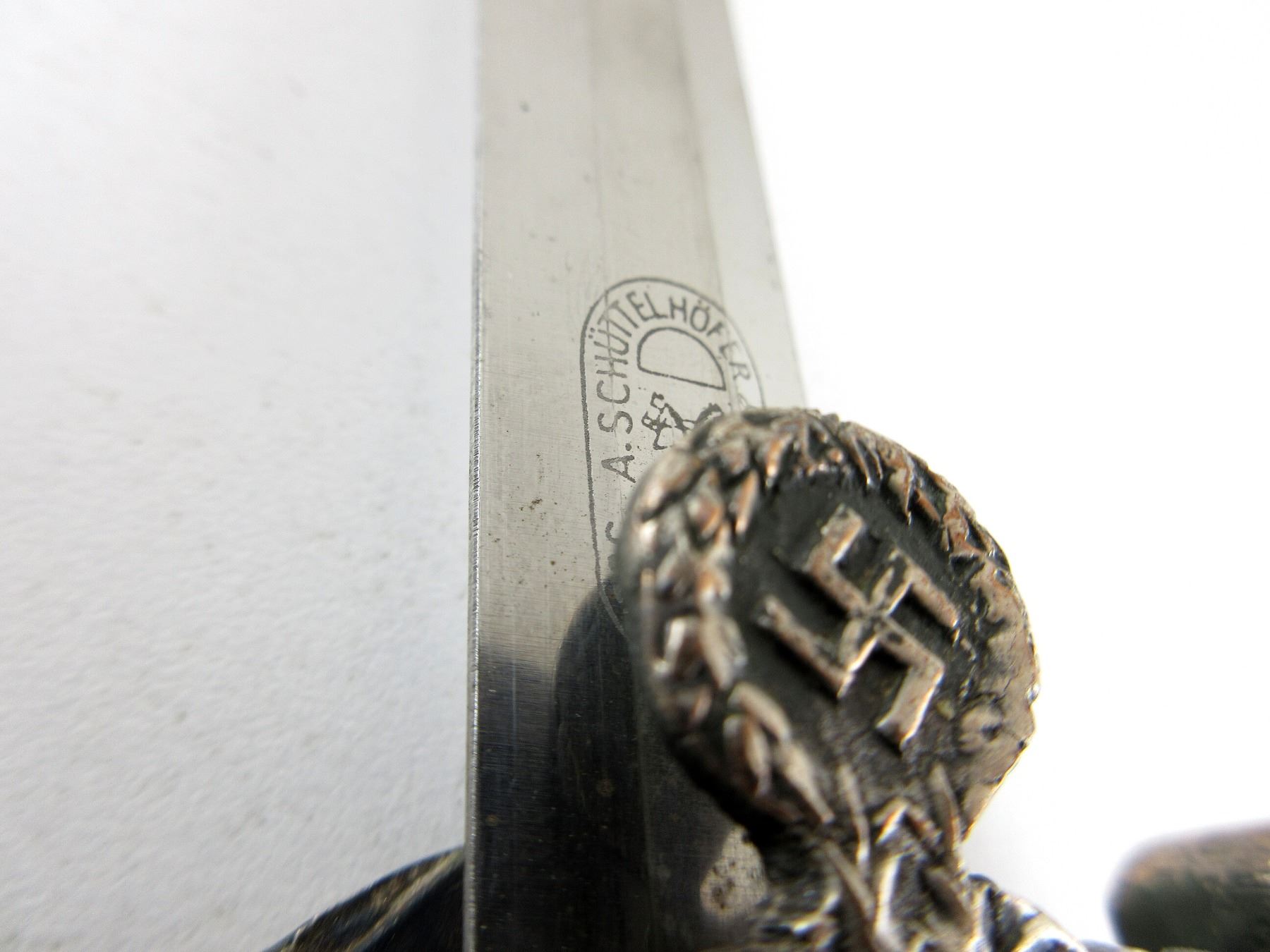(1) LAND CUSTOMS DAGGER, DOUBLE-EDGED BLADE, RICASSO MARKED: "A.SCHUTTELHOFER & CO." OVER HORSE HEADS SYMBOL OVER "ASSO, SOLINGEN-WALD" ALL IN OVAL, BROWN LEATHER WASHER, FLYING EAGLE HOLDING SWASTIKA CROSS-GUARD, DECORATIVE ACORN & LEAVES ABOVE CROSS-GUARD, GREEN LEATHER & WIRE WRAPPED GRIP, METAL POMMEL WITH OAK LEAVES DESIGN, NO VISIBLE MARKINGS, GREEN LEATHER & METAL SCABBARD WITH TWO HANGERS, NO VISIBLE MARKINGS, BLADE APPROX. 9 7/8" & OAL APPROX. 14.75", WEIGHS APPROX. 0.3LBS. SEE PHOTOS.