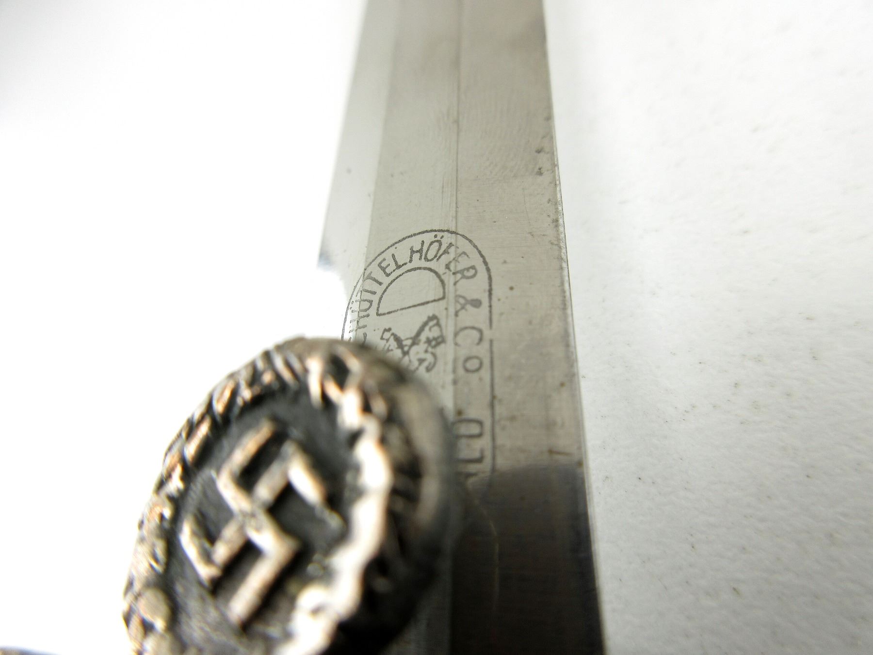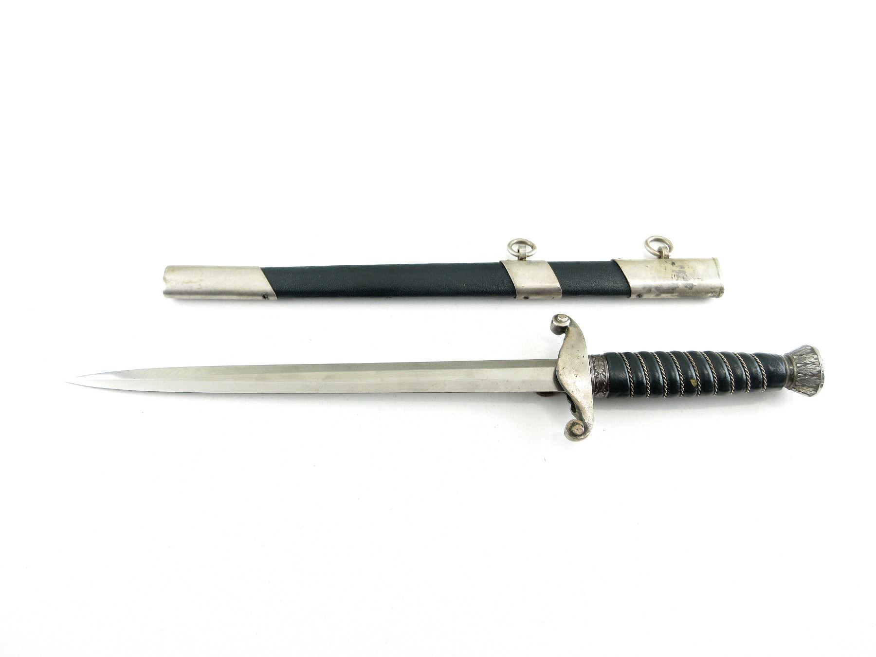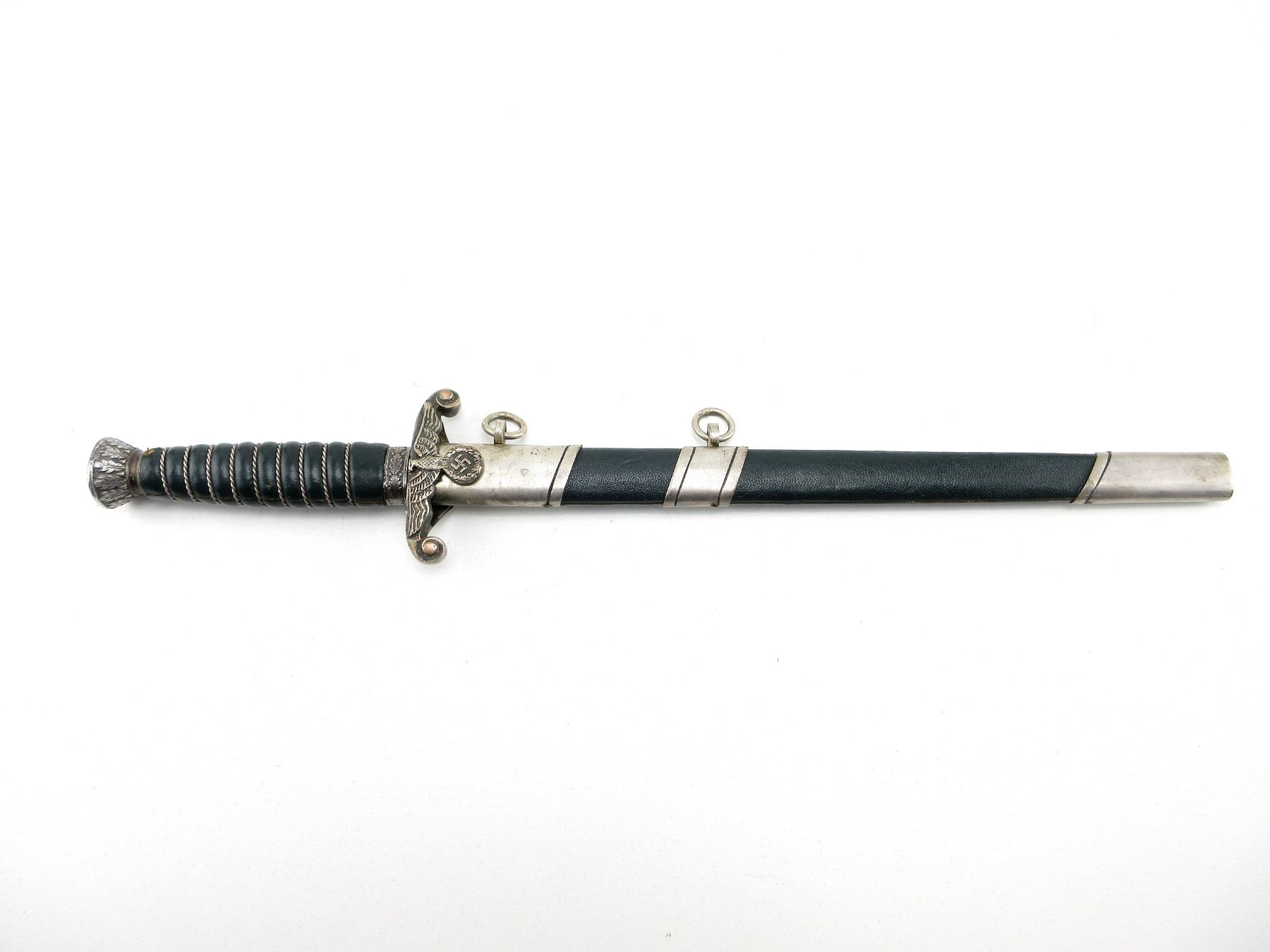 (1) LAND CUSTOMS DAGGER, DOUBLE-EDGED BLADE, RICASSO MARKED: "A.SCHUTTELHOFER & CO." OVER HORSE HEADS SYMBOL OVER "ASSO, SOLINGEN-WALD" ALL IN OVAL, BROWN LEATHER WASHER, FLYING EAGLE HOLDING SWASTIKA CROSS-GUARD, DECORATIVE ACORN & LEAVES ABOVE CROSS-GUARD, GREEN LEATHER & WIRE WRAPPED GRIP, METAL POMMEL WITH OAK LEAVES DESIGN, NO VISIBLE MARKINGS, GREEN LEATHER & METAL SCABBARD WITH TWO HANGERS, NO VISIBLE MARKINGS, BLADE APPROX. 9 7/8" & OAL APPROX. 14.75", WEIGHS APPROX. 0.3LBS. SEE PHOTOS.