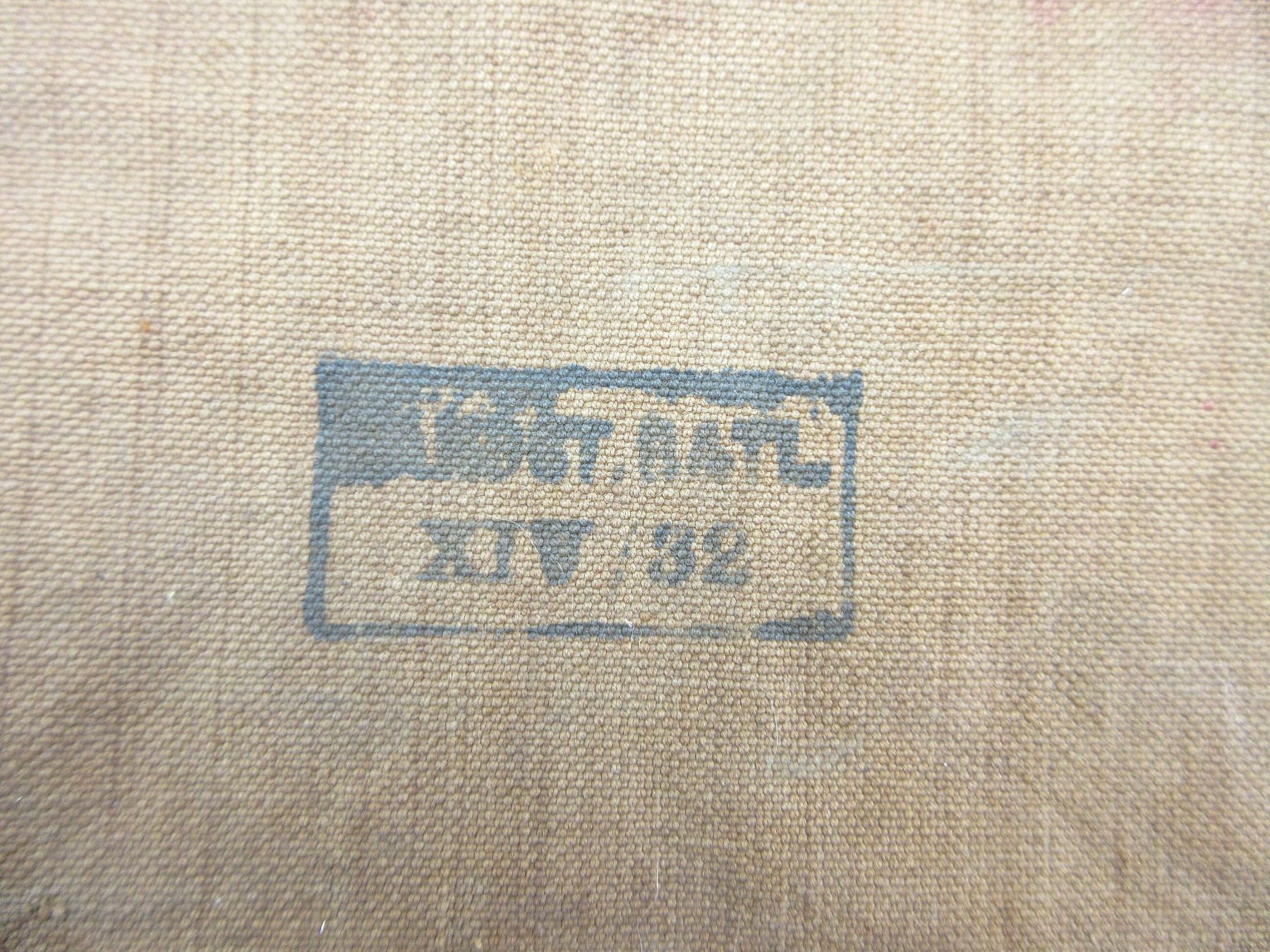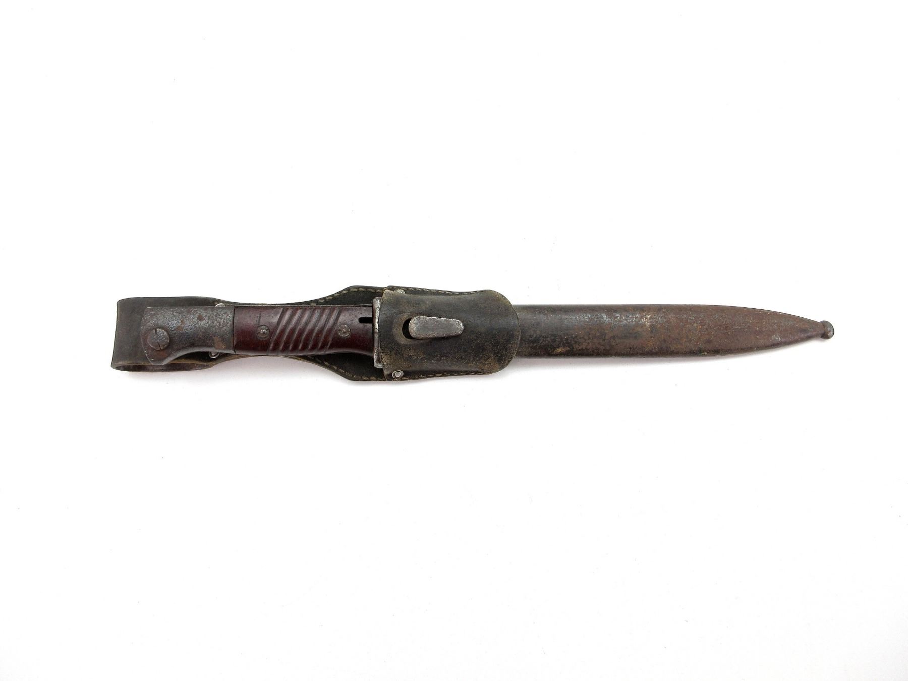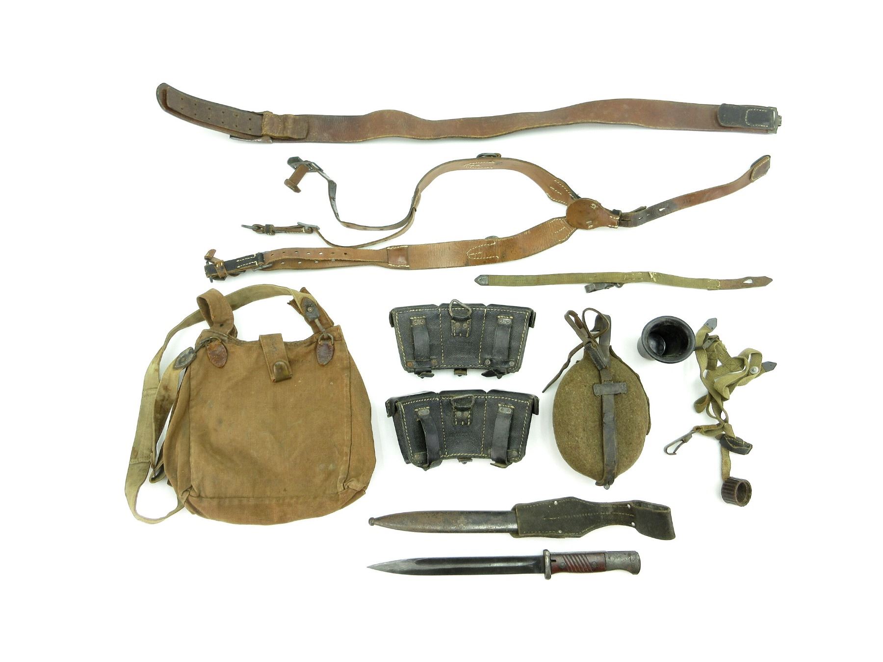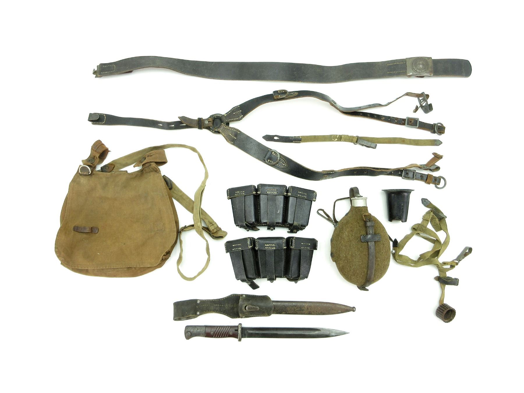 LOT INCLUDES; (1) METAL CANTEEN WITH FELT COVER, BLACK POLYMER CUP & LEATHER CARRIER, CAP MARKED: "D.H.W.40", METAL CLIP ON LEATHER CARRIER MARKED: "G. A., M ??", NO VISIBLE MARKINGS ON LEATHER, SHOWS AGE / WEAR, NO VISIBLE MARKINGS ON BLACK POLYMER CUP, (2) BLACK LEATHER AMMO POUCHES, BOTH MARKED: "B.NR. 0/0560/0101", STEEL FITTINGS, TWO BELT LOOPS, (1) TAN CANVAS BREAD BAG WITH SHOULDER STRAP, BAG MARKED: "?????.?&TL, XIV 32", "?.J.A.????17" & OTHER FAINT / UN-CLEAR MARKINGS, METAL FITTINGS, ONE BUTTON MISSING, SHOWS AGE / WEAR / TEAR, (1) BROWN / BLACK LEATHER BELT WITH STEEL BUCKLE, STEEL BELT BUCKLE MARKED: "IK??" & "GOTT MIT UNS" WITH EAGLE CARRYING SWASTIKA SYMBOL, METAL CLIP ON OTHER-SIDE MARKED: "D&C", LEATHER END MARKED: "JUL????, 1944, LUD????" & "105", SHOWS AGE / WEAR / SLIGHT TEAR, OAL APPROX. 38.5", (1) M1884/98 3RD PATTERN BAYONET, FOR USE WITH THE 8MM MAUSER KAR 98K RIFLE, RICASSO MARKED: "3871" OVER "WW", OTHER-SIDE MARKED: "43ASW", WITH FLASHGUARD, 2-PIECE BAKELITE GRIP, METAL POMMEL, NO VISIBLE MARKINGS, SOME PITTING ON POMMEL, STEEL SCABBARD WITH LEATHER FROG, SCABBARD MARKED: "3871" & "43ASW", BALL TIP HAS FAINT / UN-CLEAR MARKING, NO VISIBLE MARKINGS ON FROG, BLADE APPROX. 10", OAL APPROX. 15 1/8", (1) SET OF BROWN / BLACK LEATHER Y-STRAPS, VARIOUS INK STAMPS, METAL FITTINGS, METAL CLIPS MARKED: "D&C", SHOWS AGE / WEAR, OAL APPROX. 36.5" & (1) TAN CANVAS / LEATHER CANTEEN CARRIER WITH CANTEEN CAP, MARKED: "DRP ANG, HRE 44", "SHB" & VARIOUS OTHER MARKINGS ON METAL FITTINGS, SHOWS AGE / WEAR. SEE PHOTOS.
