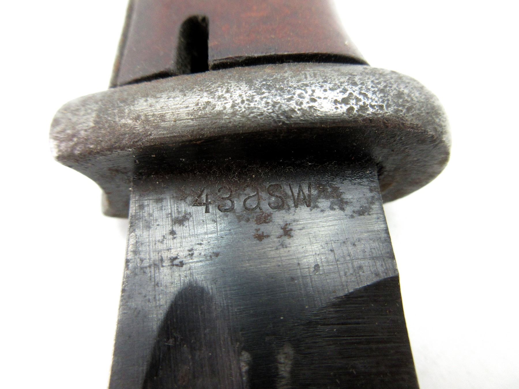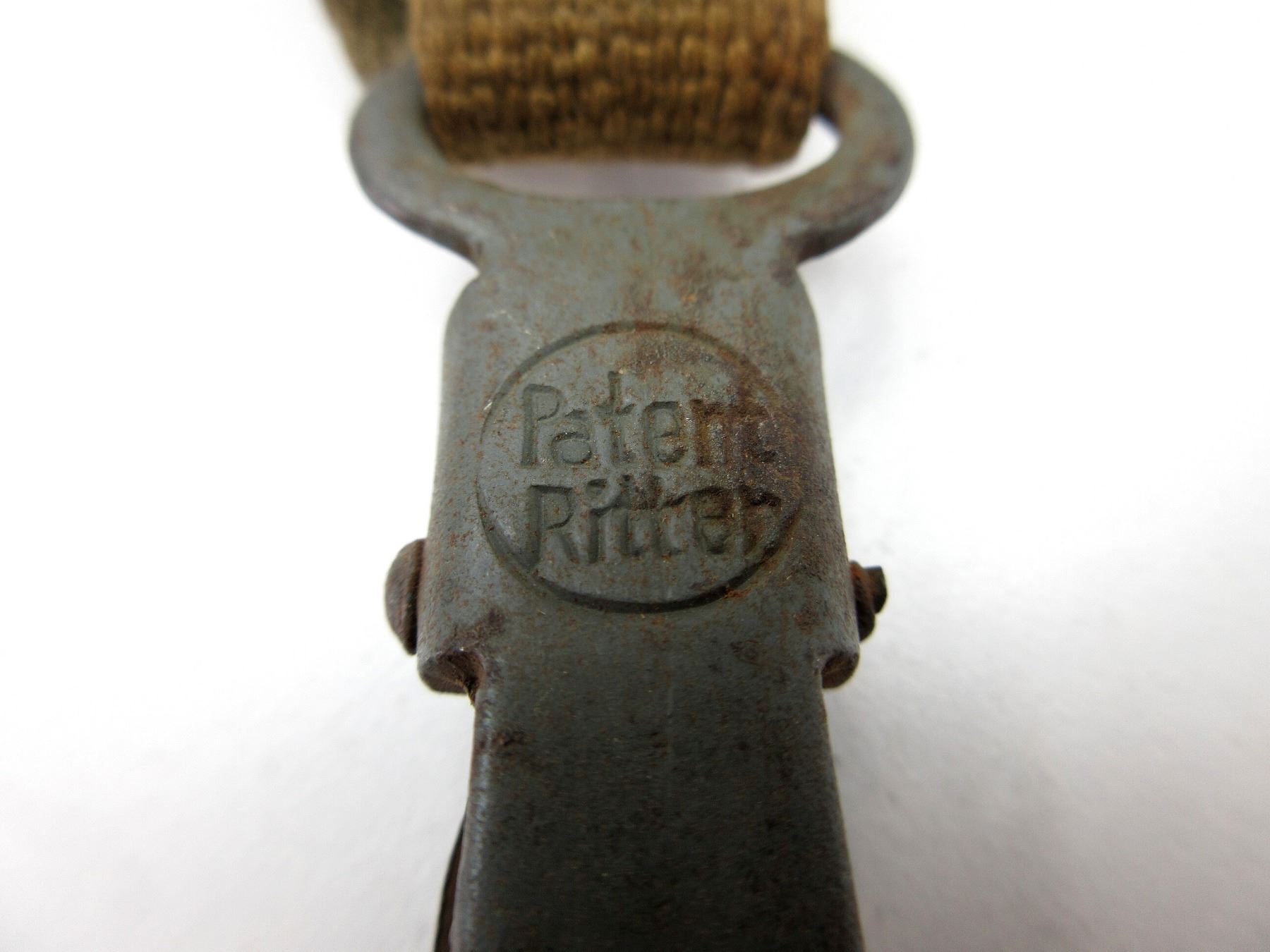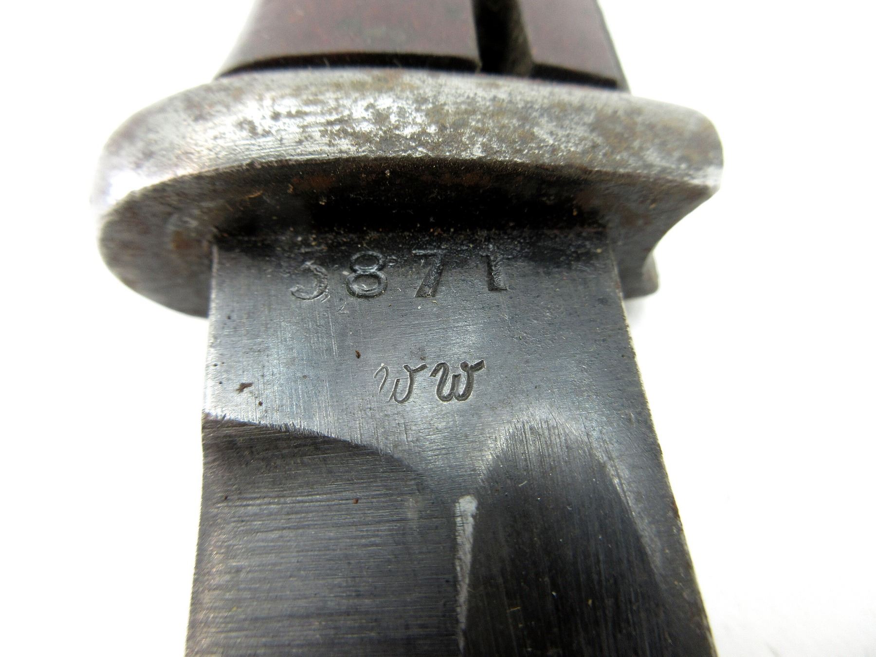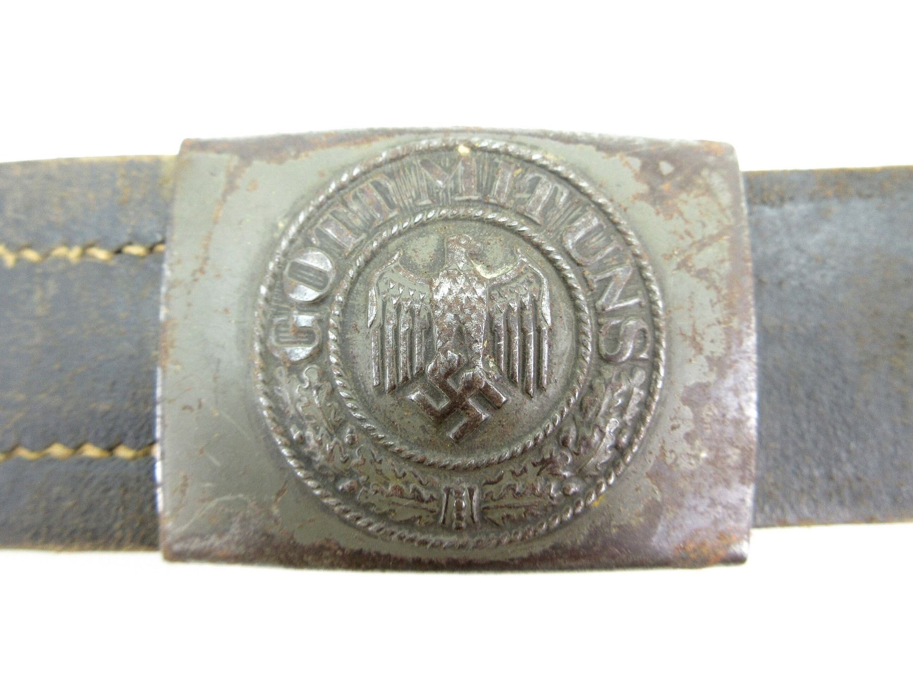 LOT INCLUDES; (1) METAL CANTEEN WITH FELT COVER, BLACK POLYMER CUP & LEATHER CARRIER, CAP MARKED: "D.H.W.40", METAL CLIP ON LEATHER CARRIER MARKED: "G. A., M ??", NO VISIBLE MARKINGS ON LEATHER, SHOWS AGE / WEAR, NO VISIBLE MARKINGS ON BLACK POLYMER CUP, (2) BLACK LEATHER AMMO POUCHES, BOTH MARKED: "B.NR. 0/0560/0101", STEEL FITTINGS, TWO BELT LOOPS, (1) TAN CANVAS BREAD BAG WITH SHOULDER STRAP, BAG MARKED: "?????.?&TL, XIV 32", "?.J.A.????17" & OTHER FAINT / UN-CLEAR MARKINGS, METAL FITTINGS, ONE BUTTON MISSING, SHOWS AGE / WEAR / TEAR, (1) BROWN / BLACK LEATHER BELT WITH STEEL BUCKLE, STEEL BELT BUCKLE MARKED: "IK??" & "GOTT MIT UNS" WITH EAGLE CARRYING SWASTIKA SYMBOL, METAL CLIP ON OTHER-SIDE MARKED: "D&C", LEATHER END MARKED: "JUL????, 1944, LUD????" & "105", SHOWS AGE / WEAR / SLIGHT TEAR, OAL APPROX. 38.5", (1) M1884/98 3RD PATTERN BAYONET, FOR USE WITH THE 8MM MAUSER KAR 98K RIFLE, RICASSO MARKED: "3871" OVER "WW", OTHER-SIDE MARKED: "43ASW", WITH FLASHGUARD, 2-PIECE BAKELITE GRIP, METAL POMMEL, NO VISIBLE MARKINGS, SOME PITTING ON POMMEL, STEEL SCABBARD WITH LEATHER FROG, SCABBARD MARKED: "3871" & "43ASW", BALL TIP HAS FAINT / UN-CLEAR MARKING, NO VISIBLE MARKINGS ON FROG, BLADE APPROX. 10", OAL APPROX. 15 1/8", (1) SET OF BROWN / BLACK LEATHER Y-STRAPS, VARIOUS INK STAMPS, METAL FITTINGS, METAL CLIPS MARKED: "D&C", SHOWS AGE / WEAR, OAL APPROX. 36.5" & (1) TAN CANVAS / LEATHER CANTEEN CARRIER WITH CANTEEN CAP, MARKED: "DRP ANG, HRE 44", "SHB" & VARIOUS OTHER MARKINGS ON METAL FITTINGS, SHOWS AGE / WEAR. SEE PHOTOS.