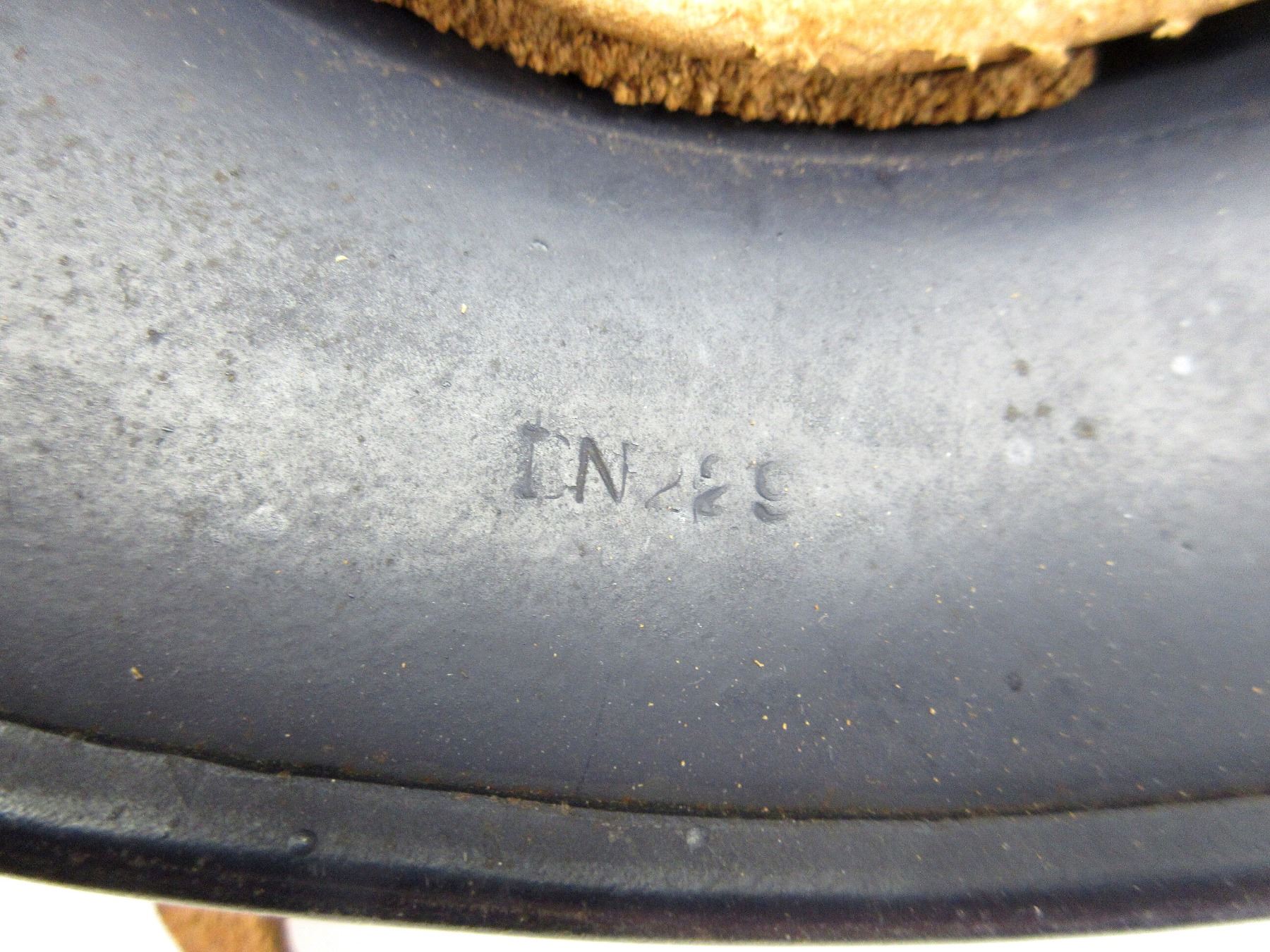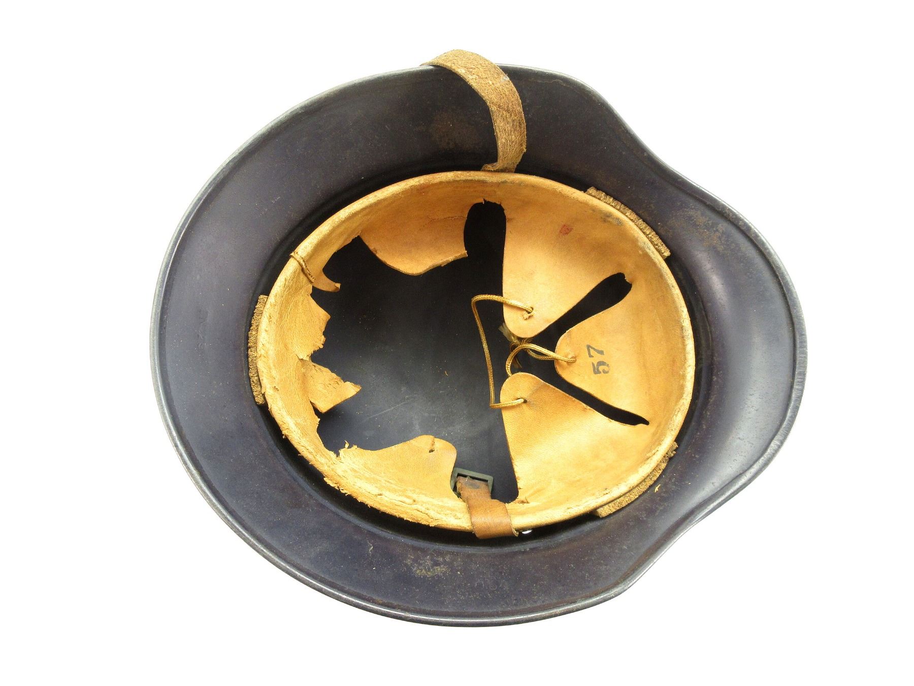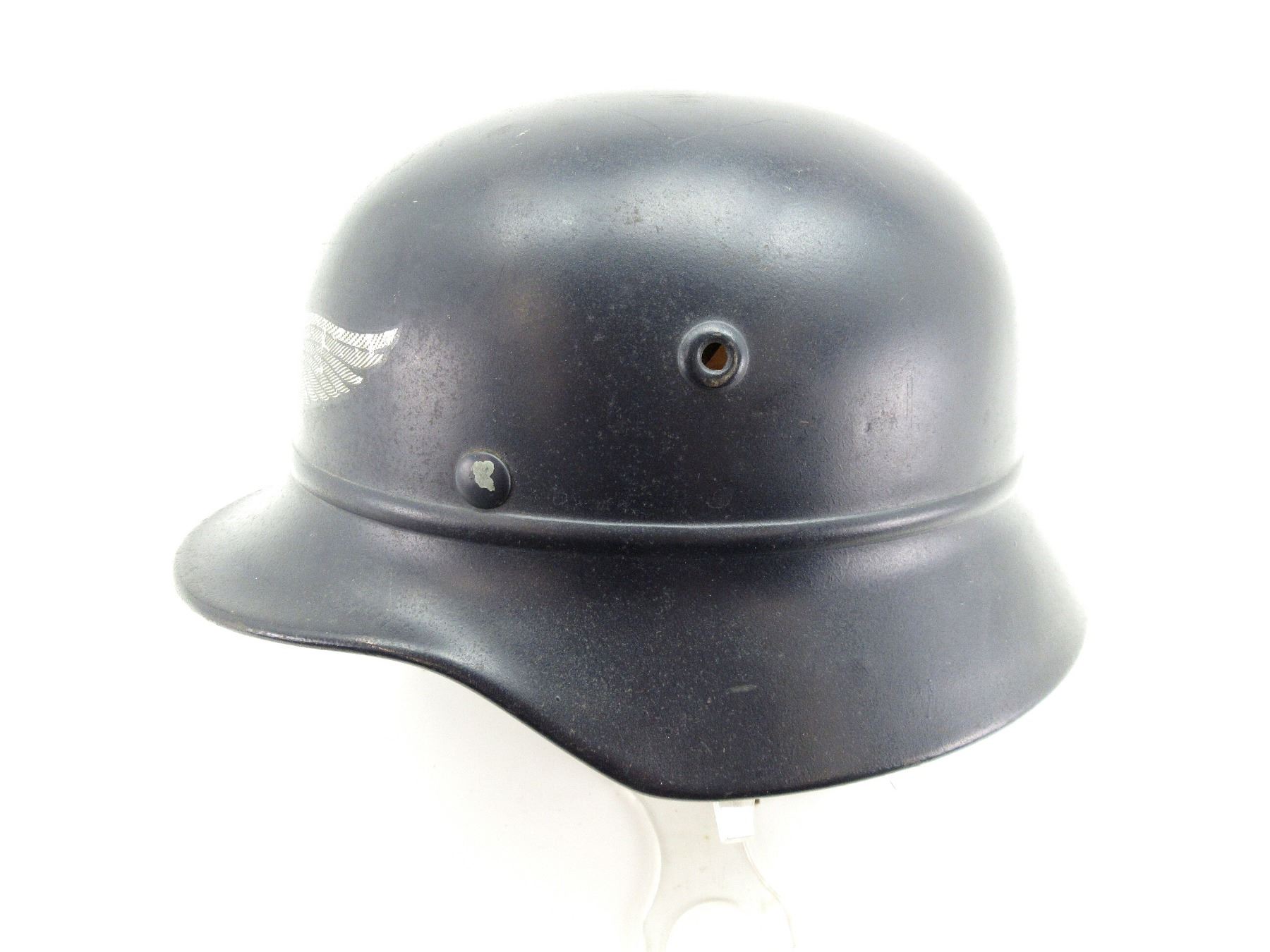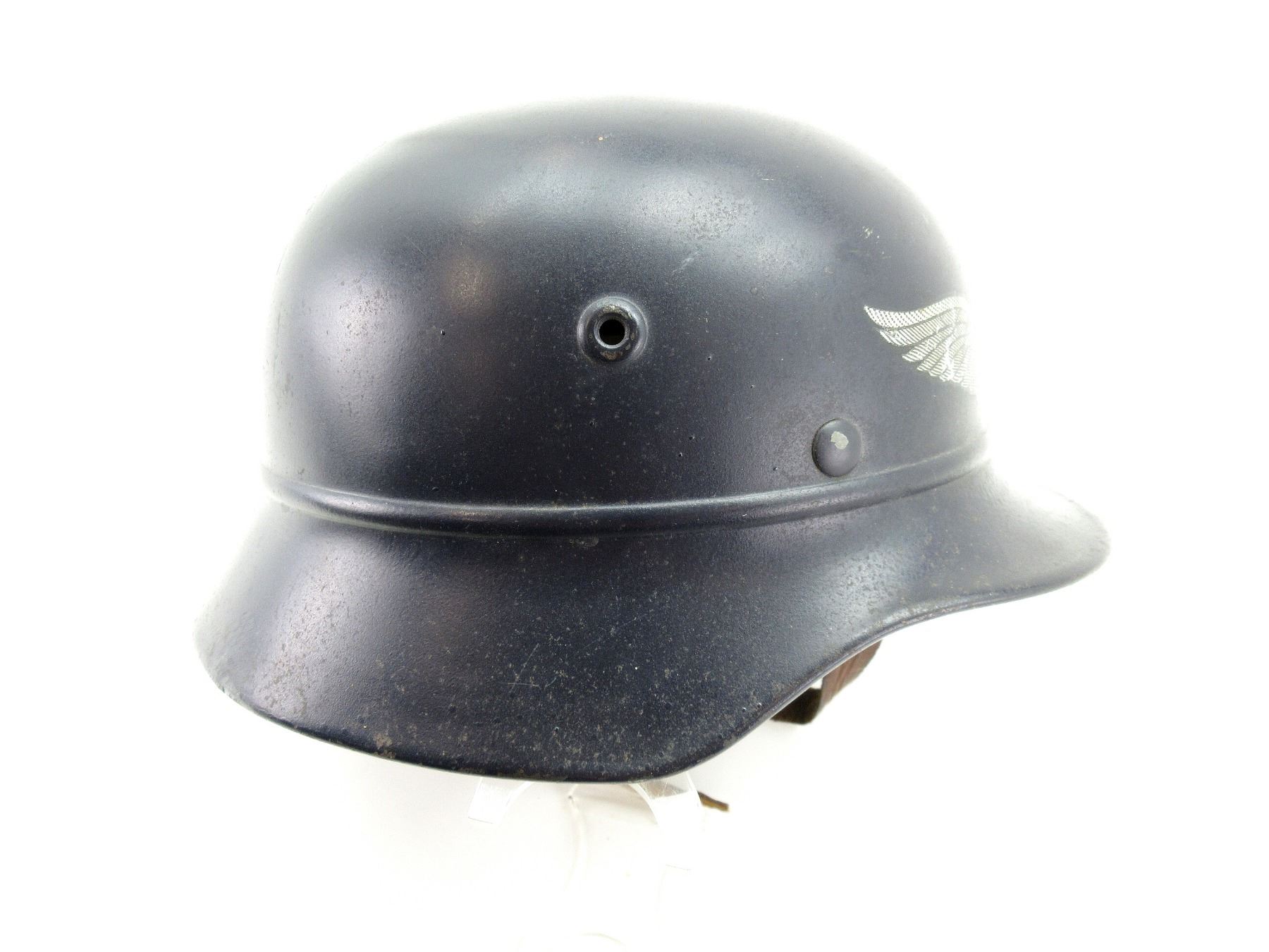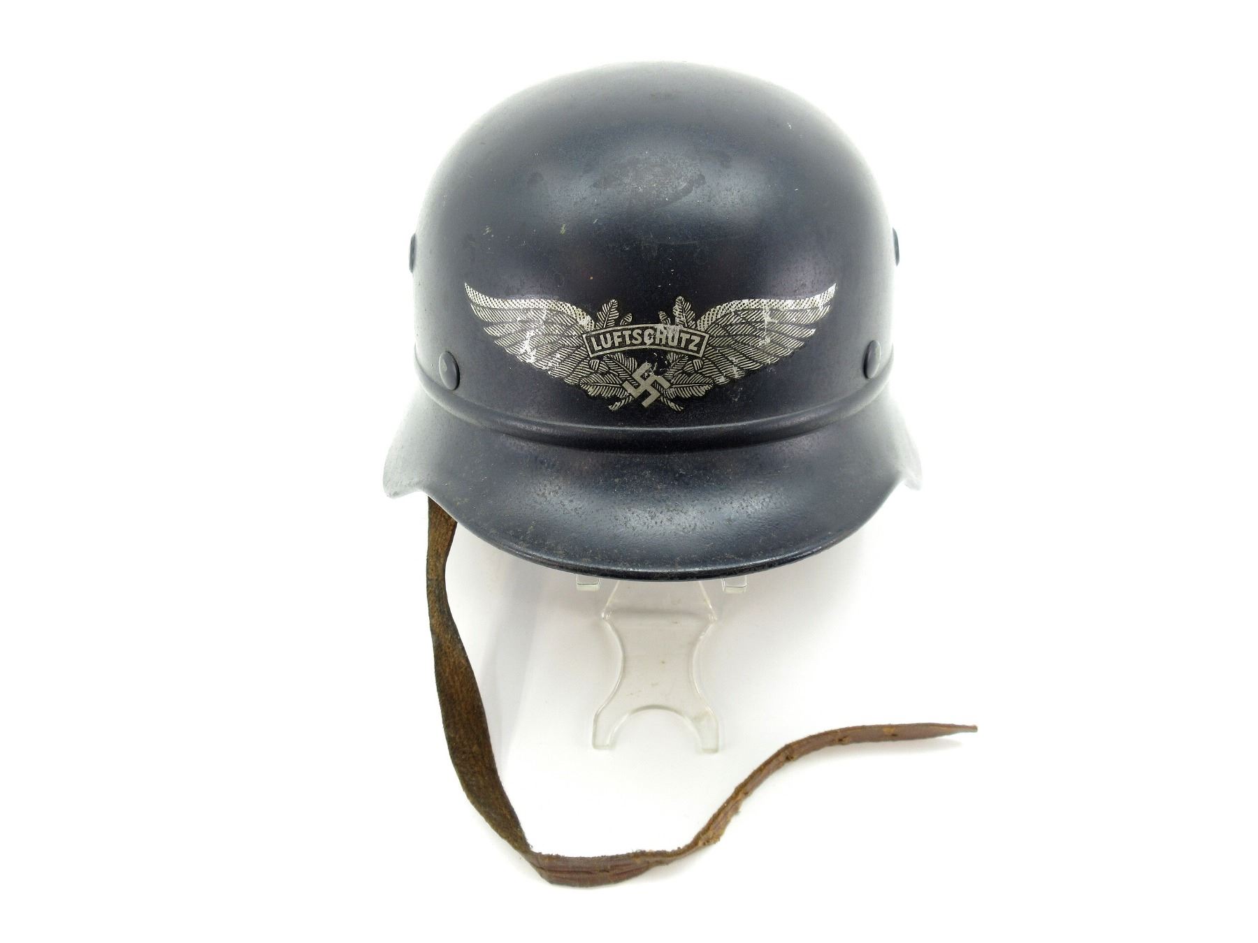 (1) DARK BLUE PAINTED STEEL HELMET WITH LUFTSCHUTZ DECAL ON FRONT, ROLLED EDGE, BROWN LEATHER HEAD LINER, LEATHER IS SOFT, SIZE 57, LINER SHOWS AGE / WEAR / TEAR, BROWN LEATHER CHIN STRAP WITH BUCKLE, LEATHER IS SOFT, LEFT-SIDE OF SKIRT MARKED: "Q64", REAR SKIRT MARKED: "DN 229". SEE PHOTOS.