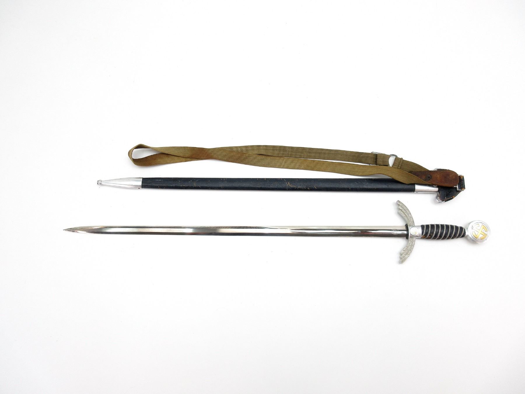 (1) STRAIGHT DOUBLE-EDGED PARTIALLY FULLERED BLADE, MARKED: "PAUL WEYERSBERG & CO., SOLINGEN" MAKER'S MARK, PEBBLED LEATHER WASHER / BUFFER PAD, WING SHAPED METAL CROSS-PIECE WITH GOLD COLOURED SWASTIKA ON EITHER-SIDE, BLACK WIRE WRAPPED GRIP, TWISTED WRAPPED WIRE, METAL POMMEL WITH GOLD COLOURED SWASTIKA ON EITHER-SIDE, OAK LEAVES / ACORN DESIGN ON EDGE OF POMMEL, BLUE LEATHER & METAL SCABBARD, CANVAS / LEATHER HANGER, TWO HANGER LOOPS, NO VISIBLE MARKINGS ON SCABBARD OR HANGER, BLADE APPROX. 28 3/8" & OAL APPROX. 35 3/8". SEE PHOTOS.