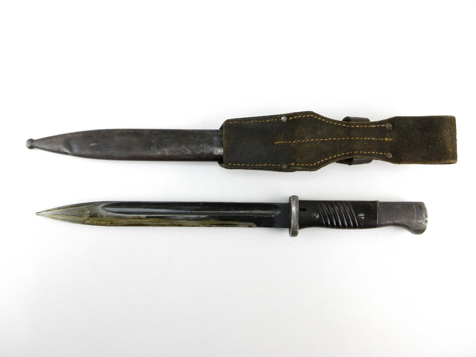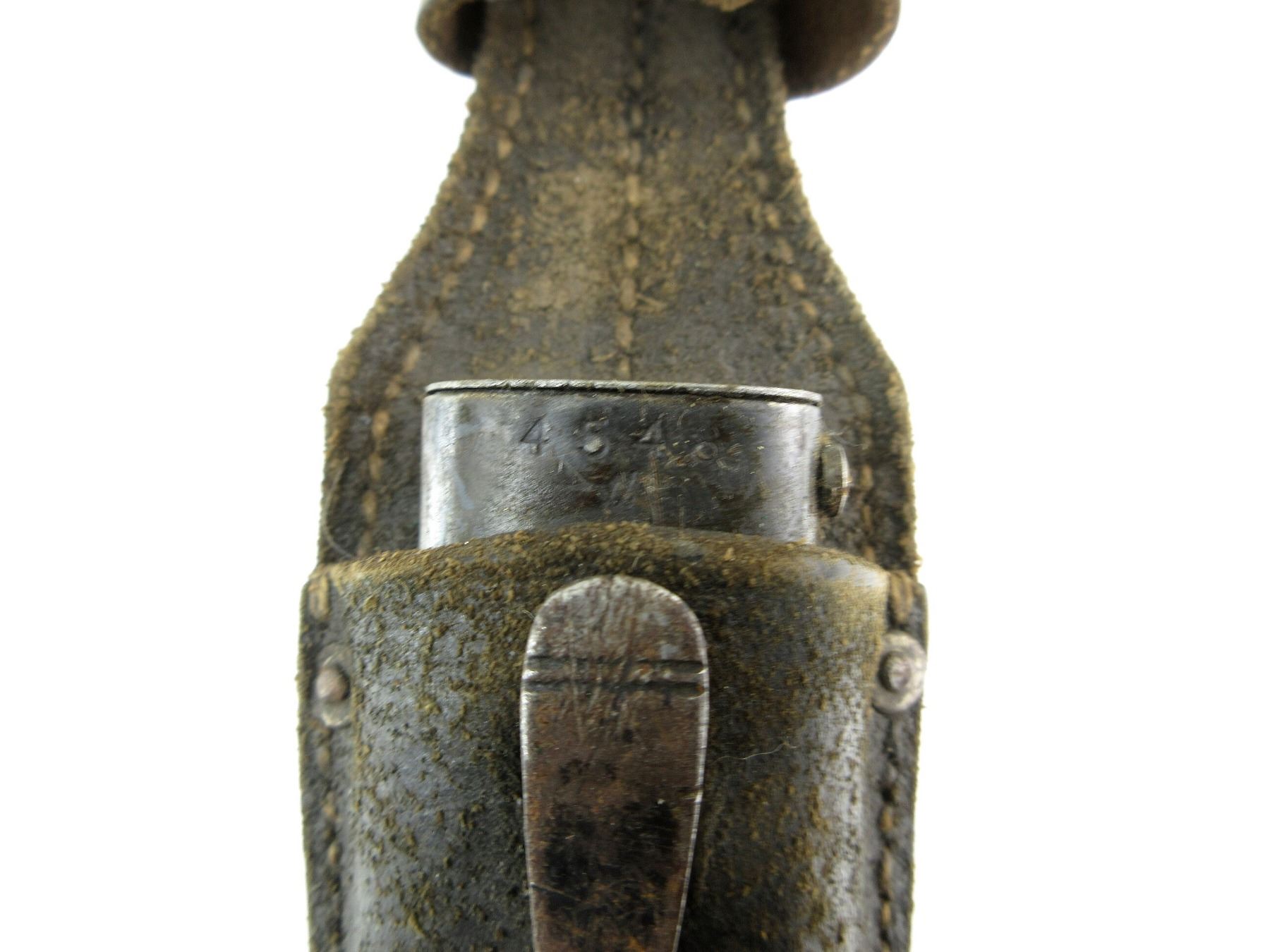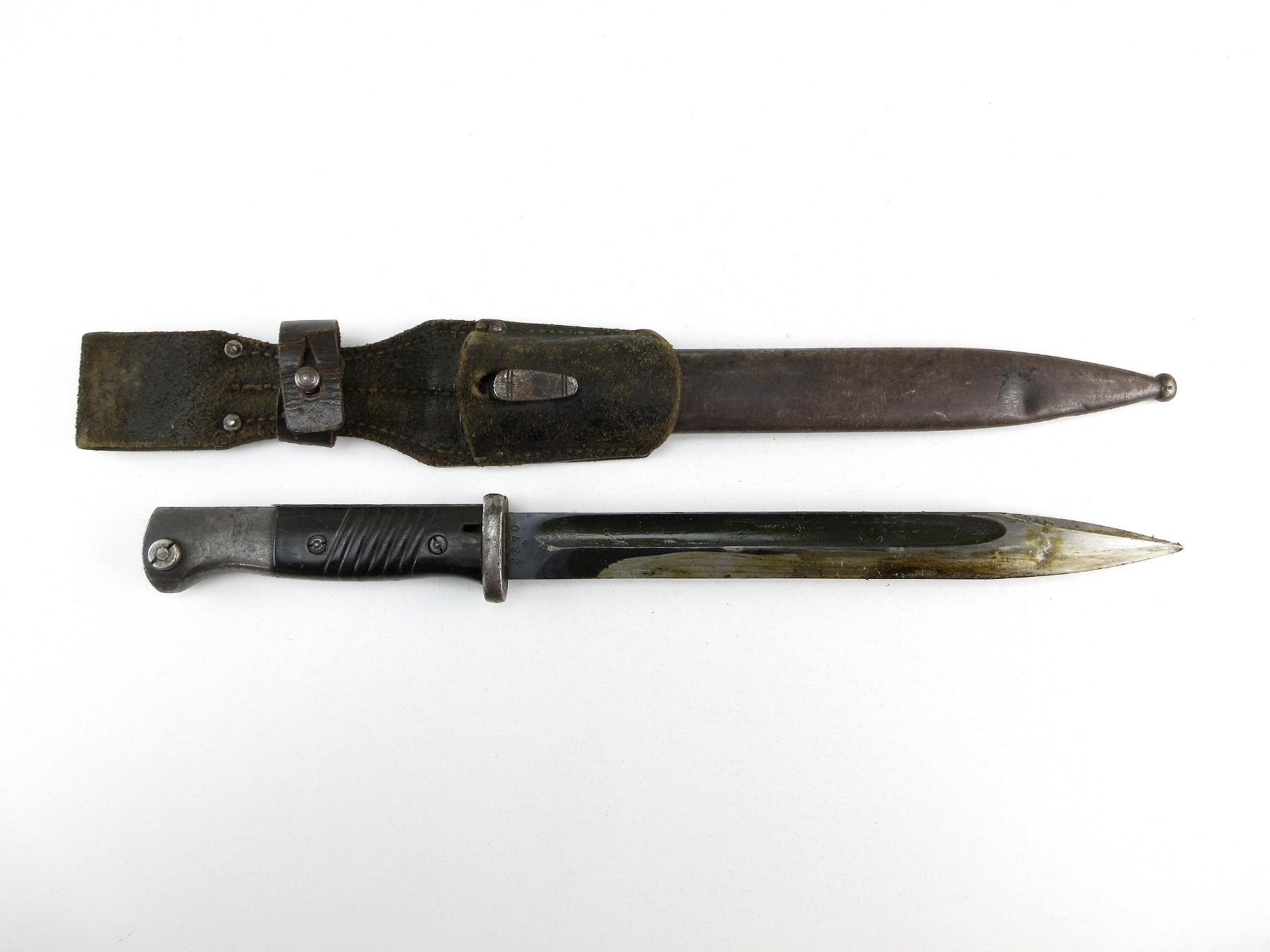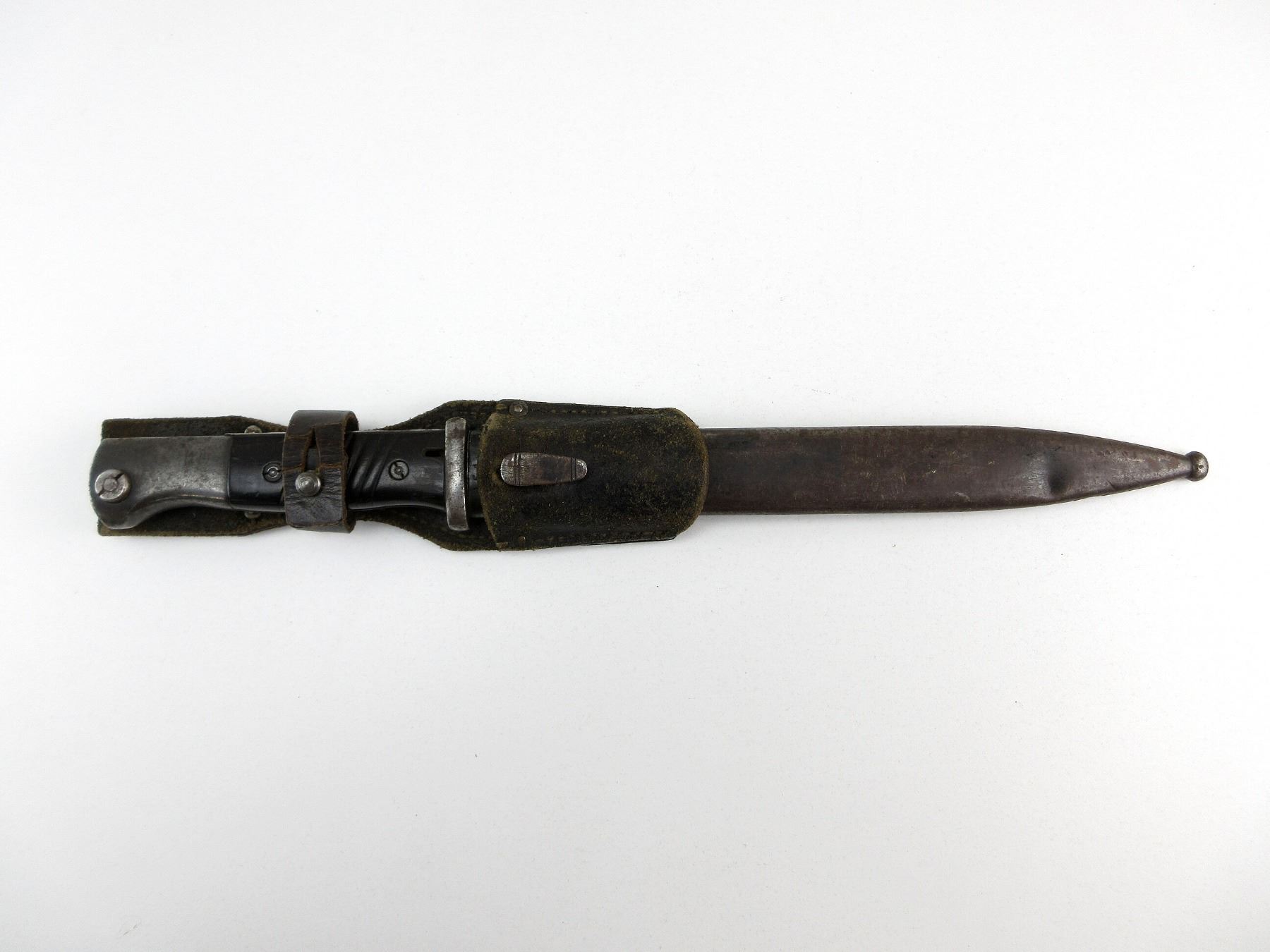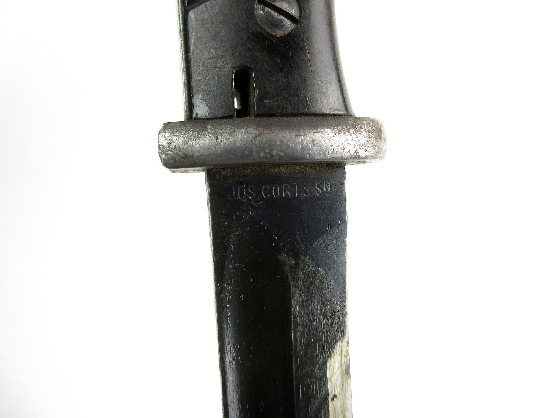 (1) FITS 8MM K98 MAUSER RIFLES, RICASSO MARKED: "2270, B", OTHER-SIDE MARKED: "JOS. CORTS SN", BLADE SPINE MARKED: "40", WITH FLASHGUARD, 2-PIECE PLASTIC GRIP, METAL POMMEL, DOUBLE STAMPED: "WAA25?", CATCH RELEASE BUTTON STAMPED: "WAA???", STEEL SCABBARD WITH LEATHER FROG, NEAR THROAT MARKED: "4548, A" & "S/155, 36", FAINT PROOF MARKS ON BALL-TIP, NO VISIBLE MARKINGS ON LEATHER FROG, BLADE APPROX. 10" & OAL APPROX. 15 1/8". SEE PHOTOS.