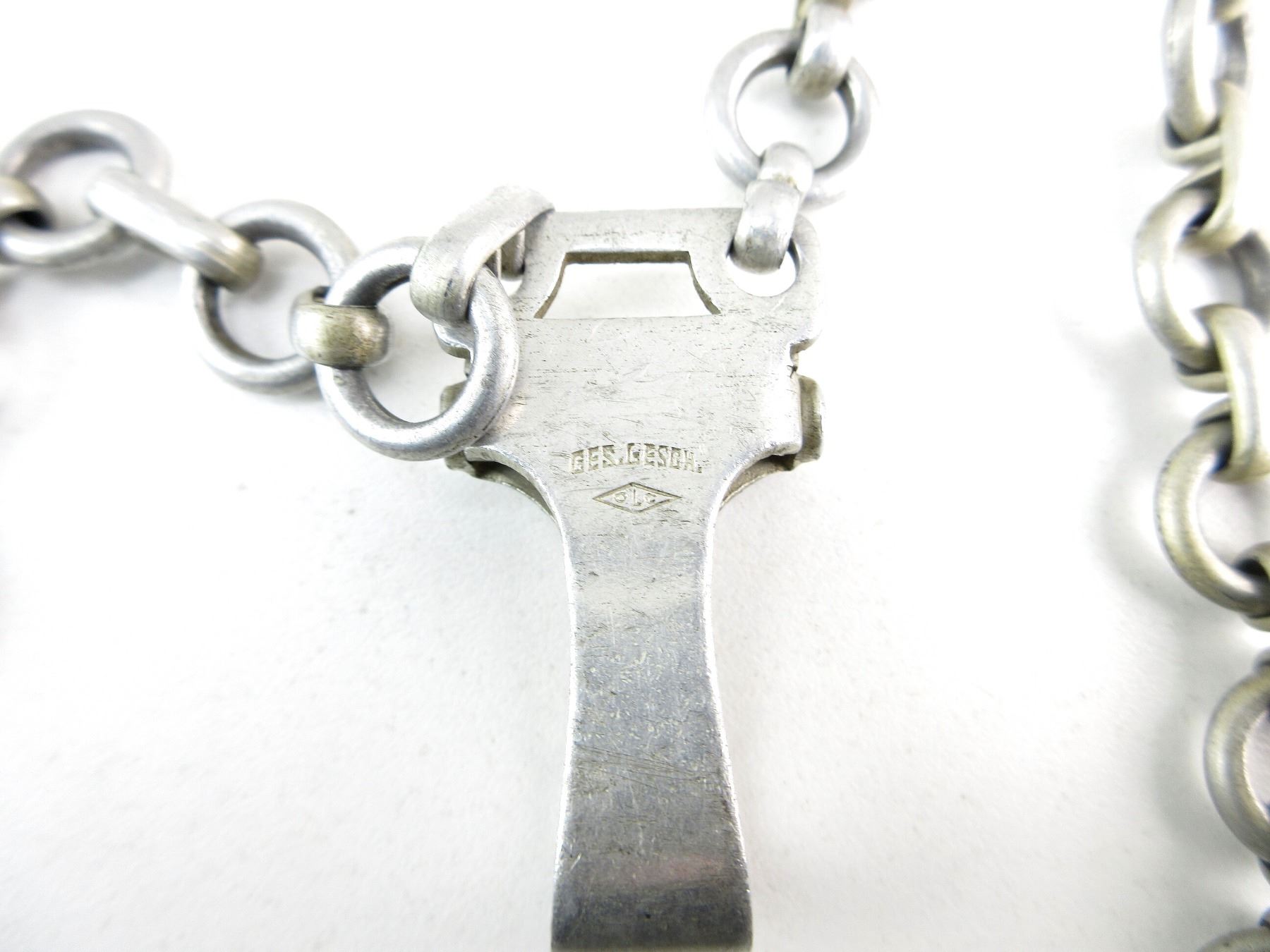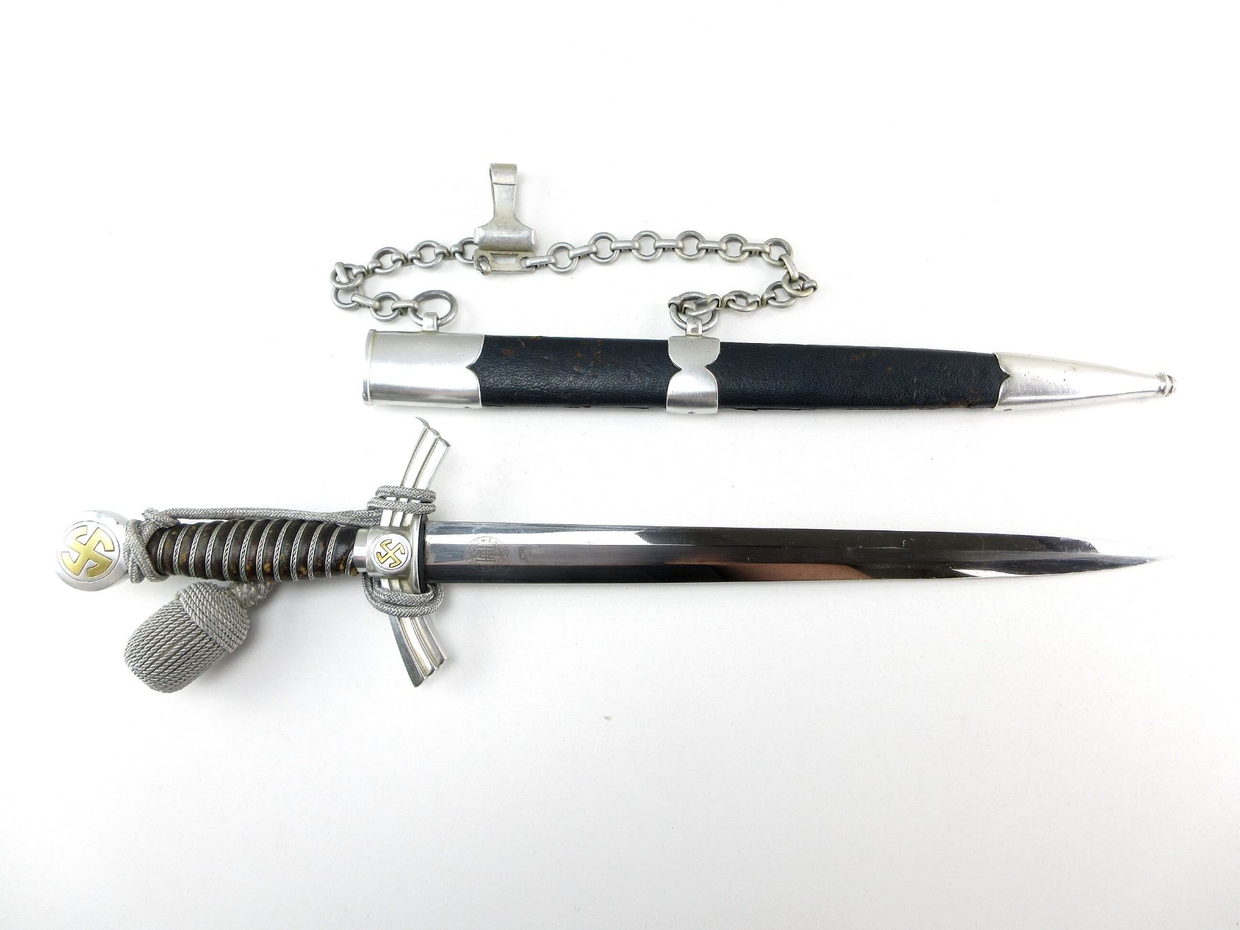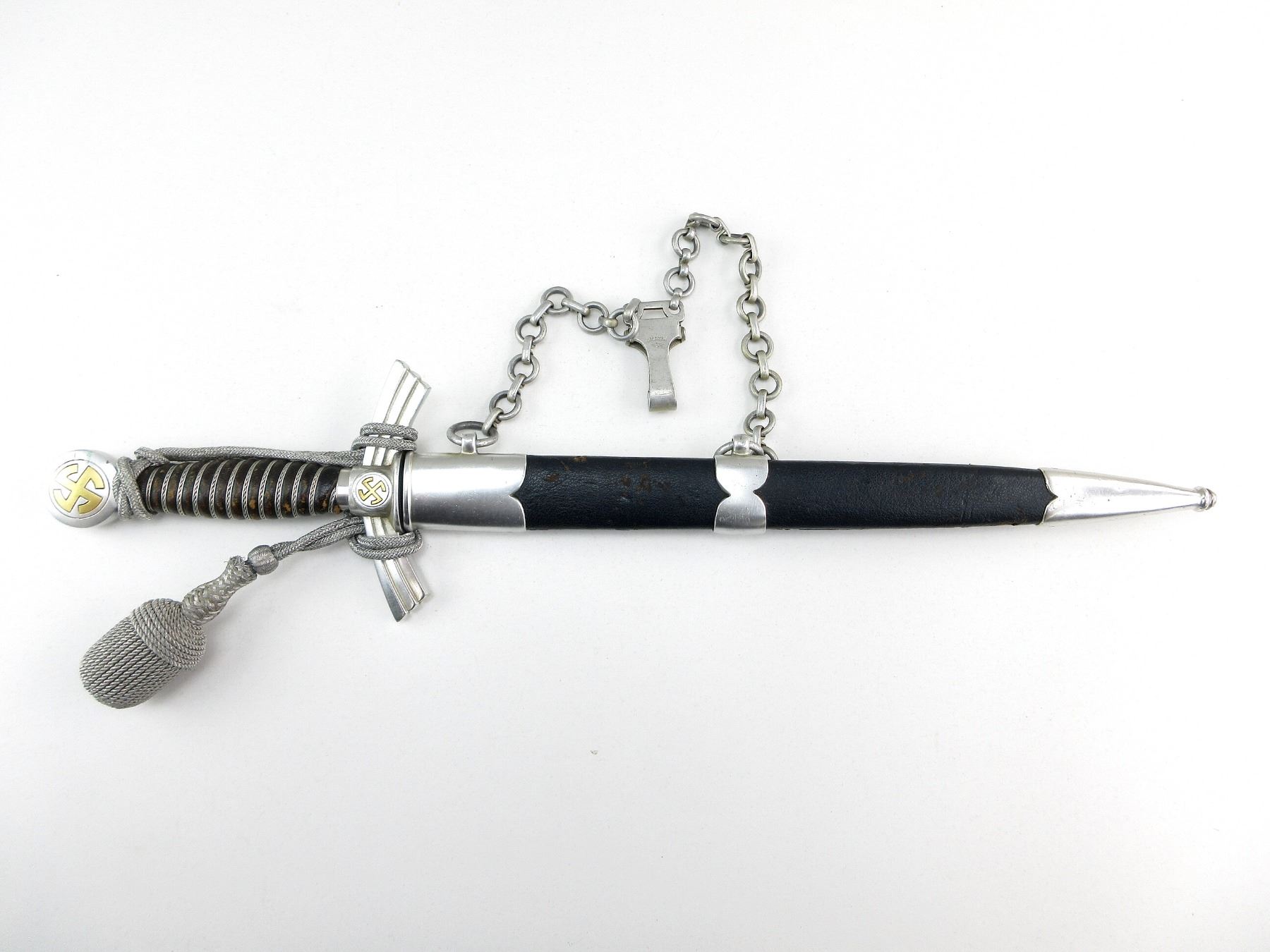 (1) 1ST MODEL AIRFORCE DAGGER, DOUBLE EDGED BLADE, RICASSO MARKED: "E. & F. HORSTER, SOLINGEN" MAKER'S MARK, BLACK PEBBLED LEATHER WASHER, CROSS-GUARD WITH SWASTIKA, LEATHER & WIRE WRAPPED GRIP, SILVER PORTAPEE, METAL CIRCULAR POMMEL WITH SWASTIKA, LEATHER & METAL SCABBARD WITH CHAIN HANGER, NO VISIBLE MARKINGS ON SCABBARD, CHAIN HOOK MARKED: "GES.GESGN." & "OLC" IN A DIAMOND, BLADE APPROX. 12.25" & OAL APPROX. 17 7/8". SEE PHOTOS.