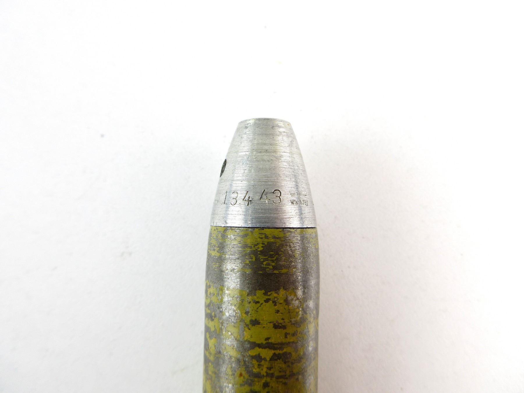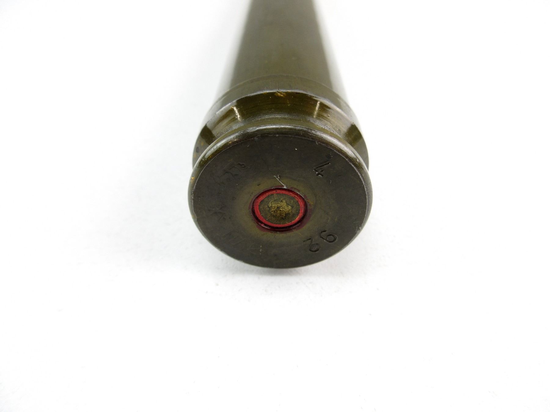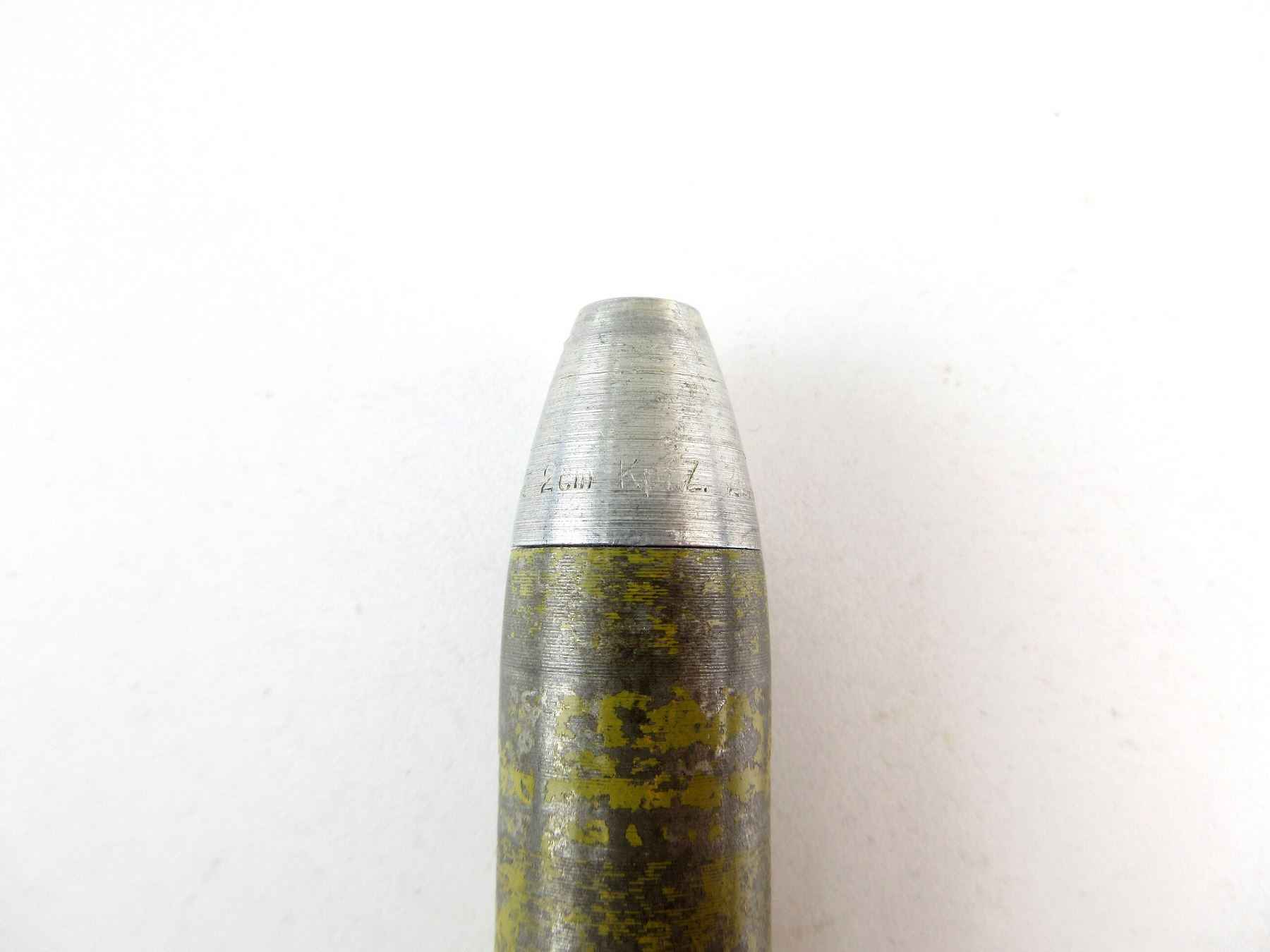 (1) STEEL CASING, STEEL YELLOW PAINTED PROJECTILE, COPPER BAND, FIRED PRIMER, PROJECTILE TIP MARKED: "CXH 134 43", EAGLE "WAA397", "2CM KPF.Z. ZERL FG", PROJECTILE BODY MARKED: "ASR 33B", EAGLE "WAA27" & "43", VARIOUS HAND-WRITTEN MARKINGS ON CASING BODY, CASING BOTTOM MARKED: "4, 92, AVU", STAR & EAGLE "WAA73", APPROX. 1 1/8" DIA. & OAL APPROX. 8". SEE PHOTOS.