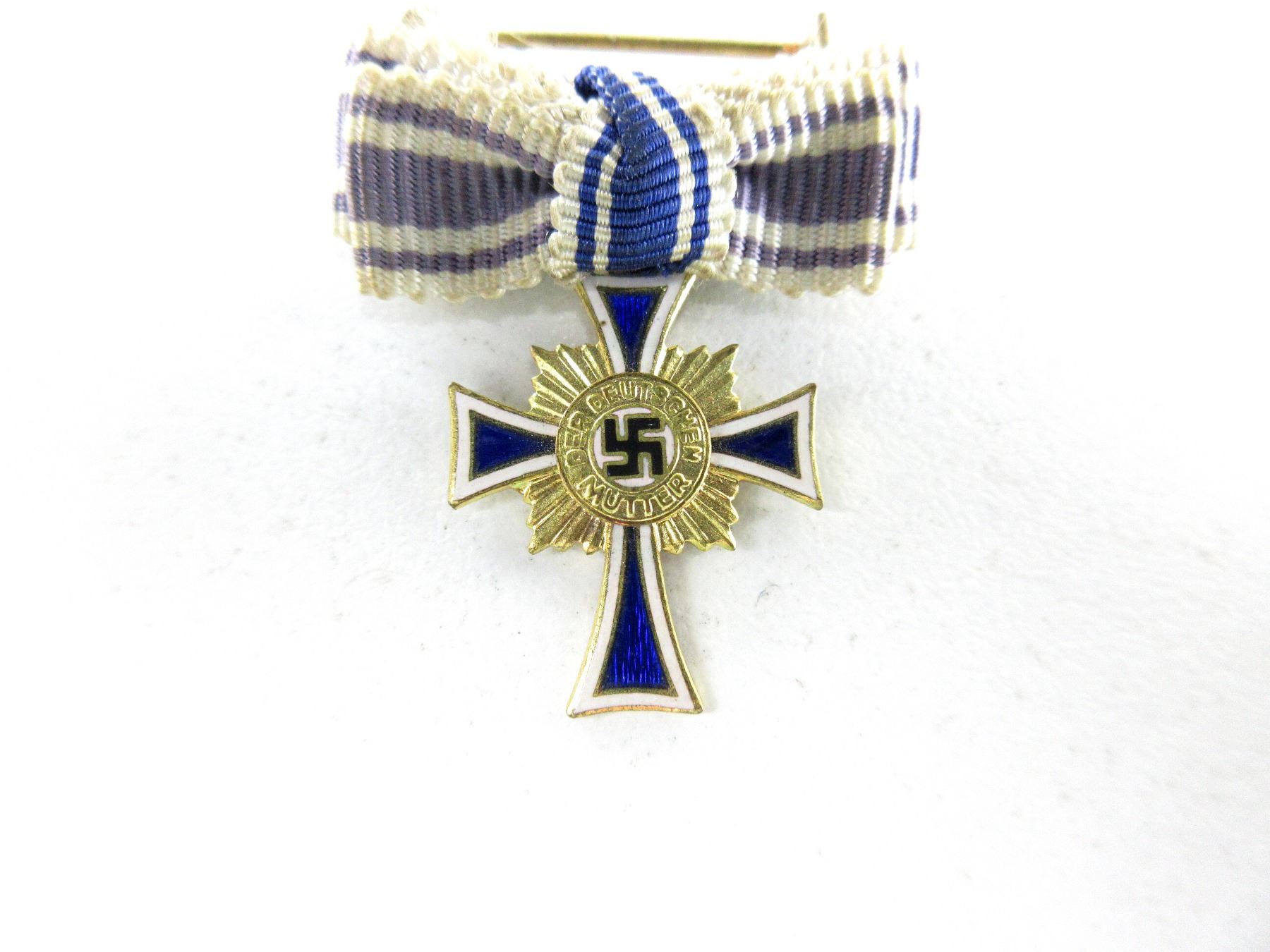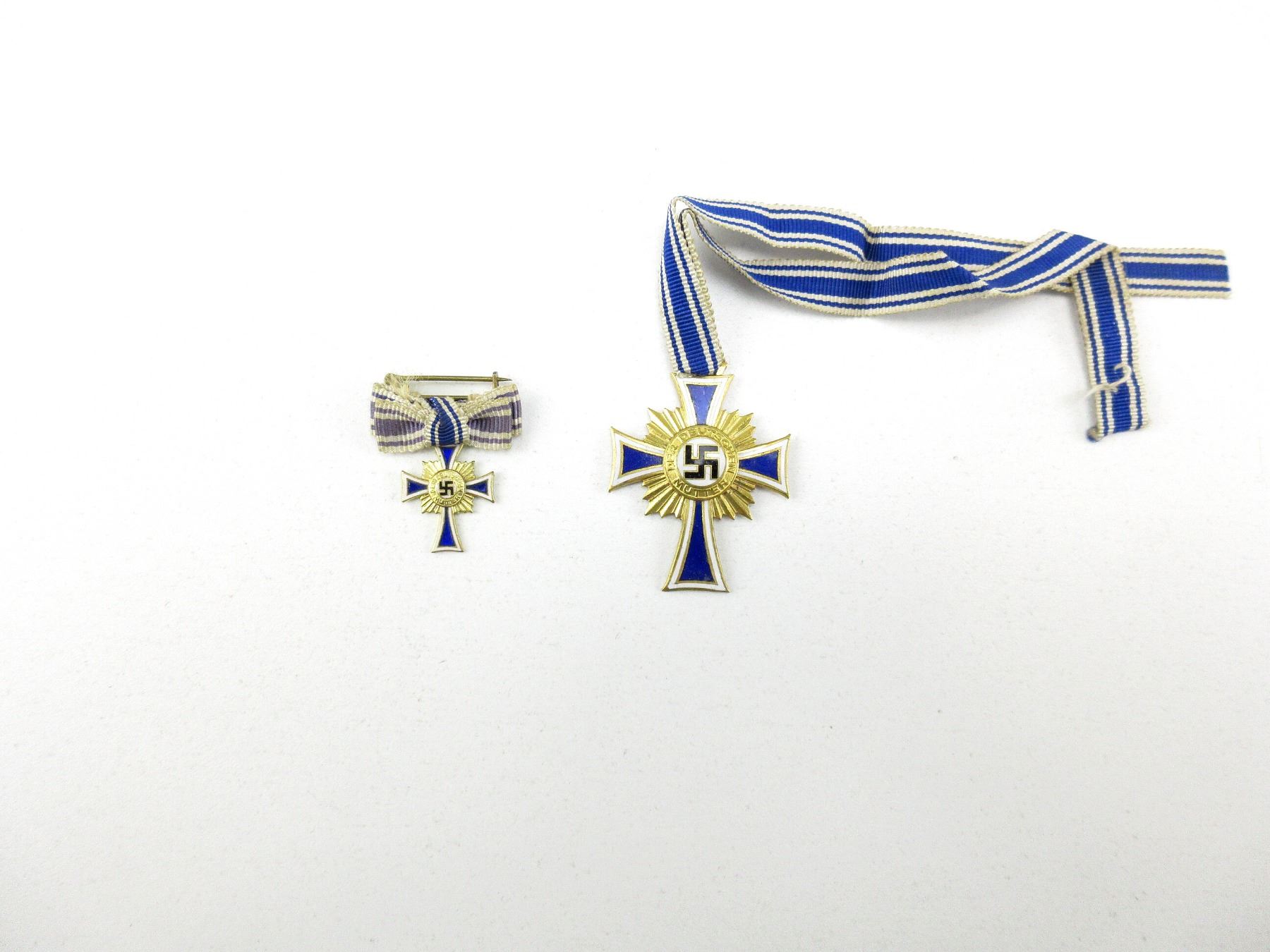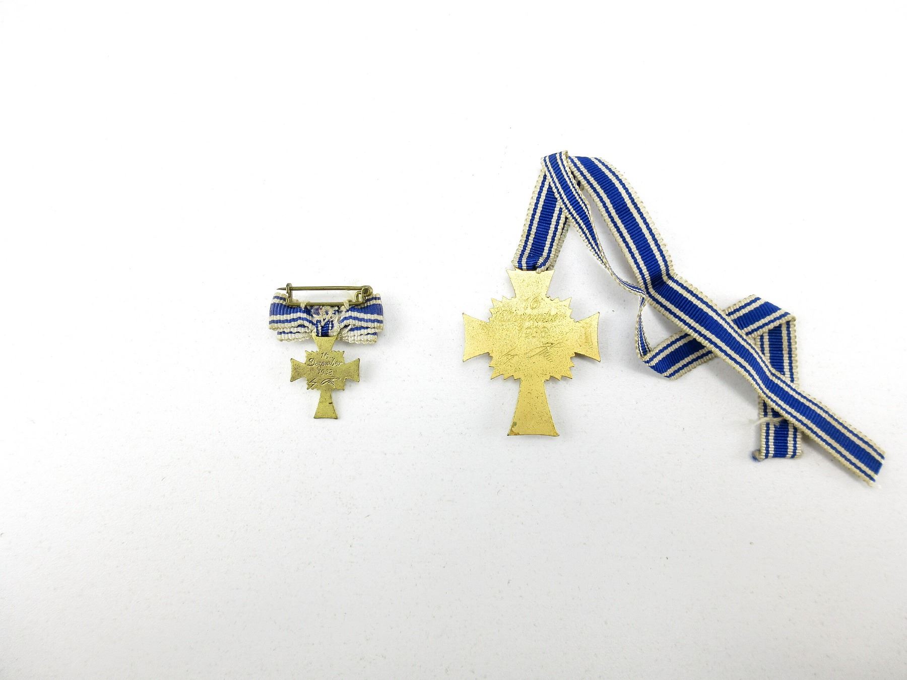 LOT INCLUDES: (1) MOTHER'S CROSS OF HONOUR GOLD MEDAL WITH RIBBON, BLUE / WHITE ENAMELED CROSS WITH SWASTIKA IN THE CENTER, AROUND SWASTIKA MARKED: "DER DEUTSCHEN MUTTER", GOLD STAR BEHIND CROSS, BACK MARKED: "16., DEZEMBER, 1938" WITH SIGNATURES, RIBBON DOESN'T GLOW UNDER BLACK LIGHT & (1) MOTHER'S CROSS OF HONOUR GOLD MINIATURE MEDAL WITH RIBBON & PIN BACKING, BLUE / WHITE ENAMELED CROSS WITH SWASTIKA IN THE CENTER, AROUND SWASTIKA MARKED: "DER DEUTSCHEN MUTTER", GOLD STAR BEHIND CROSS, BACK MARKED: "16., DEZEMBER, 1938" WITH SIGNATURES, RIBBON DOESN'T GLOW UNDER BLACK LIGHT. SEE PHOTOS.