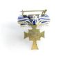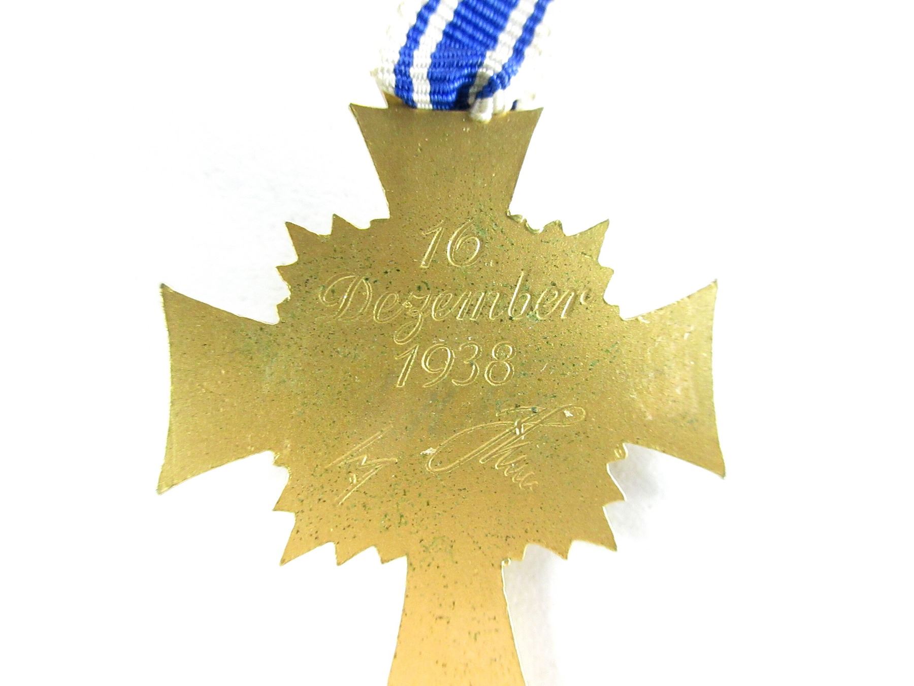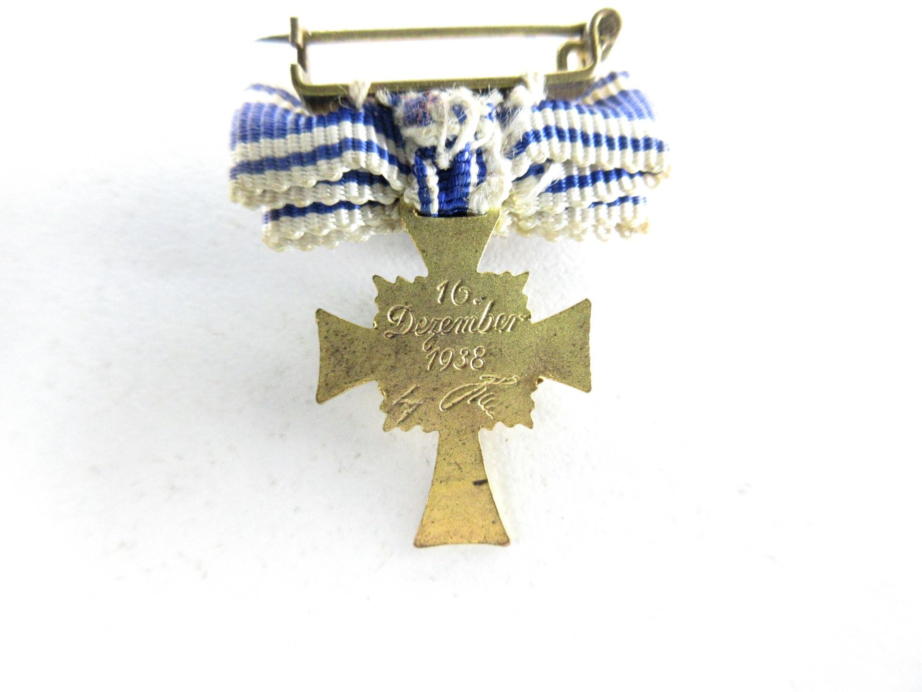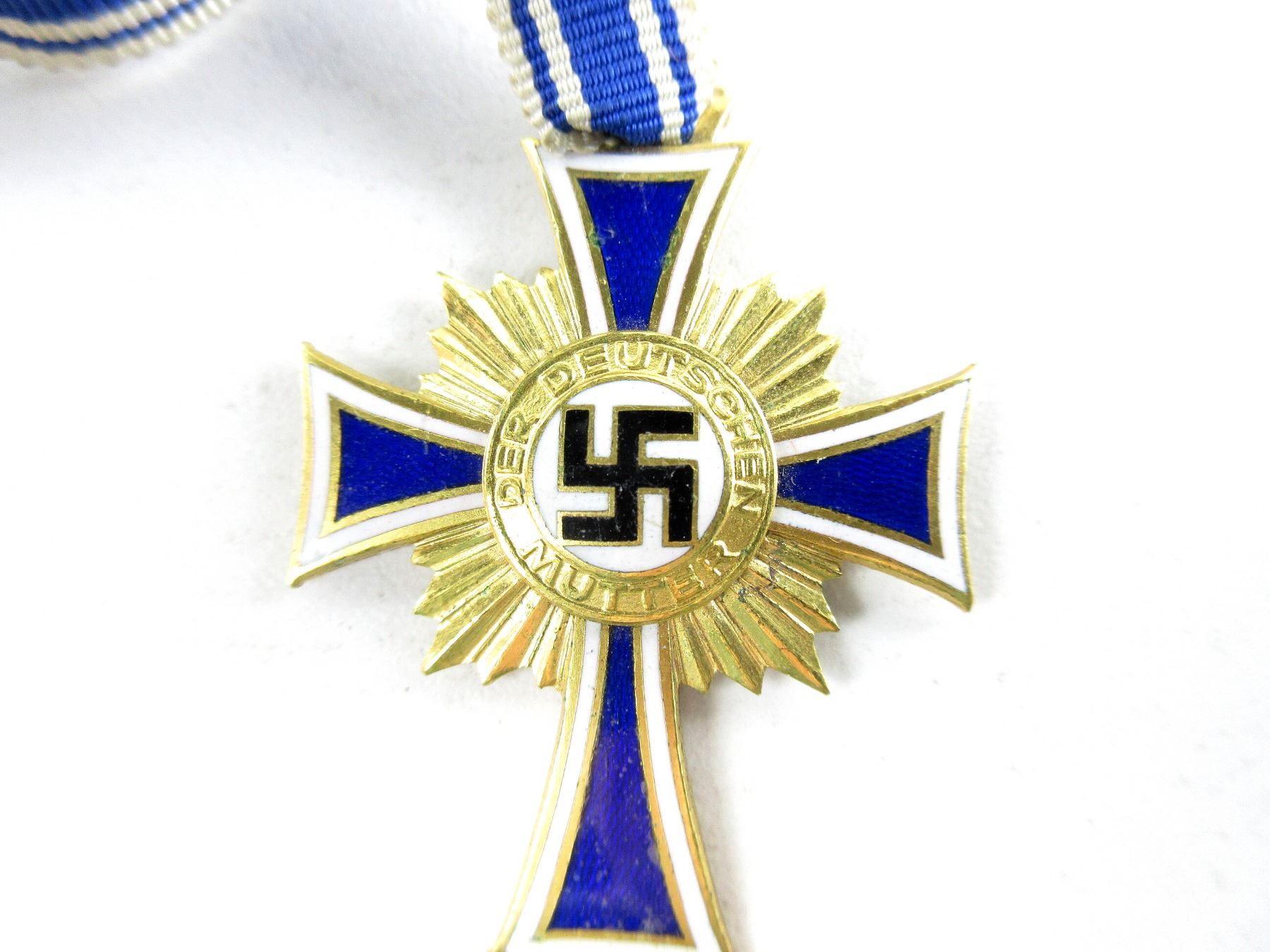 LOT INCLUDES: (1) MOTHER'S CROSS OF HONOUR GOLD MEDAL WITH RIBBON, BLUE / WHITE ENAMELED CROSS WITH SWASTIKA IN THE CENTER, AROUND SWASTIKA MARKED: "DER DEUTSCHEN MUTTER", GOLD STAR BEHIND CROSS, BACK MARKED: "16., DEZEMBER, 1938" WITH SIGNATURES, RIBBON DOESN'T GLOW UNDER BLACK LIGHT & (1) MOTHER'S CROSS OF HONOUR GOLD MINIATURE MEDAL WITH RIBBON & PIN BACKING, BLUE / WHITE ENAMELED CROSS WITH SWASTIKA IN THE CENTER, AROUND SWASTIKA MARKED: "DER DEUTSCHEN MUTTER", GOLD STAR BEHIND CROSS, BACK MARKED: "16., DEZEMBER, 1938" WITH SIGNATURES, RIBBON DOESN'T GLOW UNDER BLACK LIGHT. SEE PHOTOS.