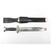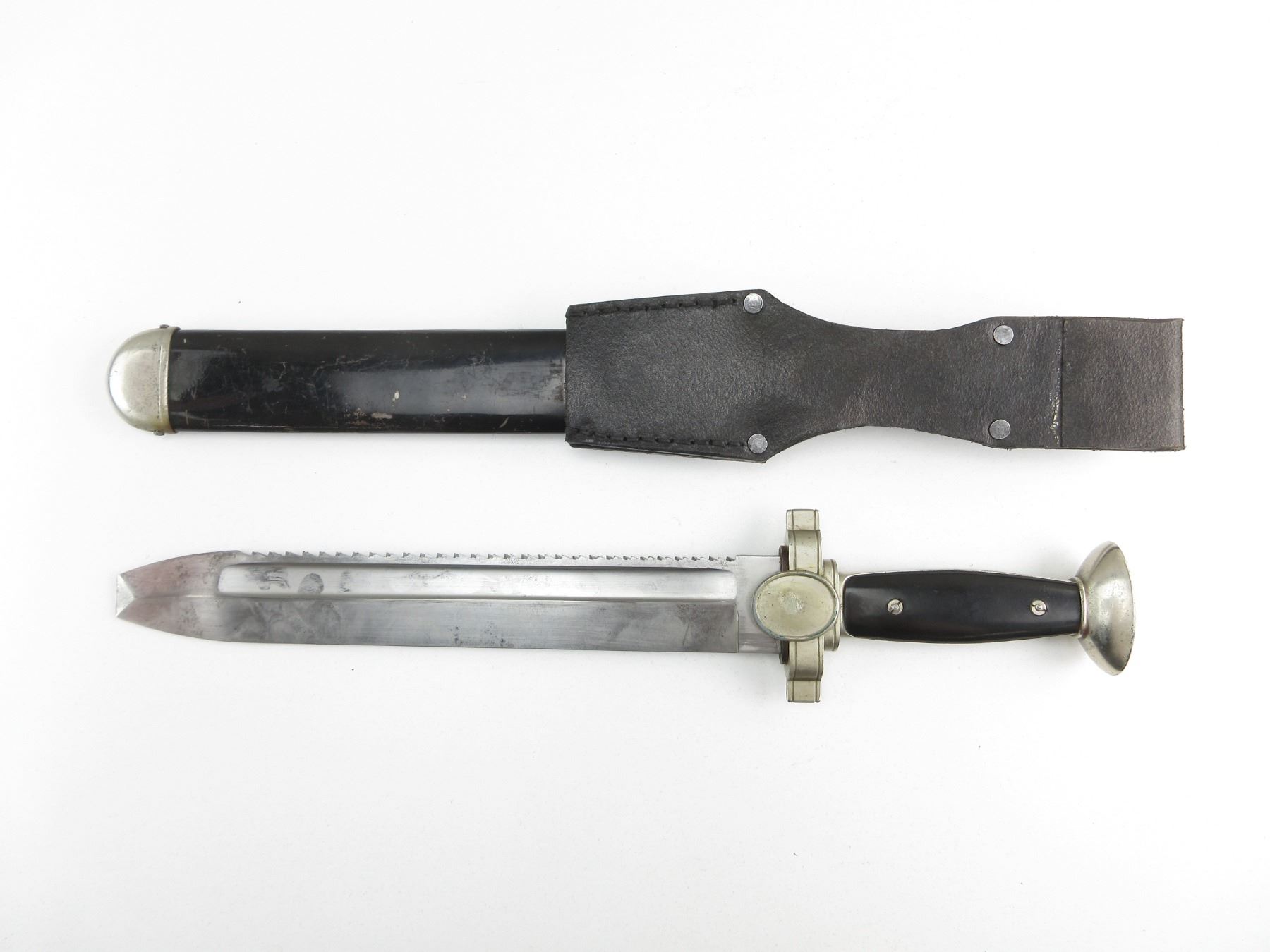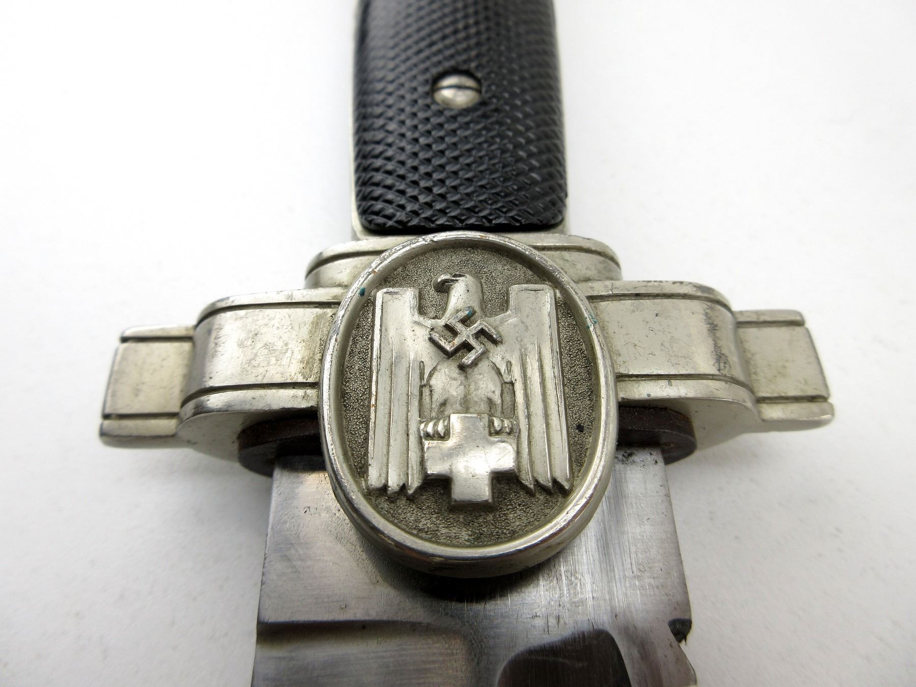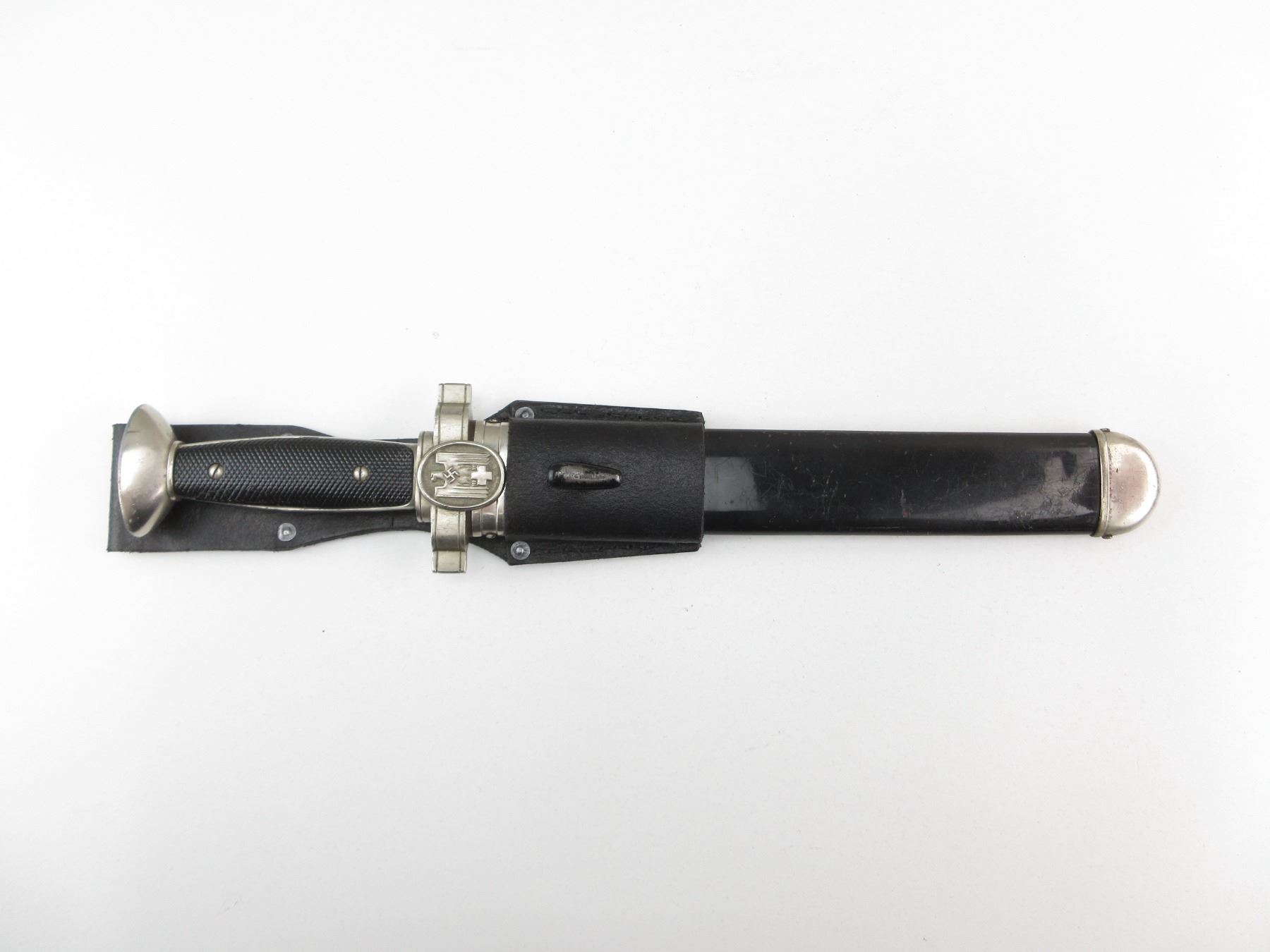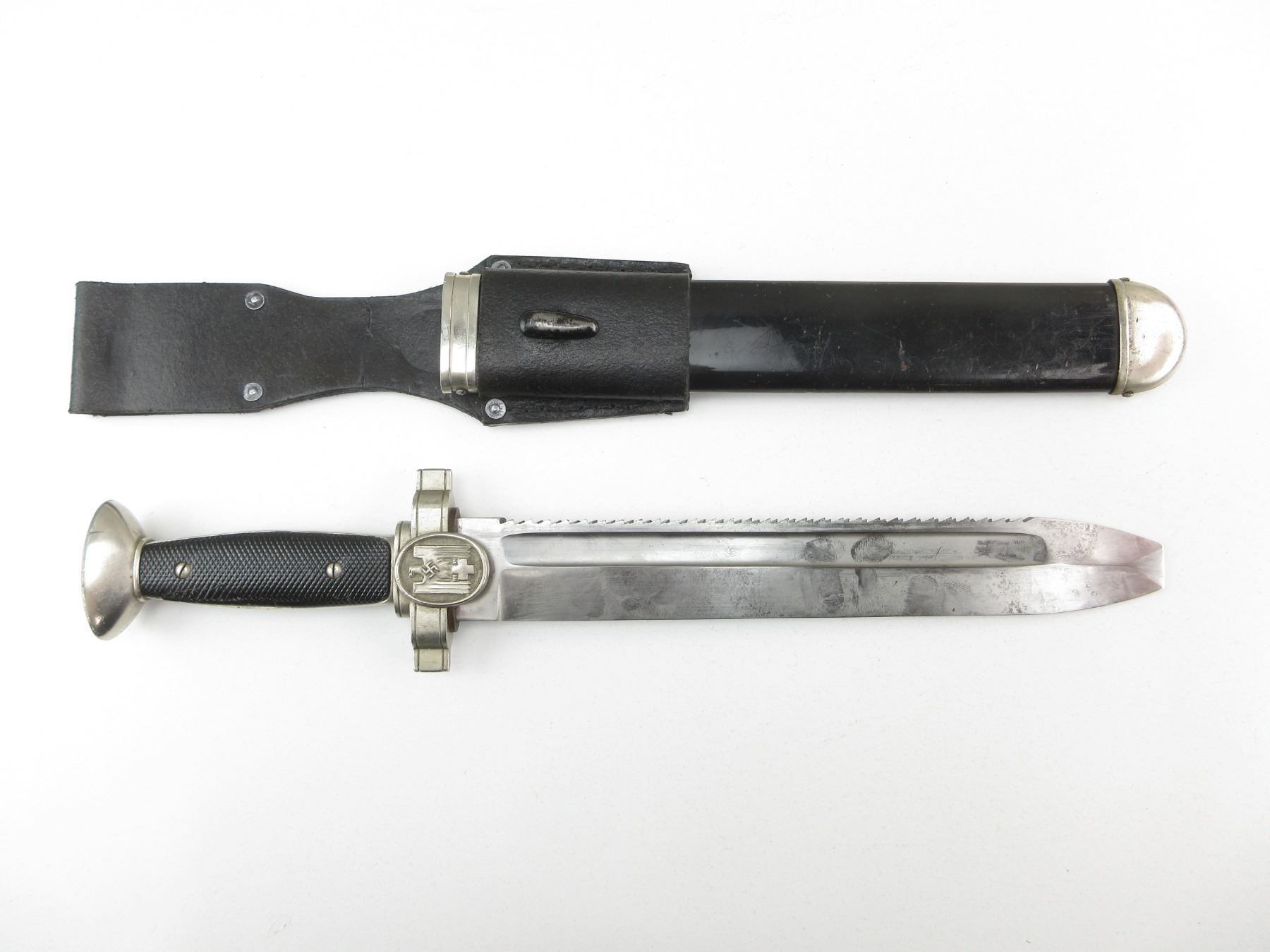 (1) RED CROSS EM HEWER, FOR ENLISTED PERSONNEL OF THE DRK, SAWBACK, BLUNT TIP, NO VISIBLE MARKINGS ON RICASSO / BLADE, STANDING EAGLE WITH SWASTIKA & HOLDING CROSS ON CROSS-GUARD, 2-PIECE BLACK POLYMER GRIP, ONE-SIDE CHECKERED, METAL POMMEL, NO VISIBLE MARKINGS, BLACK PAINTED METAL SCABBARD WITH LEATHER BELT FROG, NO VISIBLE MARKINGS ON SCABBARD OR FROG, BLADE APPROX. 10.5" & OAL APPROX. 15.75". SEE PHOTOS.