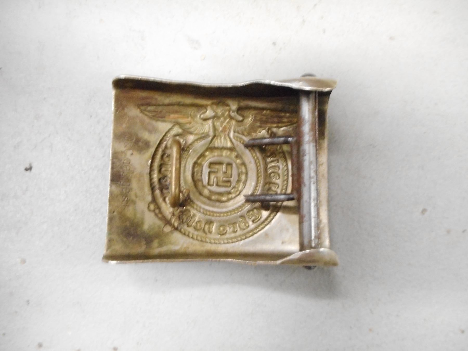 WWII GERMAN S.S. EM/NCO BELT BUCKLE , MFG'D BY O&C GES.GE.SCH. TARNISHED METAL. “THIS ITEM HAS NOT BEEN EXPERTLY AUTHENTICATED, THERE ARE KNOWN REPRODUCTIONS OF THIS ARTICLE SOME EXPERTLY DONE USING ORIGINAL COMPONENTS. OUR DESCRIPTIONS ARE OF VISUAL APPEARANCE AND CONSIGNOR SUPPLIED INFORMATION ON PROVENANCE. PLEASE ASK FOR ADDITIONAL INFORMATION PRIOR TO BIDDING AS NO REFUNDS WILL BE GIVEN OR BID RETRACTIONS ALLOWED. THE EXCEPTION WILL BE IF WE HAVE NOTED THE “ITEM HAS BEEN AUTHENTICATED BY AN EXPERT”.