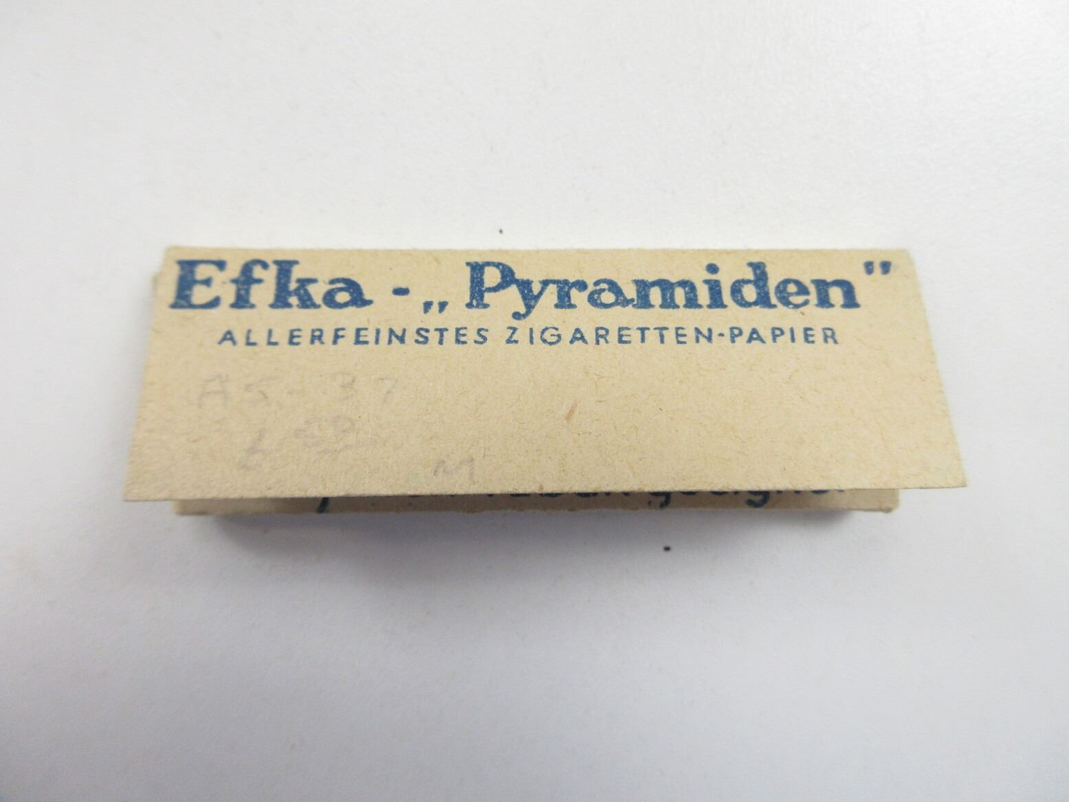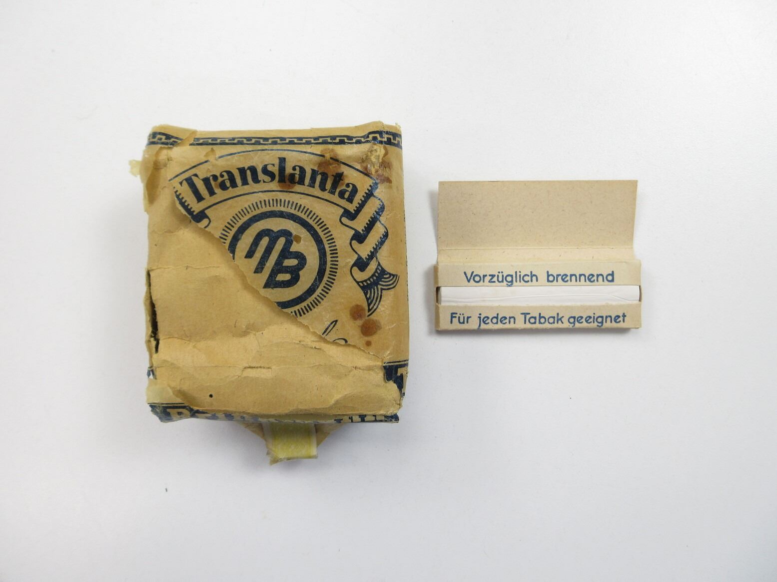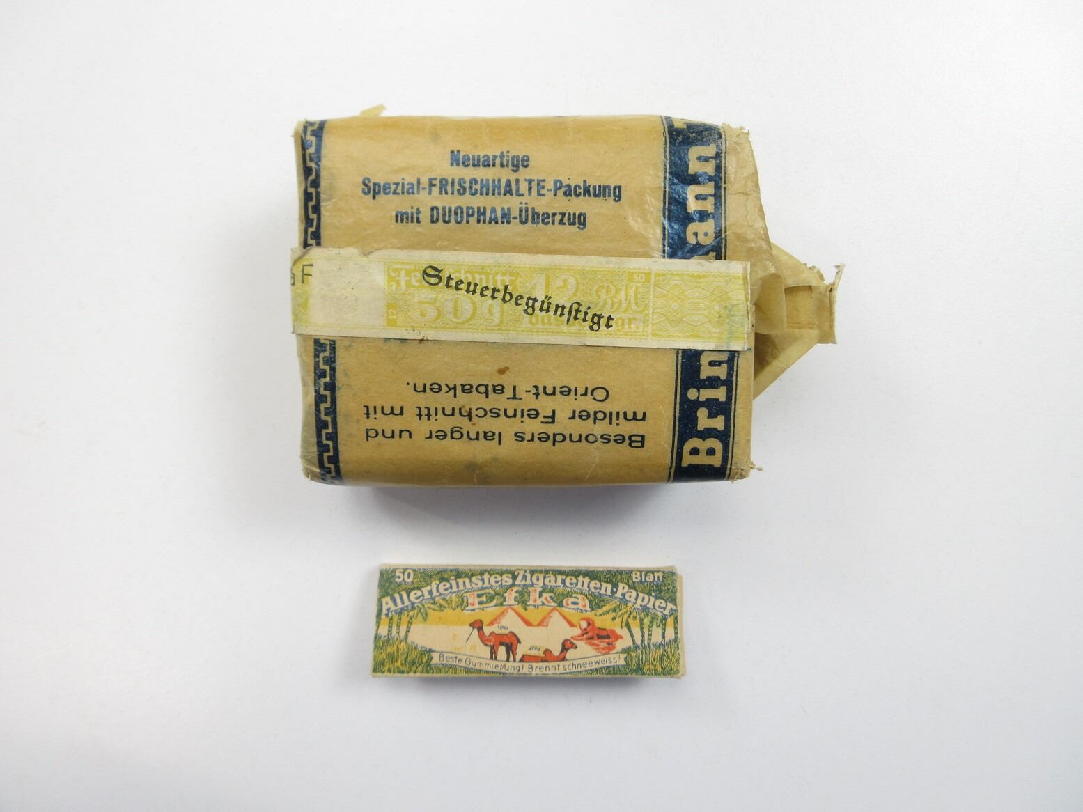 LOT INCLUDES; (1) WWII TRANSLANTA SPEZIAL BRINKMAN TABAK 50 GRAMM PACKAGING (NO TOBACCO), USED BY THE DEUTSCHES REICH, FAINT EAGLE ON TAXSEAL, TAXSEAL WAS COMPLETE PRIOR TO PHOTOGRAPHS, SOME WEAR / TEAR TO PACKAGING, FOUND IN "DEUTSCHE SOLDATEN" BOOK, PAGE 291 / 293 & (1) WWII ERA GERMAN EFKA - PYRAMIDEN ROLLING PAPERS, PAK OF 50, VARIOUS MARKINGS AND COLOURED PICTURE ON ONE SIDE. SEE PHOTOS.