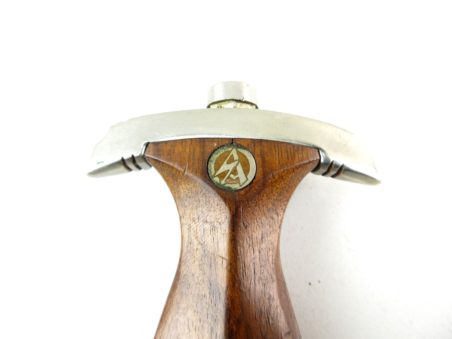 (1) DOUBLE-EDGED DAGGER, RICASSO MARKED: "ADOLF VOLKER, SCHMALKALDEN" (MANUFACTURER), BLADE MARKED: "ALLES FUR DEUTSCHLAND", LEATHER WASHER / BUFFER PAD, CROSS-GUARD MARKED: "SA", WOOD GRIP WITH MEDALLIONS, METAL POMMEL, NO VISIBLE MARKINGS, BROWN PAINTED STEEL SCABBARD WITH SILVER THROAT / TIP, THROAT HAS METAL RING, NO VISIBLE MARKINGS, BLADE APPROX. 8 5/8" & OAL APPROX. 13.5". SEE PHOTOS.