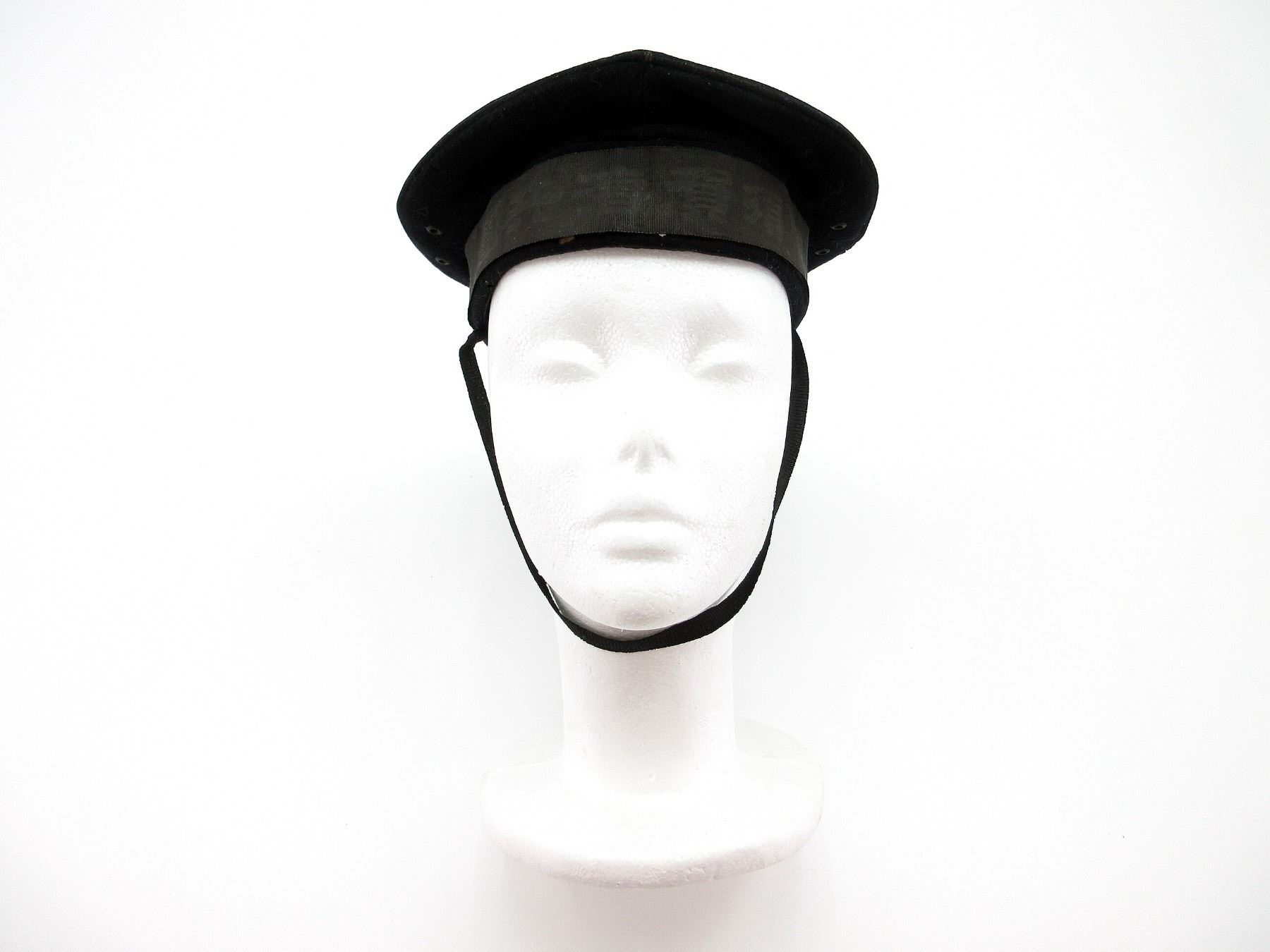 (1) DARK NAVY BLUE / BLACK WOOL "DONALD DUCK" HAT, BLACK CAP TALLY WITH JAPANESE CHARACTERS, ORIGINAL CHIN STRAP, COTTON ISSUE TAG SEWN TO INNER LINING, VARIOUS JAPANESE CHARACTERS ON TAG, SHOWS AGE / WEAR, SOME SMALL HOLES / SLIGHT TEARS, ANCHORS ON BACK HANGING TALLY RIBBONS & (1) STYROFOAM HEAD, FOR DISPLAYING CAP, WIDTH OF HEAD APPROX. 7" & OAL APPROX. 11.75". SEE PHOTOS.