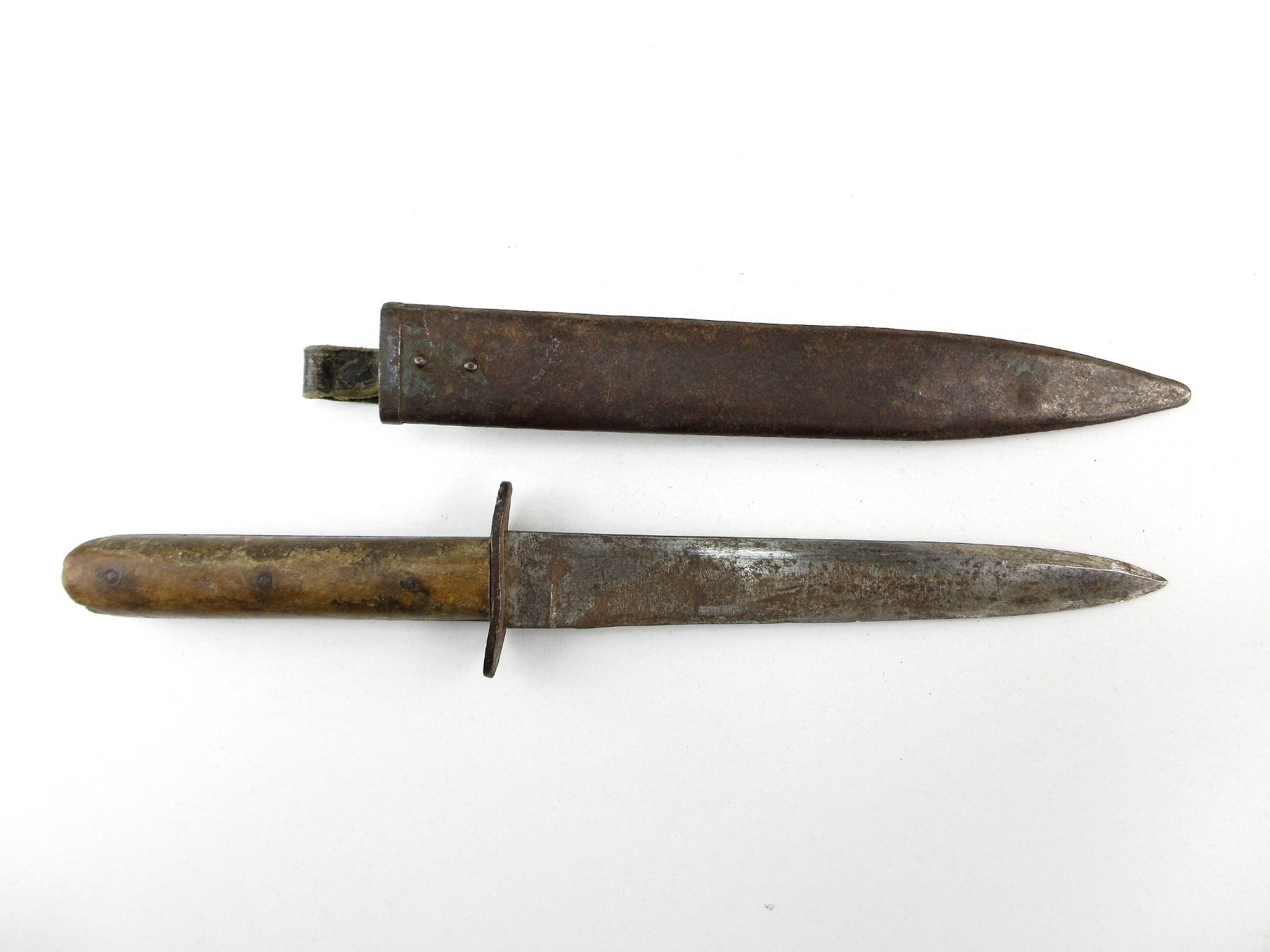 (1) RICASSO MARKED: "R", CURVED CROSS-GUARD, 2-PIECE WOODEN GRIPS, MARKED: "GR", METAL SCABBARD WITH LEATHER TAB, NO VISIBLE MARKINGS, BLADE APPROX. 7 7/8" & OAL APPROX. 12 5/8". SEE PHOTOS.