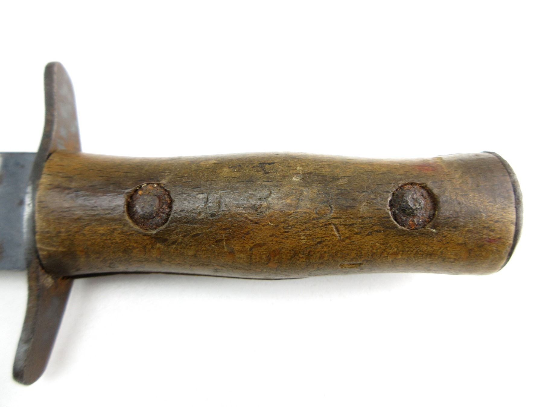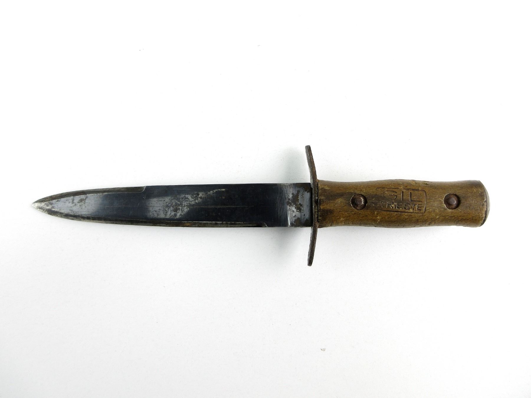 (1) BLUED STEEL BLADE WITH CLIP POINT, RICASSO MARKED: "G.FUGINI, BRESCIA", 2-PIECE RIVETED WOOD GRIPS MARKED: "GIL, TRIESTE", OTHER-SIDE MARKED: "U373", STEEL POMMEL CAP, NO VISIBLE MARKINGS, NO SCABBARD, BLADE APPROX. 6 5/8" & OAL APPROX. 10.5". SEE PHOTOS.
