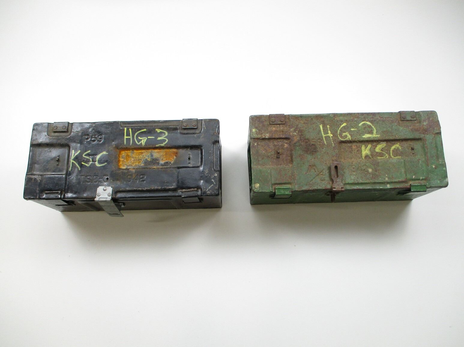 WWII METAL AMMO TIN LOT, LOT INCLUDES; (1) GREEN PAINTED WITH METAL LATCHES & HANDLES, MARKED: "P59, MKII, M/C. 1942" & (1) BLACK PAINTED WITH METAL LATCHES & HANDLES, MARKED: "P59, MKII, T.S.C.-C. 1942". EACH APPROX. 19" H X 8 1/8" W X 7.5" H. SEE PHOTOS.