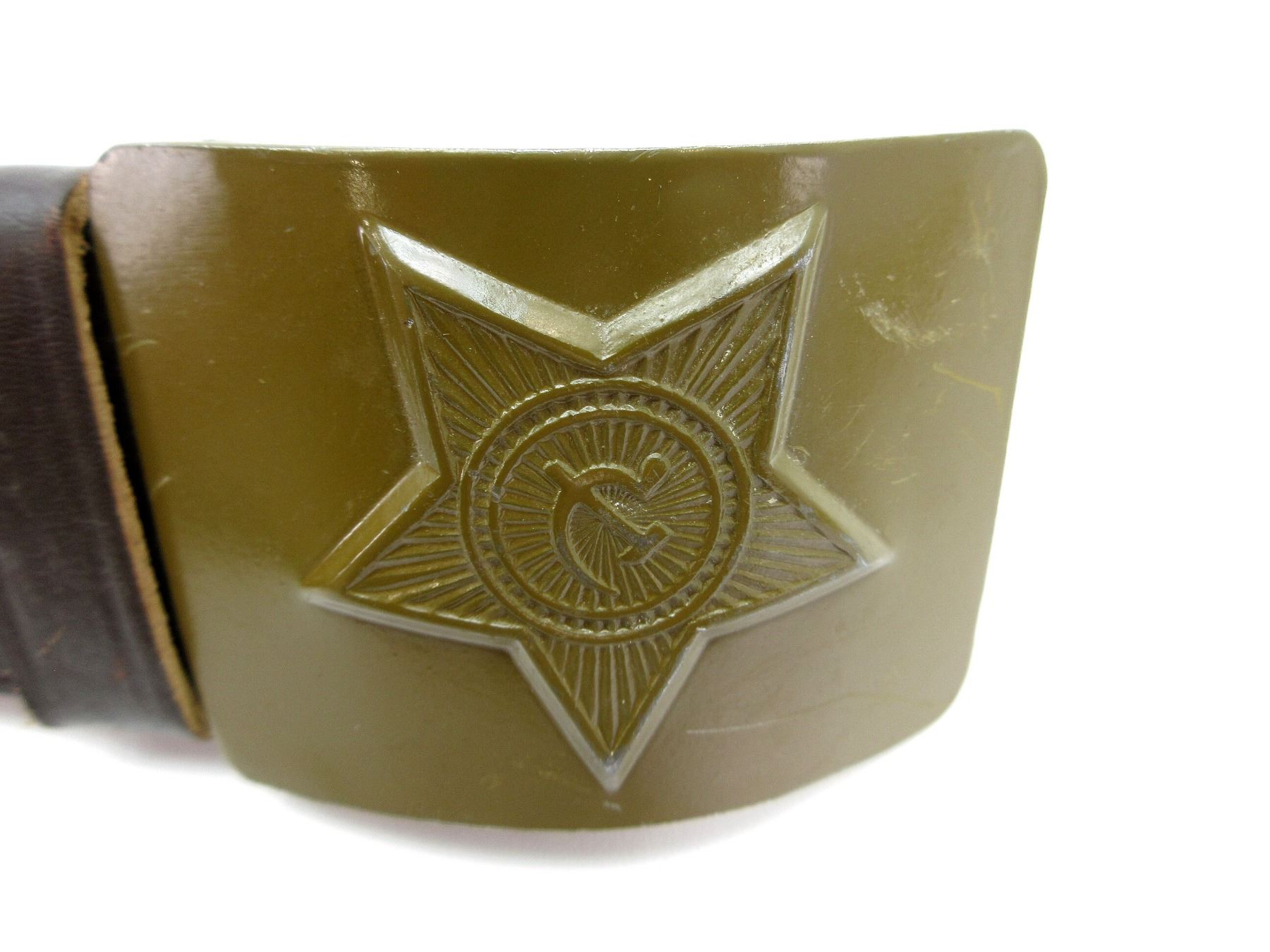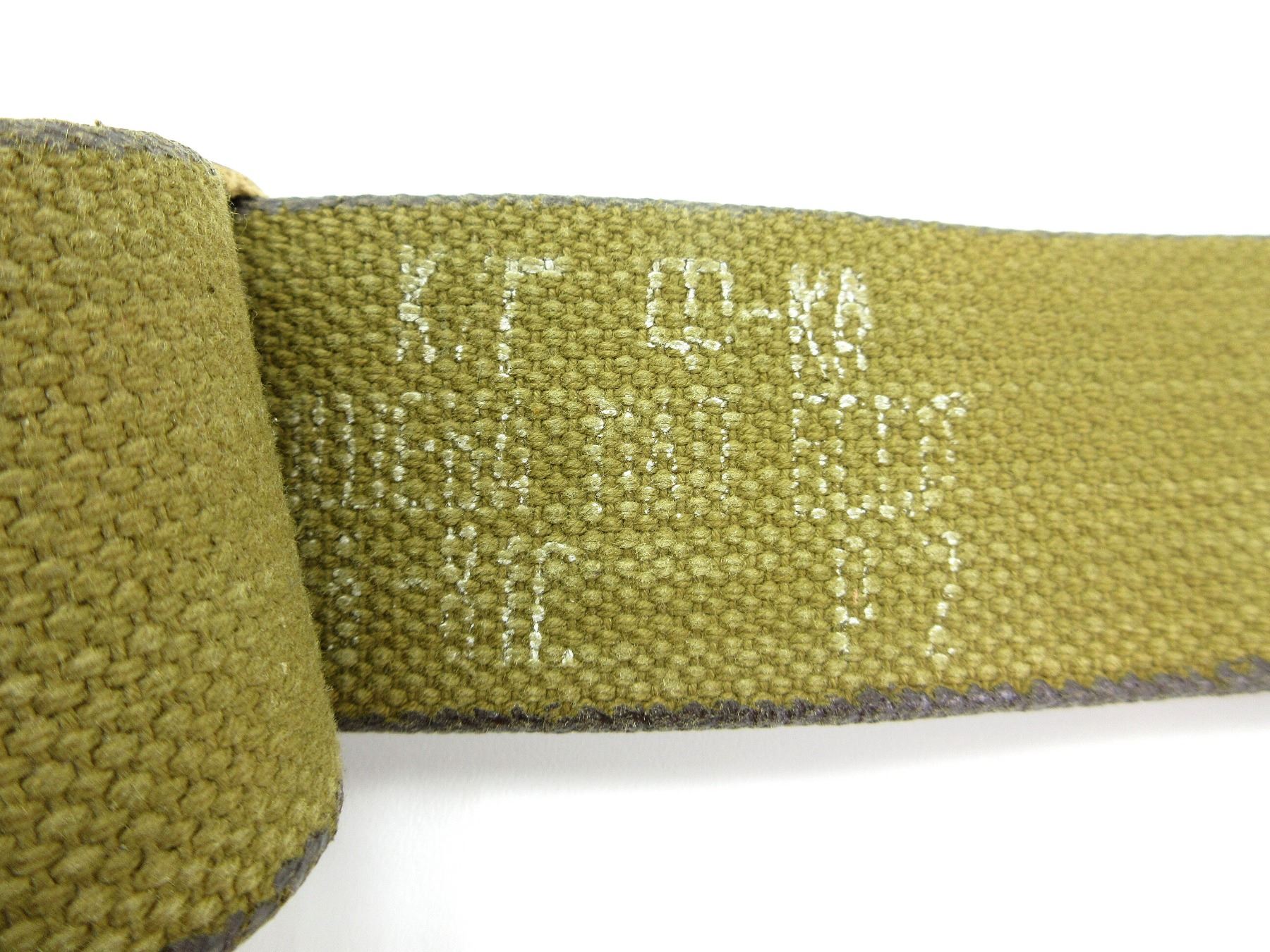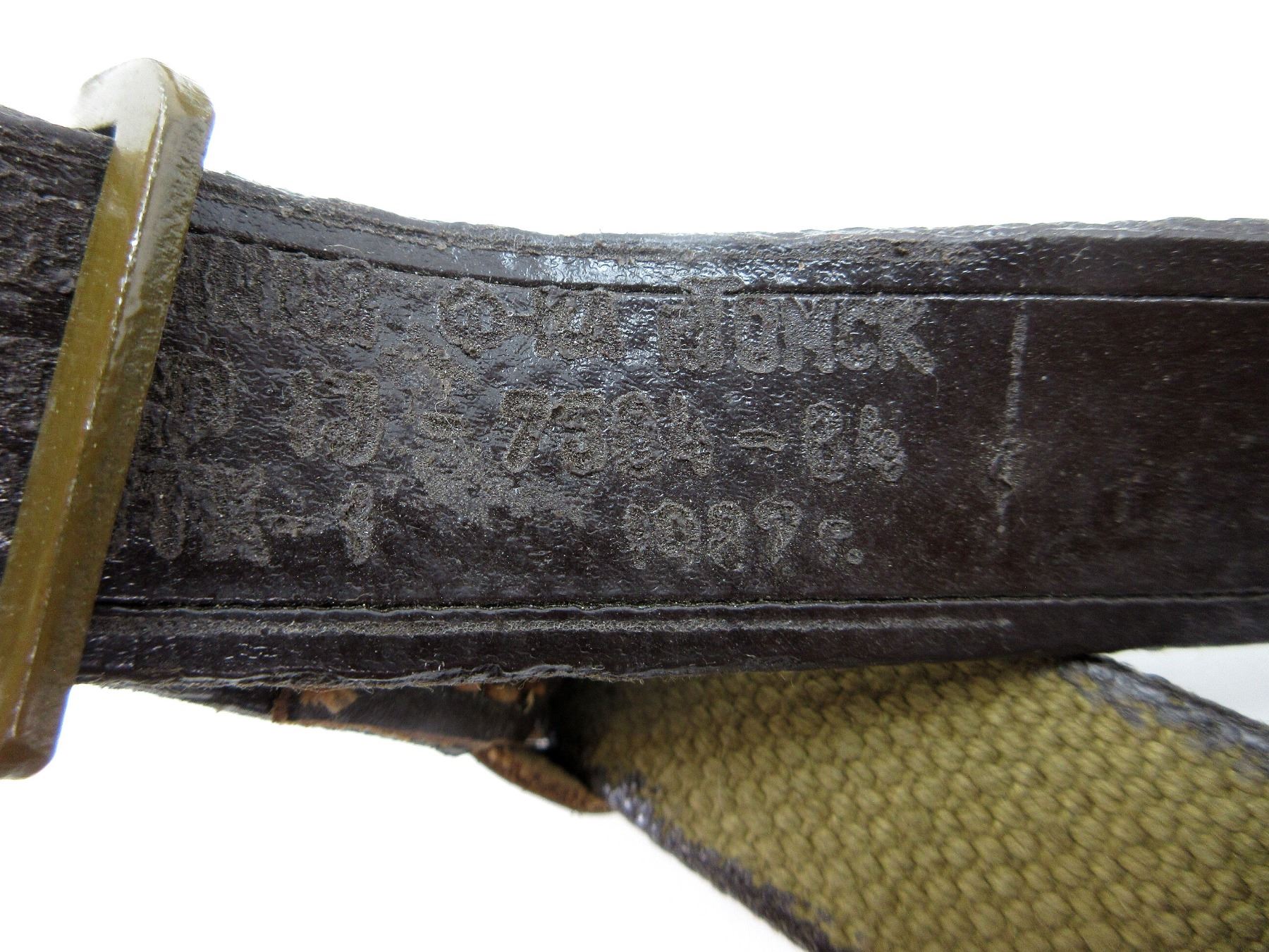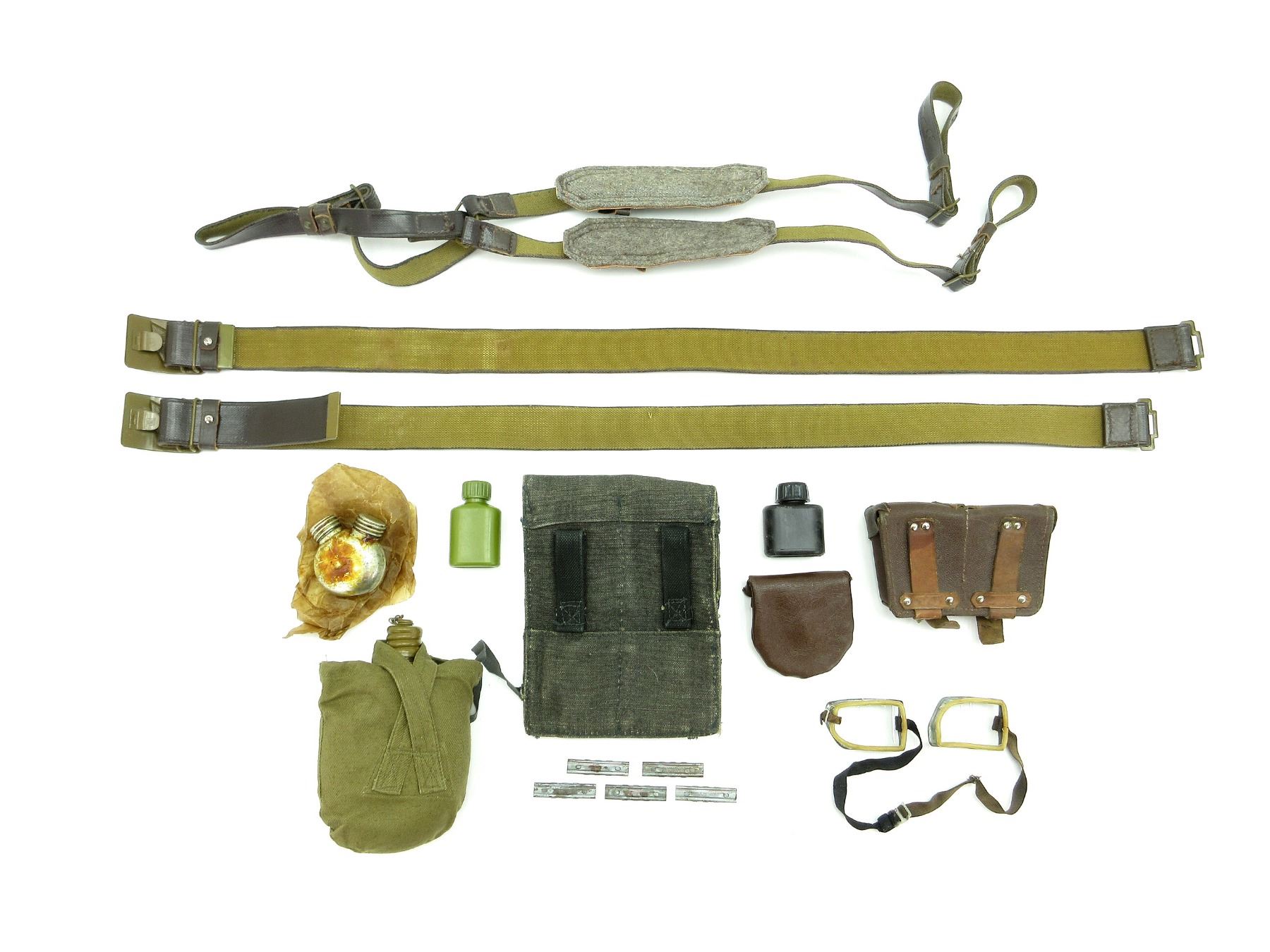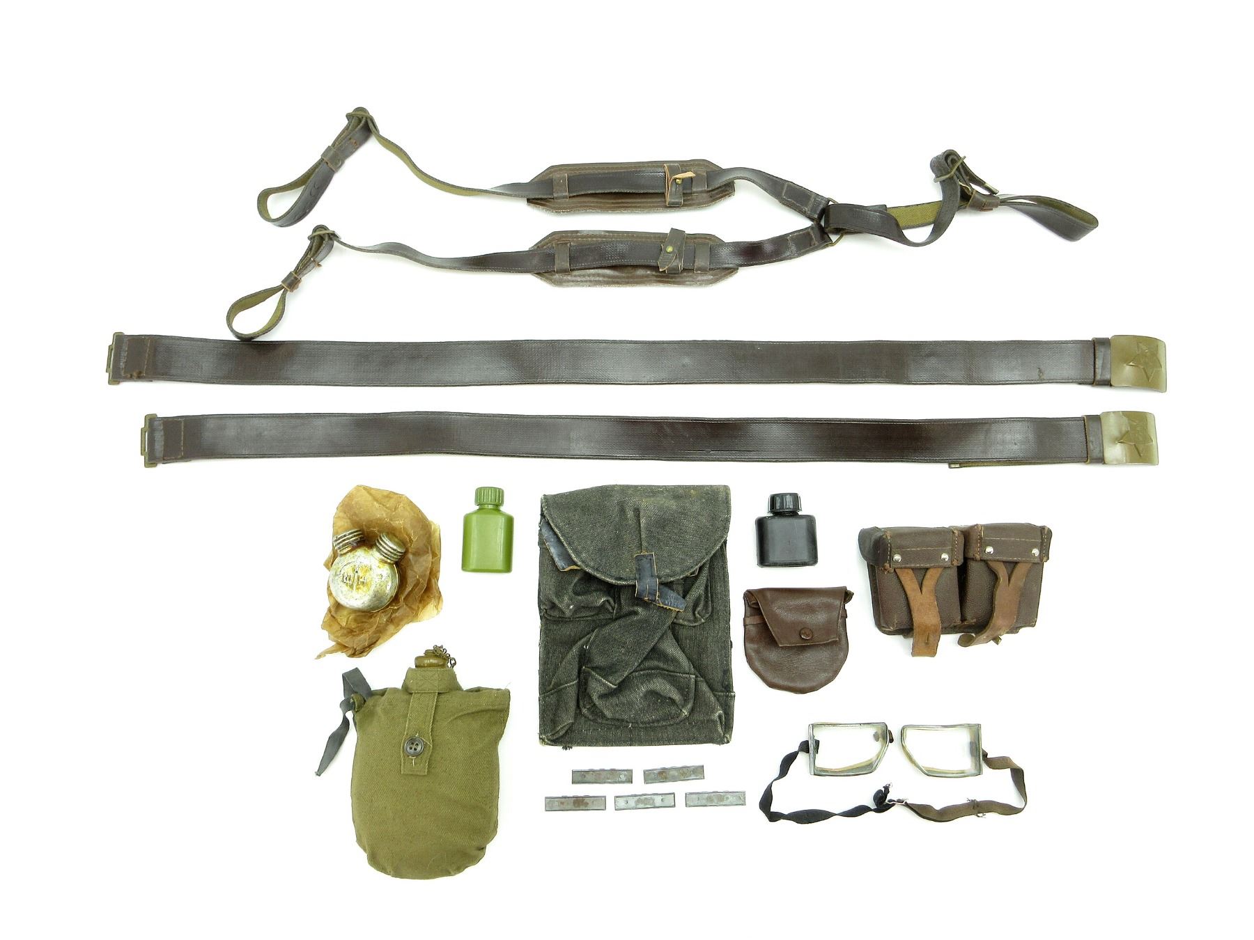 LOT INCLUDES; (5) POST-WWII CZECH 7.92X57MM MAUSER STRIPPER CLIPS, 5-RND, STEEL, VARIOUS MARKINGS, (1) WWII SOVIET MOSIN NAGANT RIFLE AMMO POUCH, VARIOUS INK STAMP MARKINGS, (1) WWII SOVIET MOSIN NAGANT RIFLE OILER, GREEN PLASTIC, NO VISIBLE MARKINGS, (1) POST-WWII SOVIET RPK MACHINE GUN MAGAZINE POUCH WITH OILER, BLACK CANVAS, INK STAMP MARKING, (1) POST-WWII SOVIET WATER CANTEEN WITH CARRIER, BROWN PAINTED CANTEEN MARKED: "1974" & VARIOUS OTHER MARKINGS, BROWN CANVAS CARRIER WITH VARIOUS INK STAMP MARKINGS, (2) POST-WWII SOVIET ENLISTED PERSONNEL FIELD BELT & BUCKLE WITH SUSPENDERS, BROWN PAINTED CANVAS BELTS, INK STAMP MARKINGS ON BELTS, STAR WITH HAMMER & SICKLE SYMBOL ON BUCKLES & VARIOUS OTHER MARKINGS, BELTS OAL APPROX. 39" & 41", BROWN PAINTED CANVAS SUSPENDERS, NO VISIBLE MARKINGS, (1) POST-WWII UNKNOWN EASTERN BLOC RIFLE OILER WITH LEATHER CARRIER, VARIOUS MARKINGS ON OILER, FAINT INK STAMP MARKING ON CARRIER & (1) PAIR OF UNKNOWN GOGGLES, MARKED: "CESCO", GLASSES LENSES INTACT, HEAD STRAP. SEE PHOTOS.
