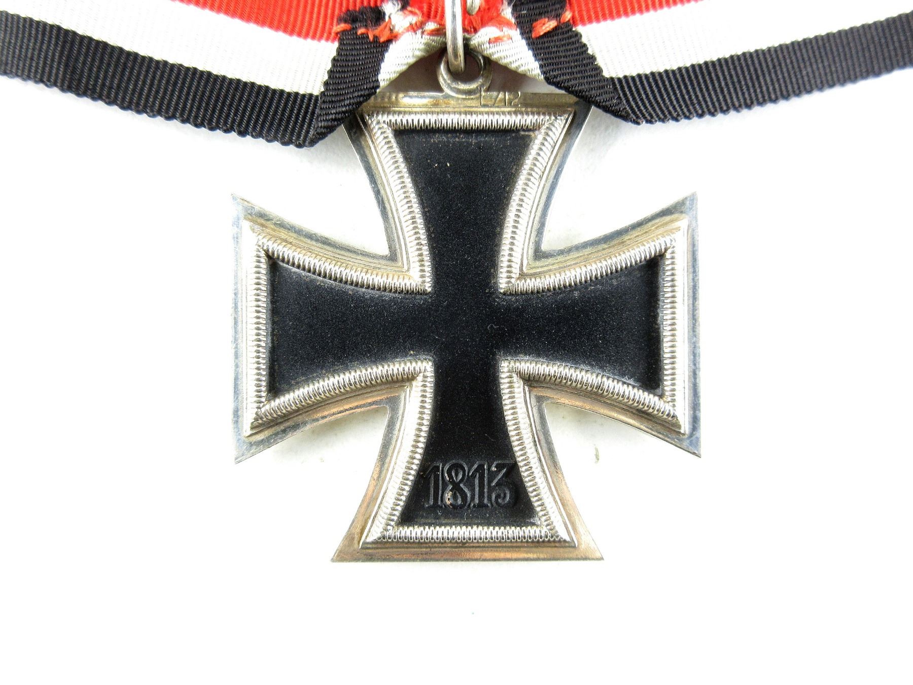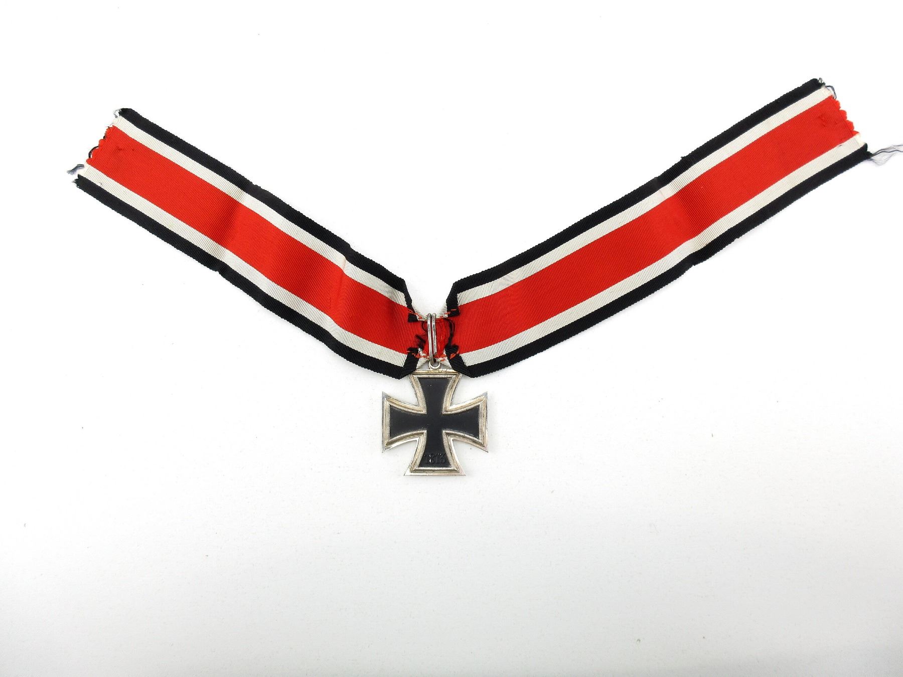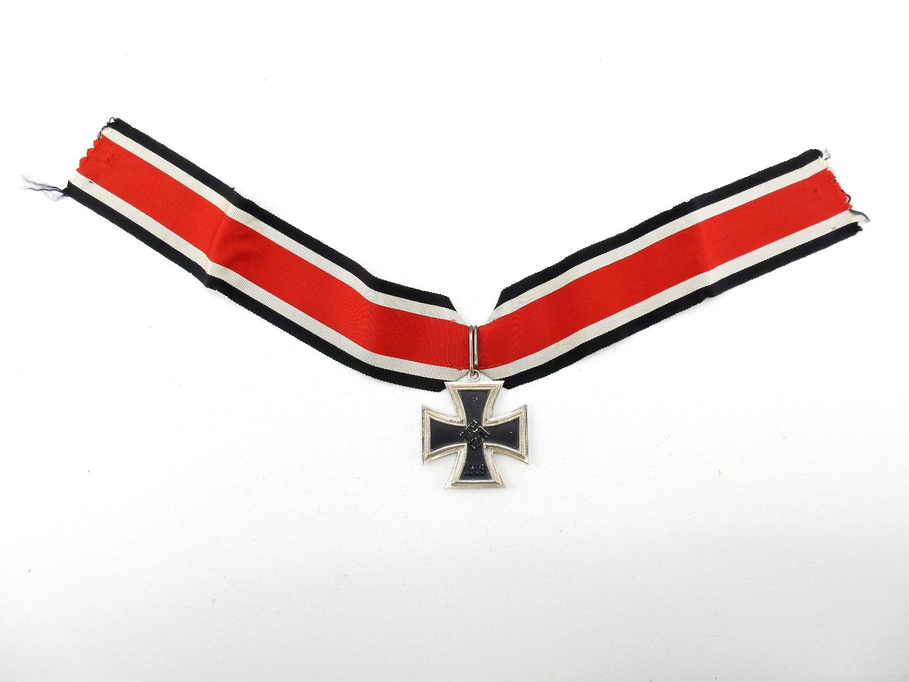 (1) KNIGHT'S CROSS OF THE IRON CROSS WITH RIBBON, MEDAL MARKED: SWASTIKA OVER "1939", OTHER-SIDE MARKED: "1813", 3-PIECE CONSTRUCTION, MAGNETIC CORE, VISIBLE JOINT LINE AROUND EDGE, PAPER FITS UNDER CENTER EDGE, MEDAL EDGE MARKED: "L/12", RING MARKED: "900" (SILVER COIN PROOF MARK ?), CROSS APPROX. 49MM X 49MM, RIBBON DOESN'T APPEAR TO GLOW UNDER BLACK LIGHT. SEE PHOTOS.